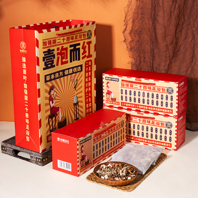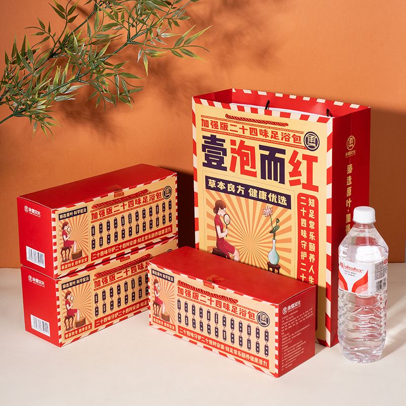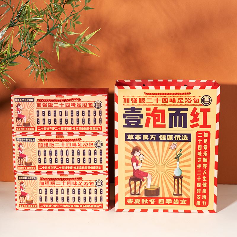 礼袋规格:350*265*95mm 礼盒规格:260*110*90mm 产品配置:30g*10包*3盒 推荐理由: 送礼送健康,客户都喜欢,泡脚,臻原叶,真养生,加强版二十四味足浴包。原叶加强版二十四味足浴包,精选益母草、红花、艾叶、川芎、透骨草、王不留行、花椒、丹参、党参、蛇床子、虎杖、白芍、当归、鸡血藤、老姜、牛膝、独活、陈皮、路路通、青蒿、苦参、广霍香、黄芪、地黄二十四味中草药,真材实料,科学配比,养生效果更卓著。 独特民国风设计,喜庆的同时,尽现国货经典。二十四味草本守护客户每个二十四小时的安康。