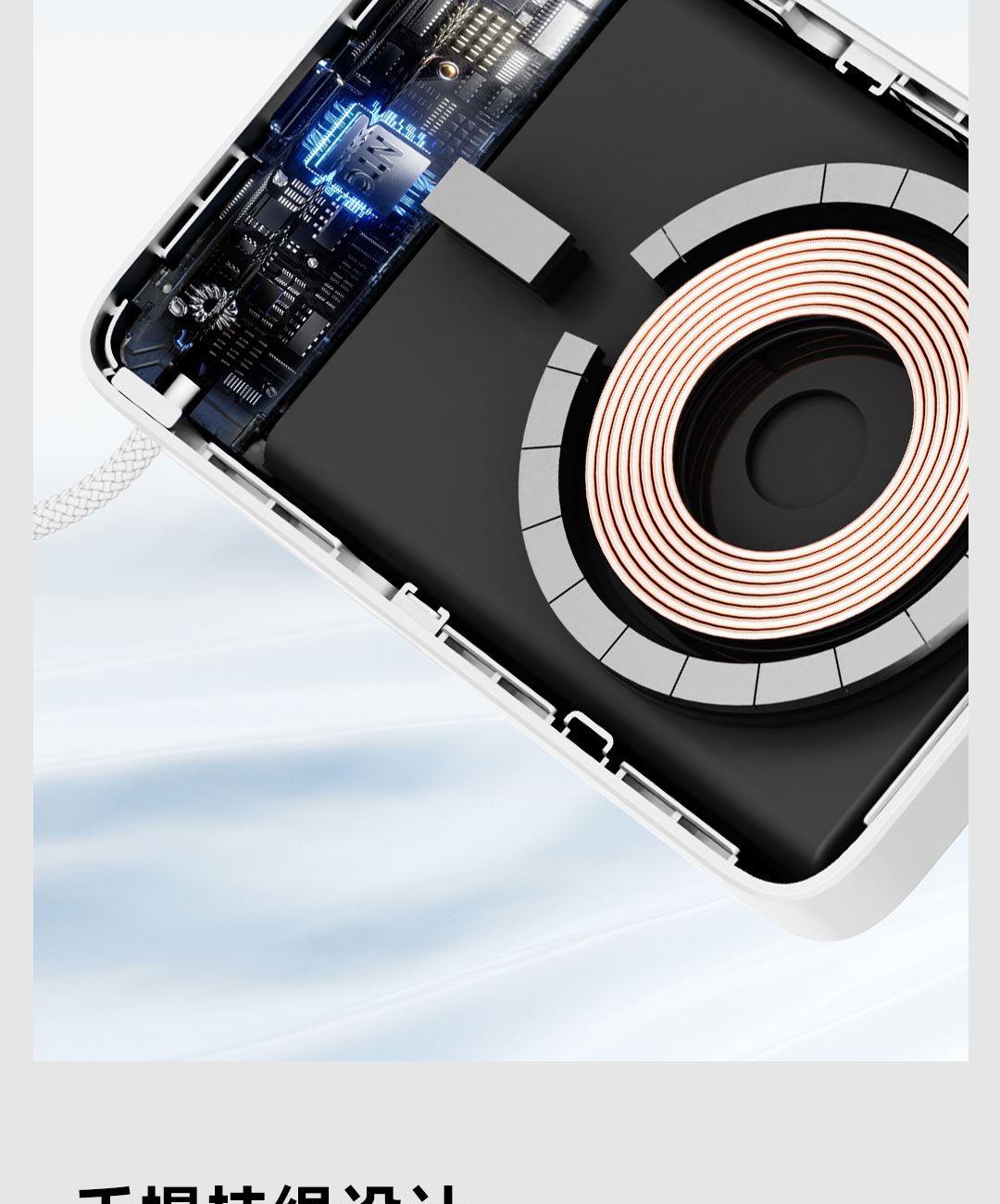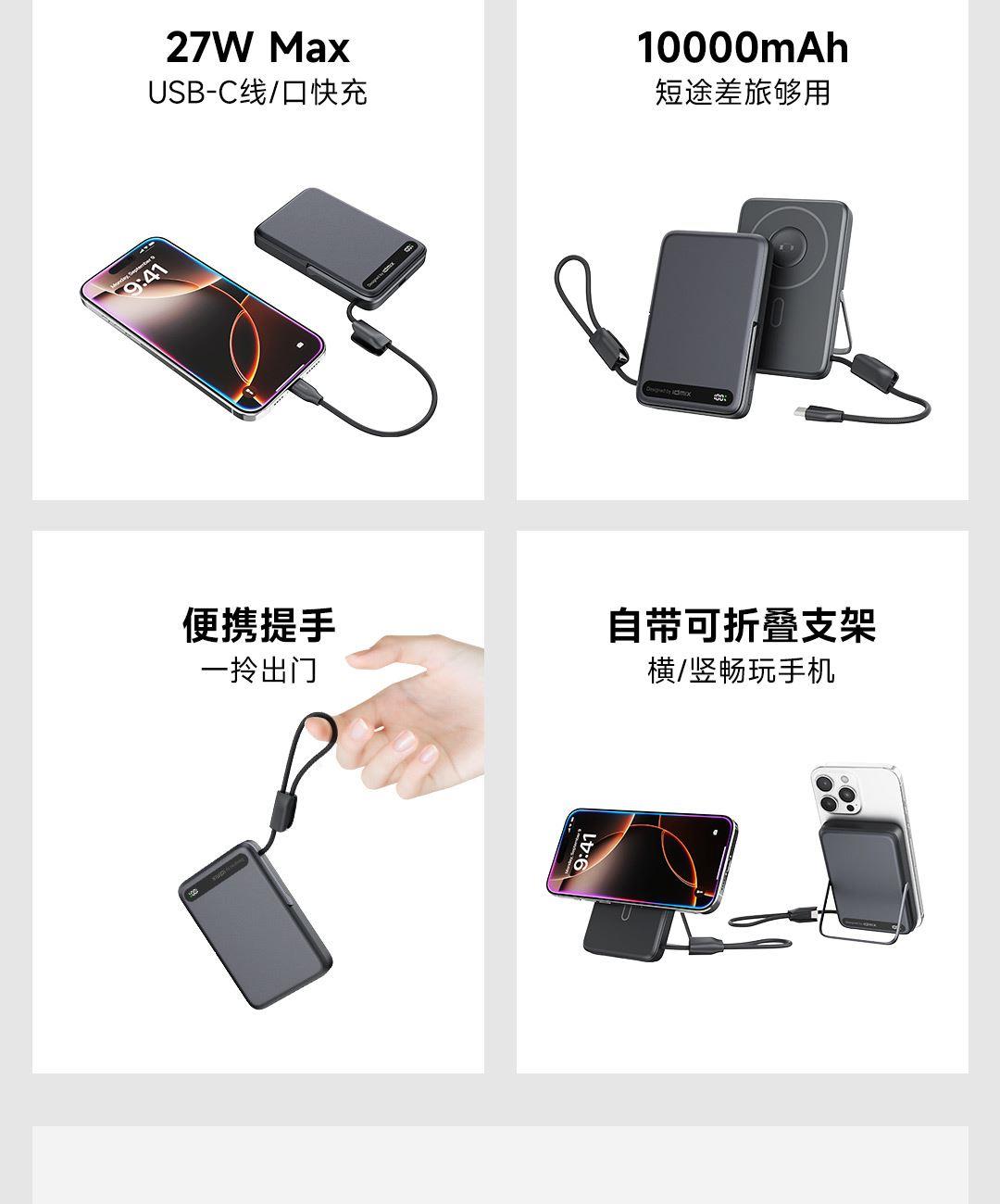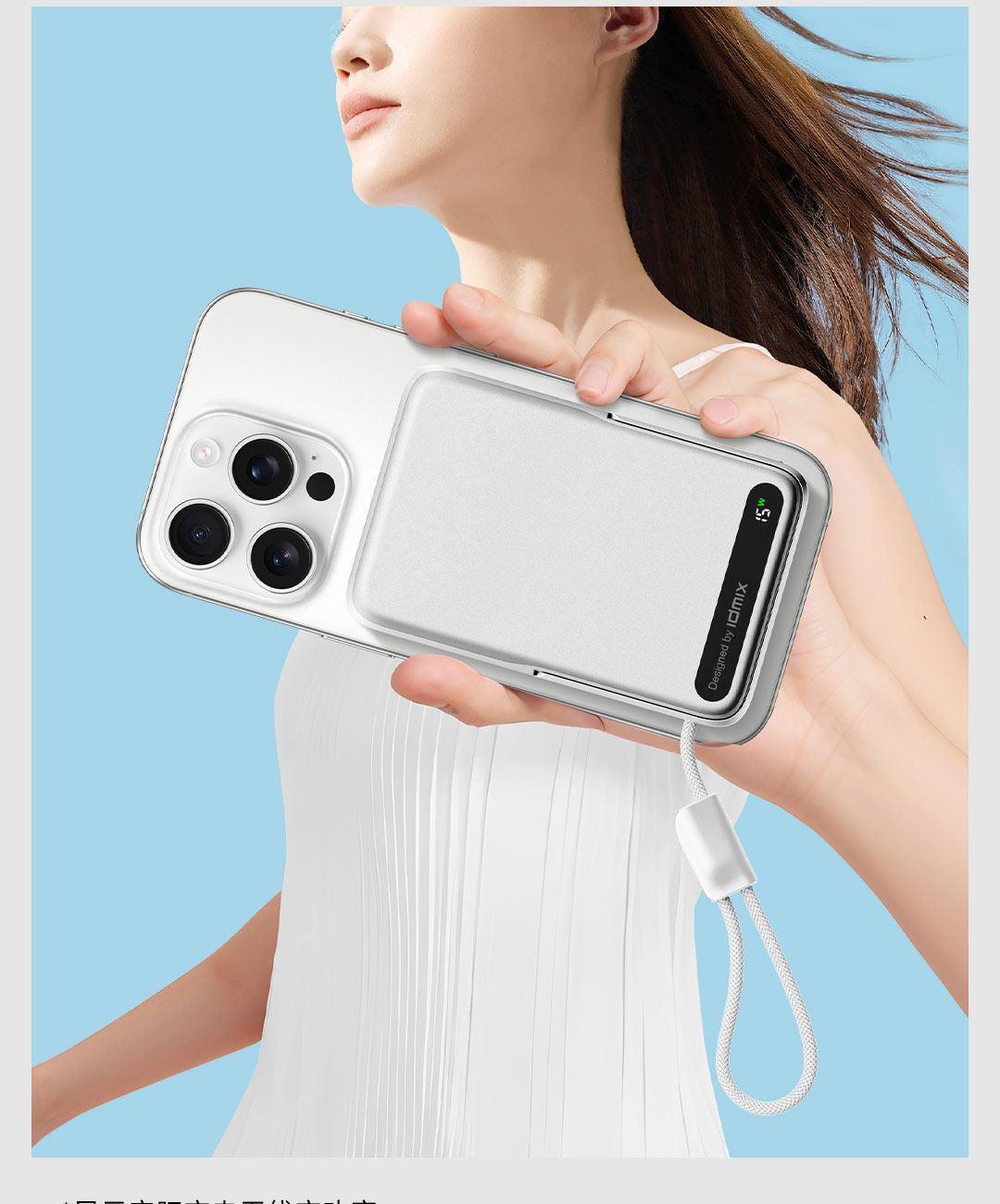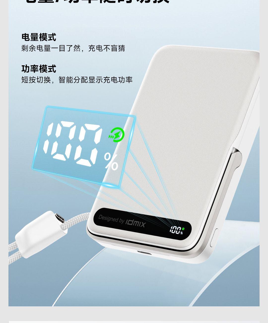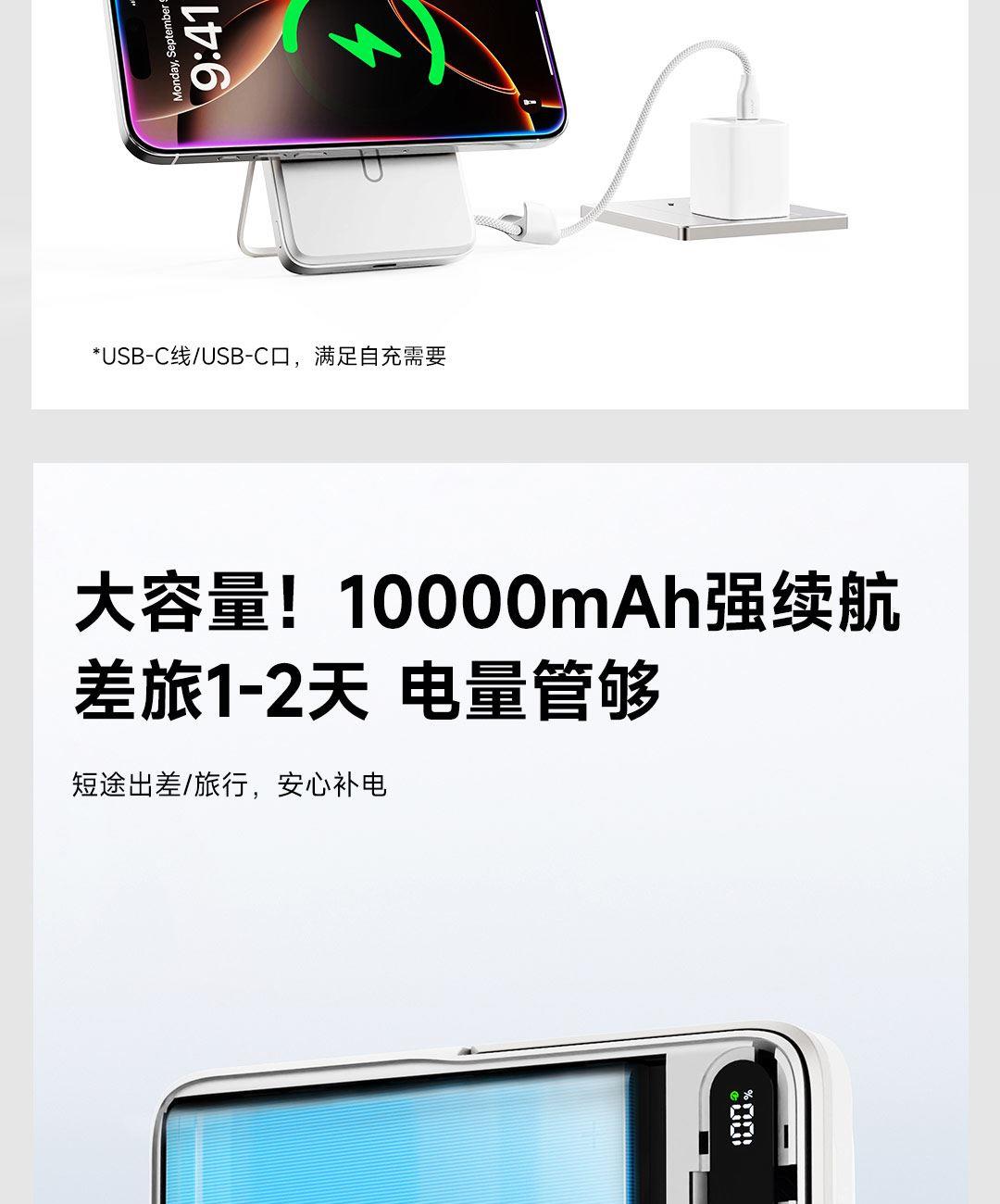 PD27W快充线+15W强力磁吸无线输出+10000mAh容量+可折叠支架 荣获2025年德国红点奖。支持Apple Watch系列充电 智能液晶屏电量显示,快充指示。剩余电量不用猜,电量可见,智能分配显示充电功率 航空级铝合金材质,卡片式外观设计,轻薄搭档,磁吸一贴闪充 内置10000mAh 聚合物电芯,轻薄小巧,人体工学设计,单手持握也轻松 内置16颗强力磁铁,N52强劲吸力,与IPhone 贴合,轻松吸附,狂甩不掉 磁吸无线充输出功率可达15W,磁吸无线充模式兼容iWatch手表系列充电 Type-C线输出支持PD27W,Type-C线与Type-C口输入、输出双向快充,充电放电更省时, 支持FOD异物检测,智能识别金属等异物,自动断电,确保使用安全 金属折叠支架可桌面边充电边看视频娱乐和学习使用 符合新国标安全认证,AI控温系统,NTC实时温控调节,双重创新散热技术,低温快充不伤机 尺寸:109*71*16.1mm 重量:约209g 顏色:浅银白、深银灰