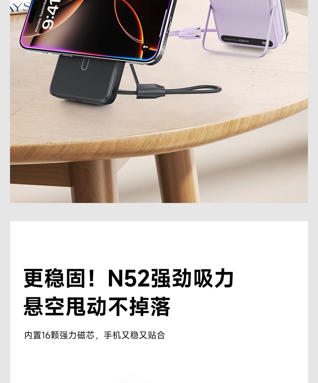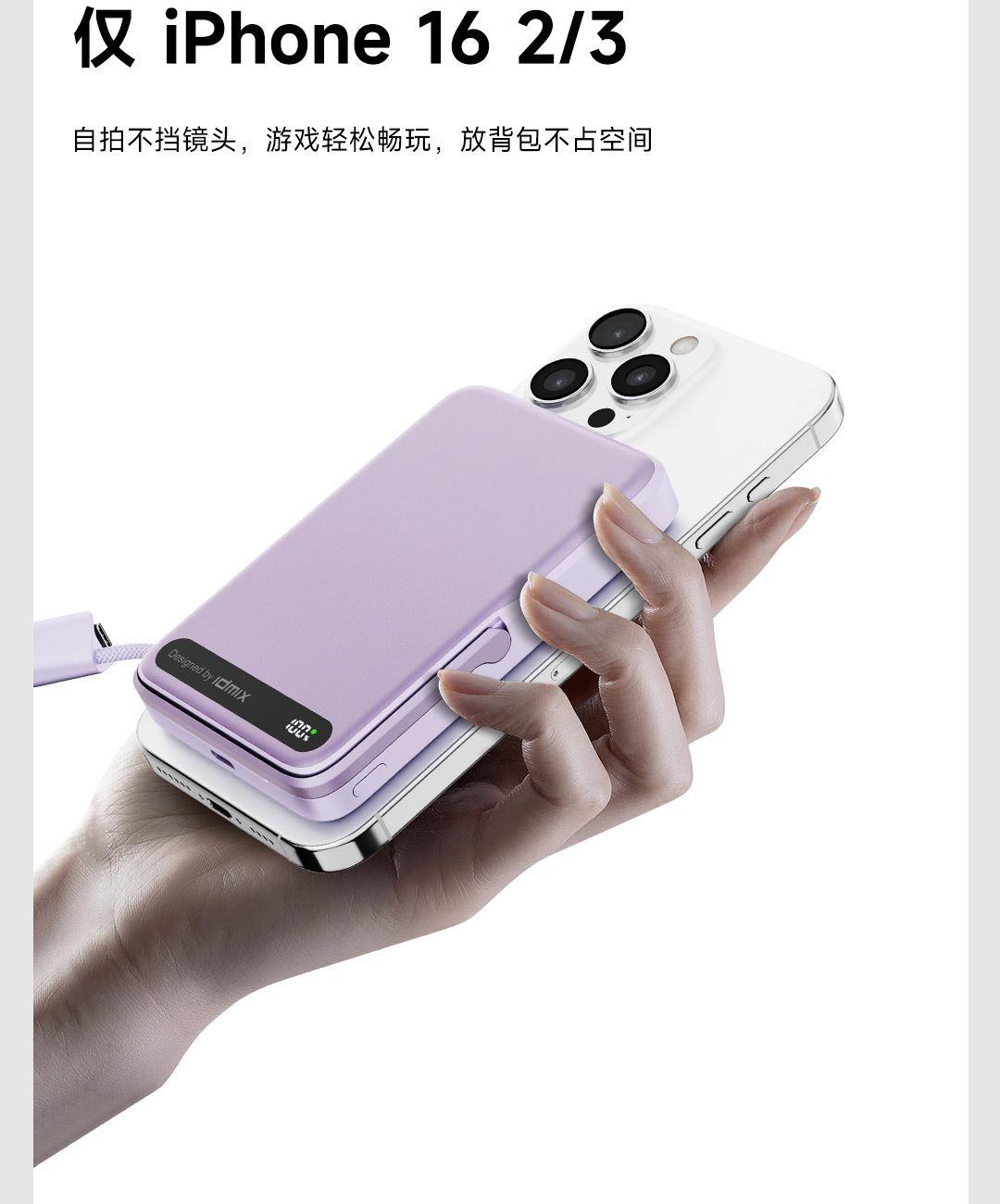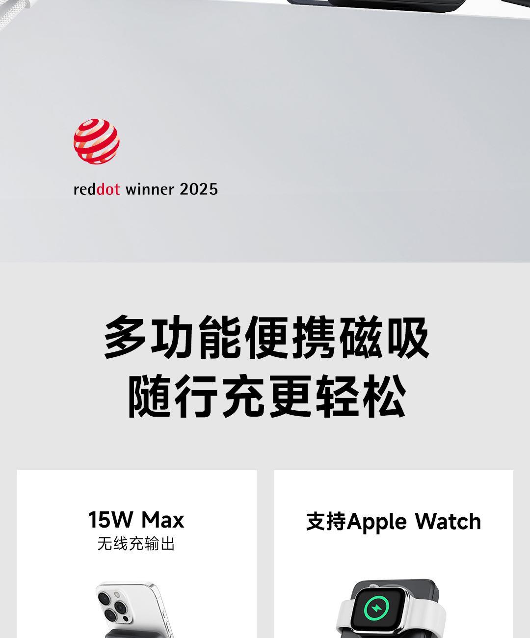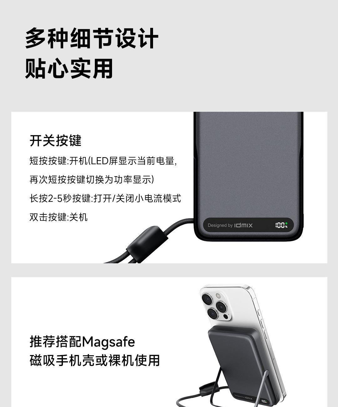 PD27W快充线+15W强力磁吸无线输出+10000mAh容量+可折叠支架 荣获2025年德国红点奖。支持Apple Watch系列充电 智能液晶屏电量显示,快充指示。剩余电量不用猜,电量可见,智能分配显示充电功率 航空级铝合金材质,卡片式外观设计,轻薄搭档,磁吸一贴闪充 内置10000mAh 聚合物电芯,轻薄小巧,人体工学设计,单手持握也轻松 内置16颗强力磁铁,N52强劲吸力,与IPhone 贴合,轻松吸附,狂甩不掉 磁吸无线充输出功率可达15W,磁吸无线充模式兼容iWatch手表系列充电 Type-C线输出支持PD27W,Type-C线与Type-C口输入、输出双向快充,充电放电更省时, 支持FOD异物检测,智能识别金属等异物,自动断电,确保使用安全 金属折叠支架可桌面边充电边看视频娱乐和学习使用 符合新国标安全认证,AI控温系统,NTC实时温控调节,双重创新散热技术,低温快充不伤机 尺寸:109*71*16.1mm 重量:约209g 顏色:浅银白、深银灰
