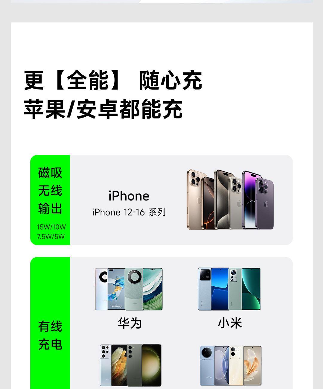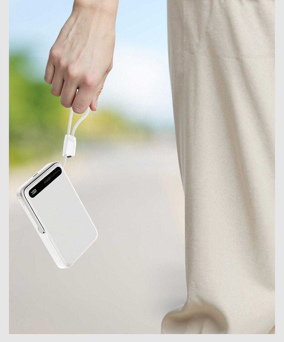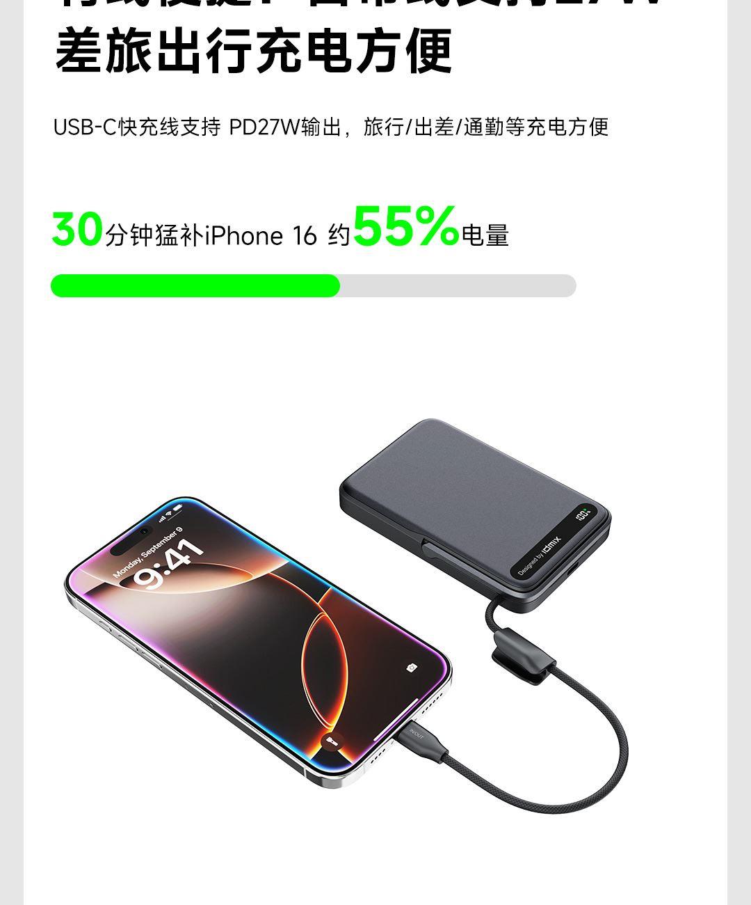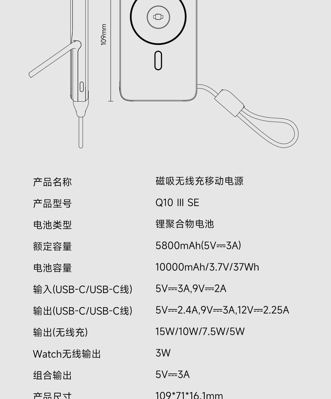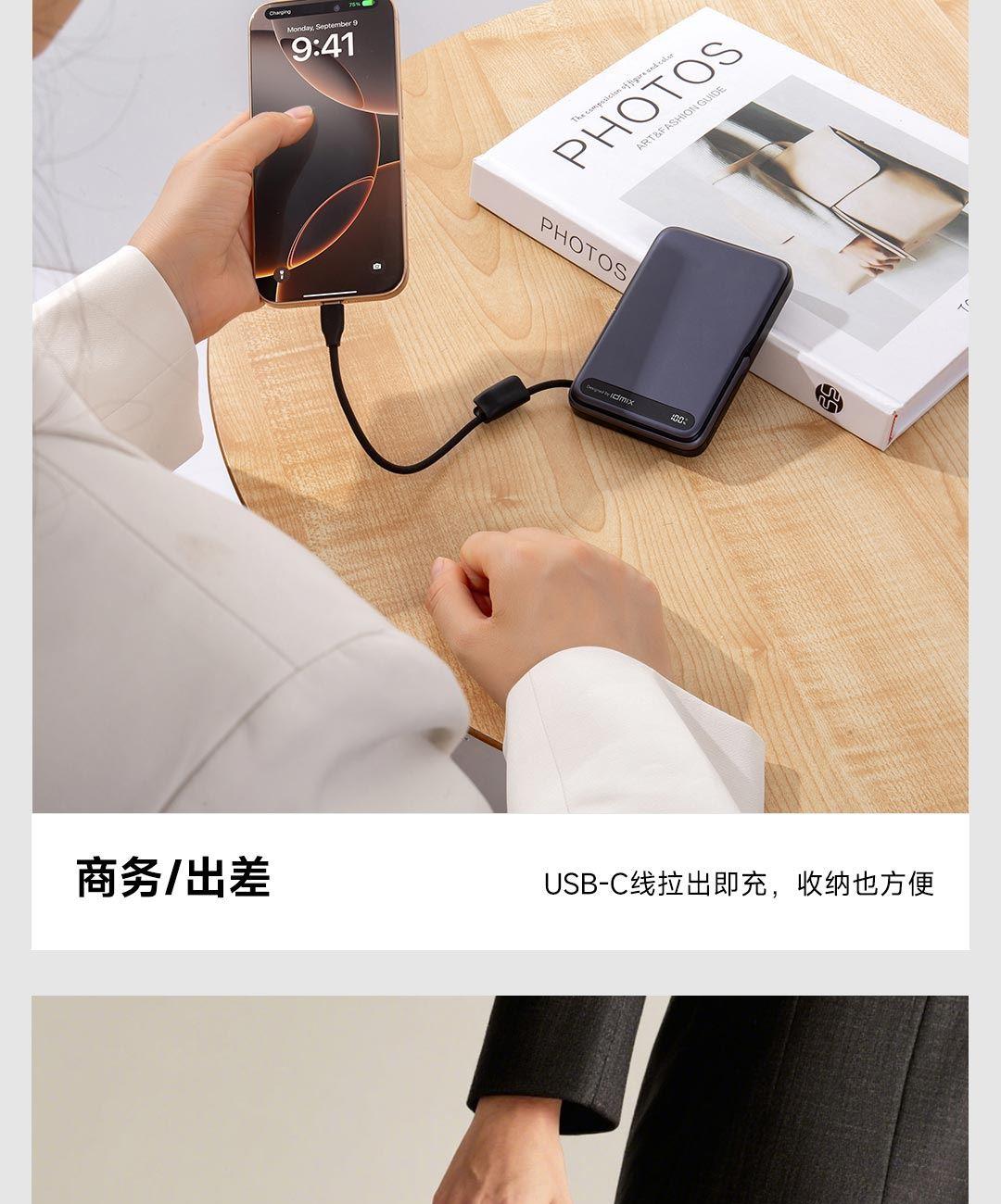 PD27W快充线+15W强力磁吸无线输出+10000mAh容量+可折叠支架 荣获2025年德国红点奖。支持Apple Watch系列充电 智能液晶屏电量显示,快充指示。剩余电量不用猜,电量可见,智能分配显示充电功率 航空级铝合金材质,卡片式外观设计,轻薄搭档,磁吸一贴闪充 内置10000mAh 聚合物电芯,轻薄小巧,人体工学设计,单手持握也轻松 内置16颗强力磁铁,N52强劲吸力,与IPhone 贴合,轻松吸附,狂甩不掉 磁吸无线充输出功率可达15W,磁吸无线充模式兼容iWatch手表系列充电 Type-C线输出支持PD27W,Type-C线与Type-C口输入、输出双向快充,充电放电更省时, 支持FOD异物检测,智能识别金属等异物,自动断电,确保使用安全 金属折叠支架可桌面边充电边看视频娱乐和学习使用 符合新国标安全认证,AI控温系统,NTC实时温控调节,双重创新散热技术,低温快充不伤机 尺寸:109*71*16.1mm 重量:约209g 顏色:浅银白、深银灰