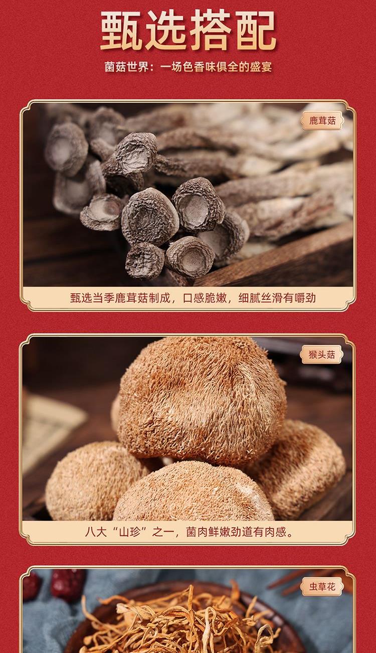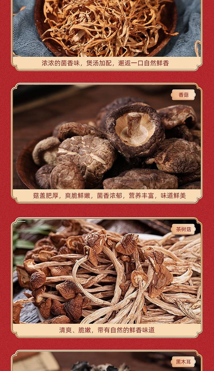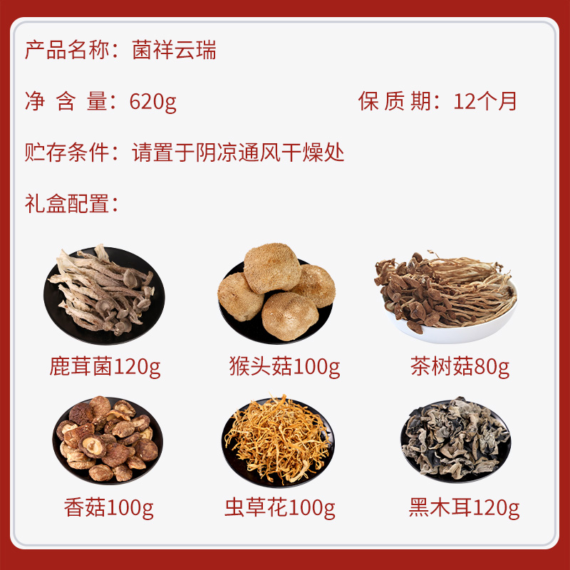 内置:茶树菇80g 香菇100g 黑木耳120g 虫草花100g 猴头菇100g 鹿茸菇120g