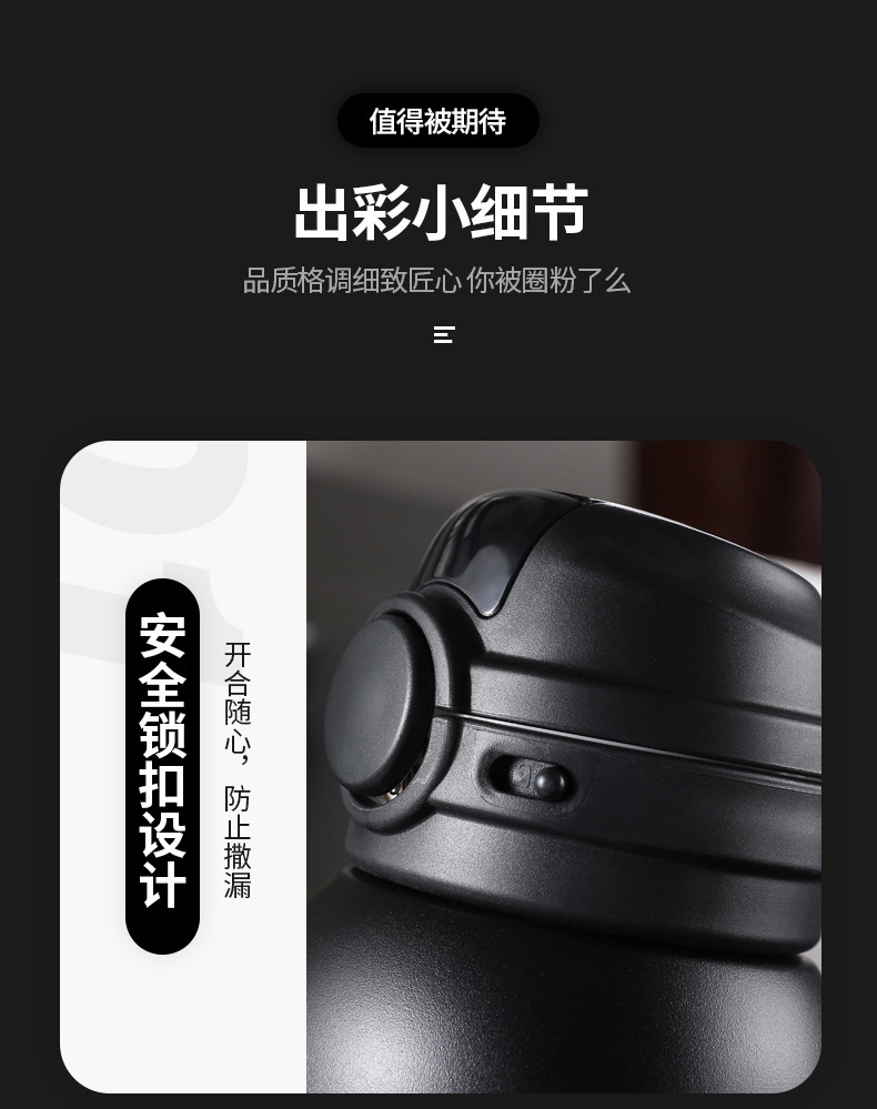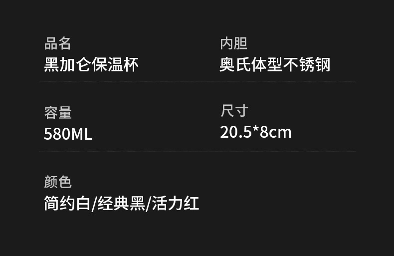 容量:580ml 材质:316不锈钢 颜色:黑,白,红色 •选用内外优质304不锈钢, 高温喷塑工艺,无尾真空技术处理。 •杯口圆润光滑,精工细作,食品级PP塑料盖安全无异味。 •细粉喷塑面,耐磨耐摔 ,雾面质感思腻尔温润。 •未成年人请在大人指导下或告知后使用。