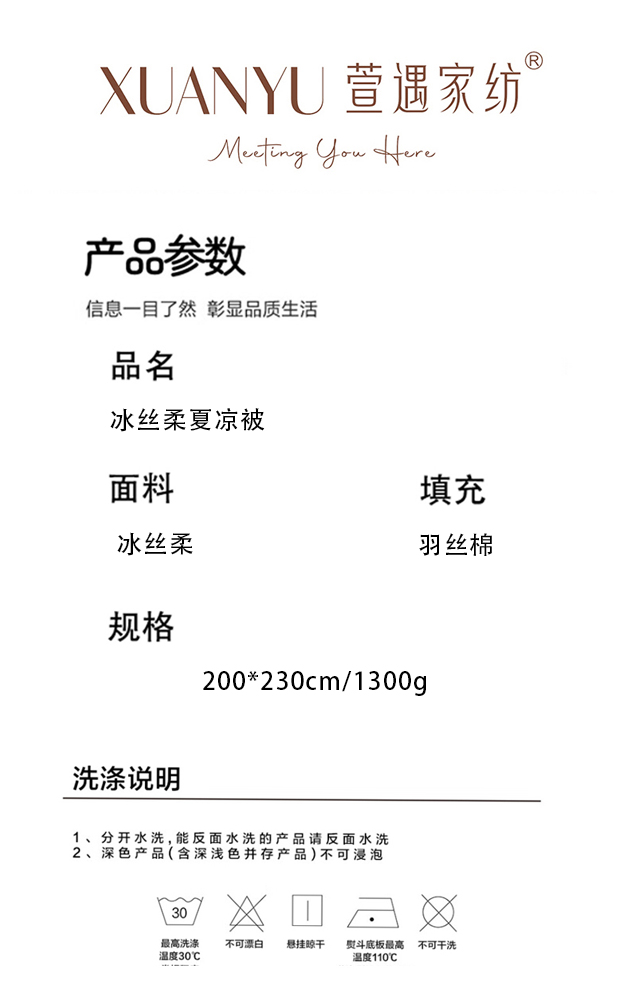 尺寸:200*230cm 面料:冰丝柔 填充:羽丝棉 重量:1300g 执行标准:GB/T22796-2021 安全类别:GB18401-2010 B类 1.严选高密水洗冰丝为原材料,搭配凉感因子,注入凉席材料中温和清凉,适合多种人群使用。 2.经过原料选材、弯曲、统口、抛光、组装、编织等多道工序打磨出匠心凉席。