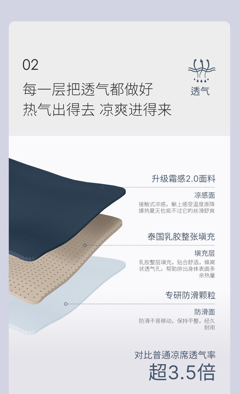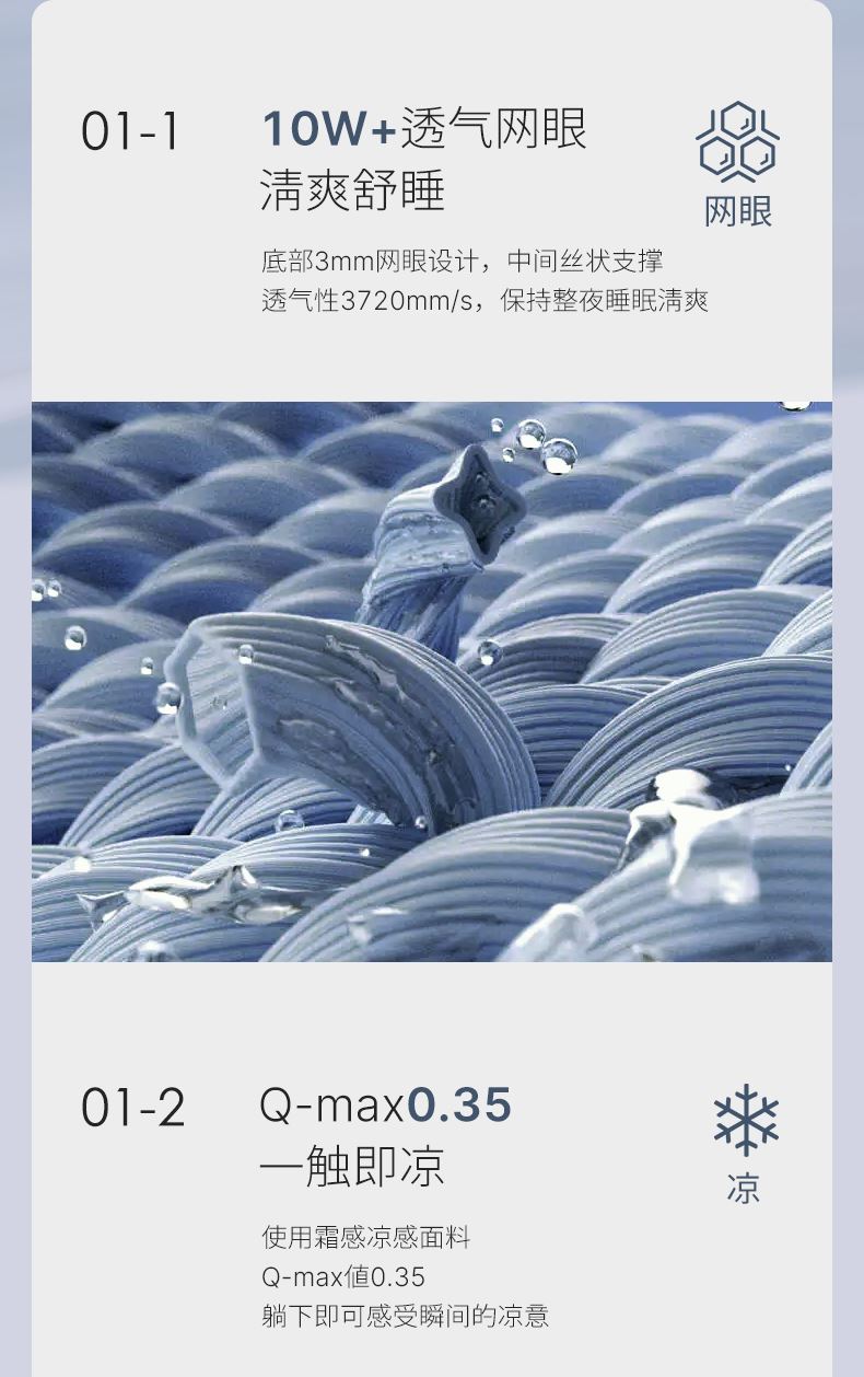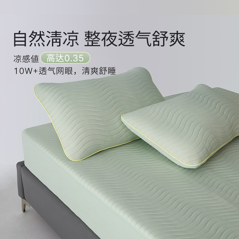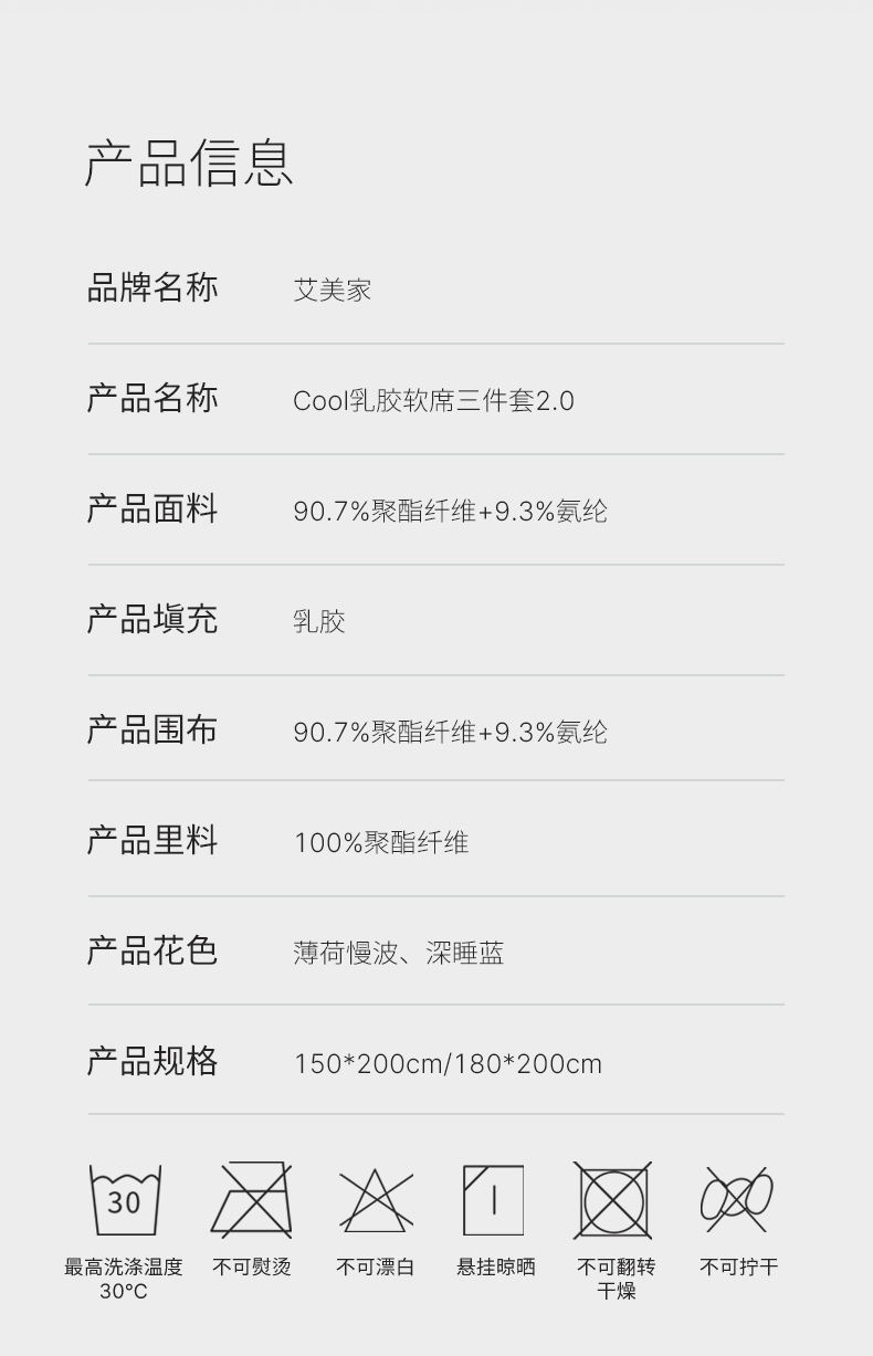 面料:90.7%聚酯纤维+9.3%氨纶 填充:乳胶 规格:枕套:48*74cmx2cm 软席:150*200cm 3层结构透气有弹性 凉感值Q-MAX高达0.31,恰到好处的的冰爽舒适 母婴级A类,水洗不板结 内含乳胶蛋白酶、防螨,整张乳胶高弹耐用