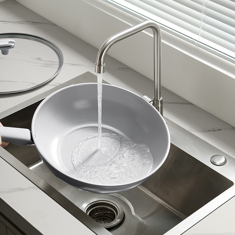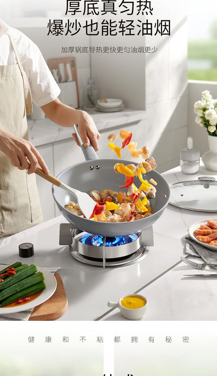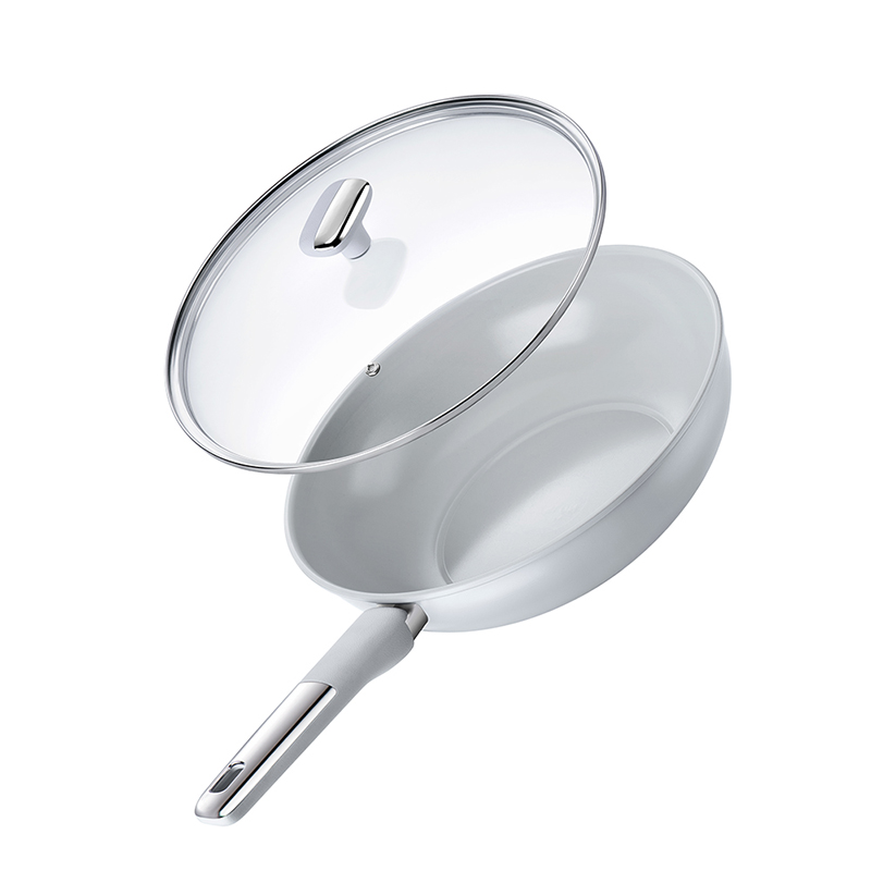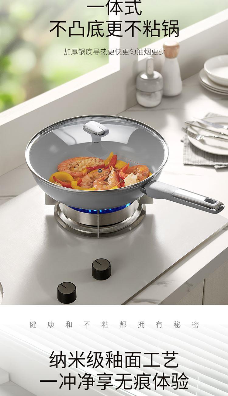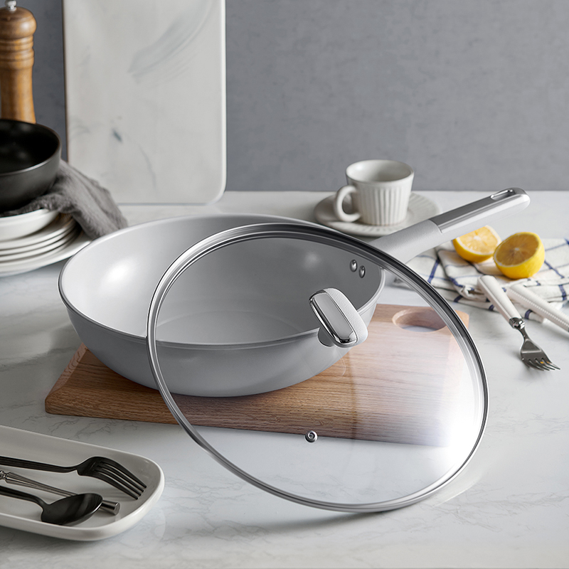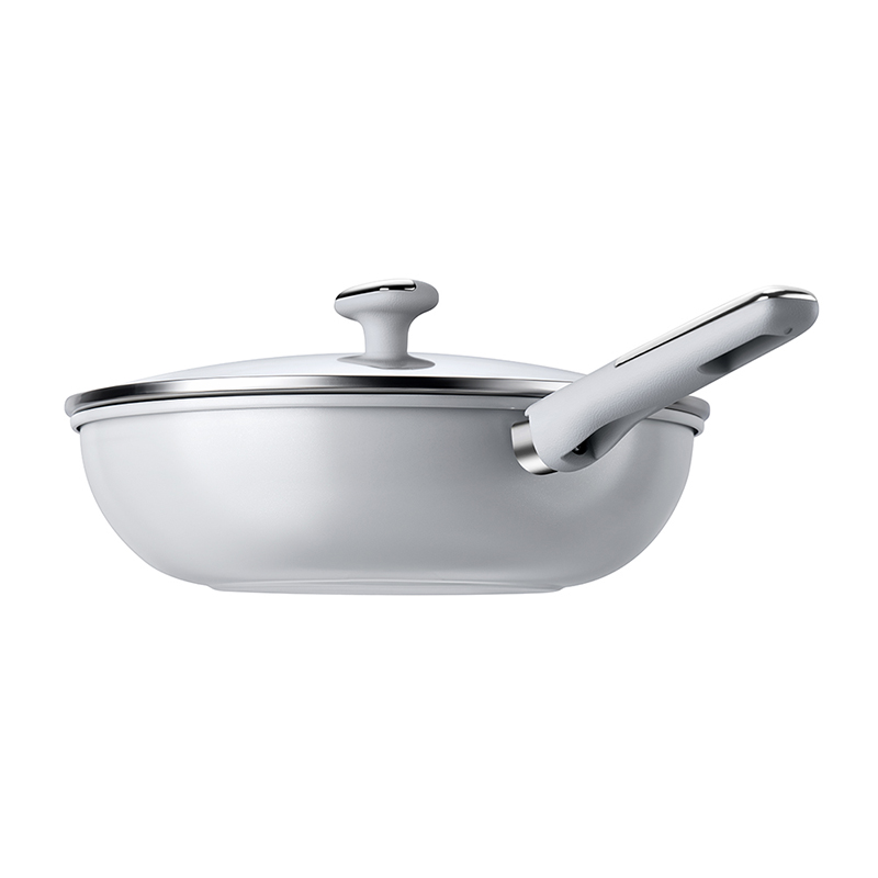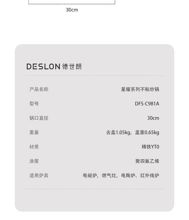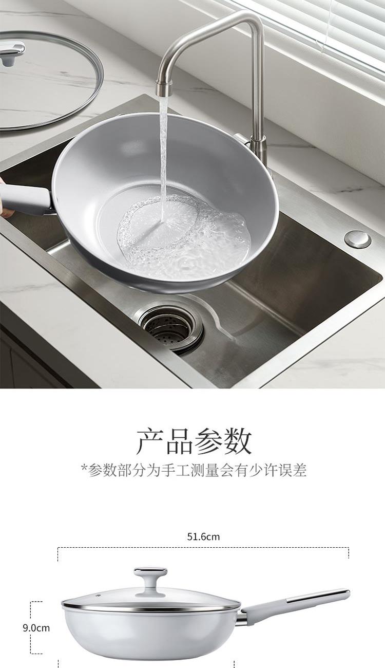 产品规格:30cm 产品材质:精铁YT0 产品涂层:聚四氟乙烯(食品接触用) 包装方式:彩盒+外箱 1、符合卫生标准的不粘工艺,健康安全,可放心使用; 2、人性化高强度钢化玻璃盖,持久耐用,烹饪美味一目了然; 3、锅沿防滴漏设计,可将汤汁轻松倒出,使用方便; 4、精铁材质制造,传热更快,受热均匀; 5、锅身外壁陶瓷源于天然无机物,耐高温耐腐蚀 ,易清洗久用如新; 6、隔热防烫手柄,符合人体工程学,使用舒适自然。
