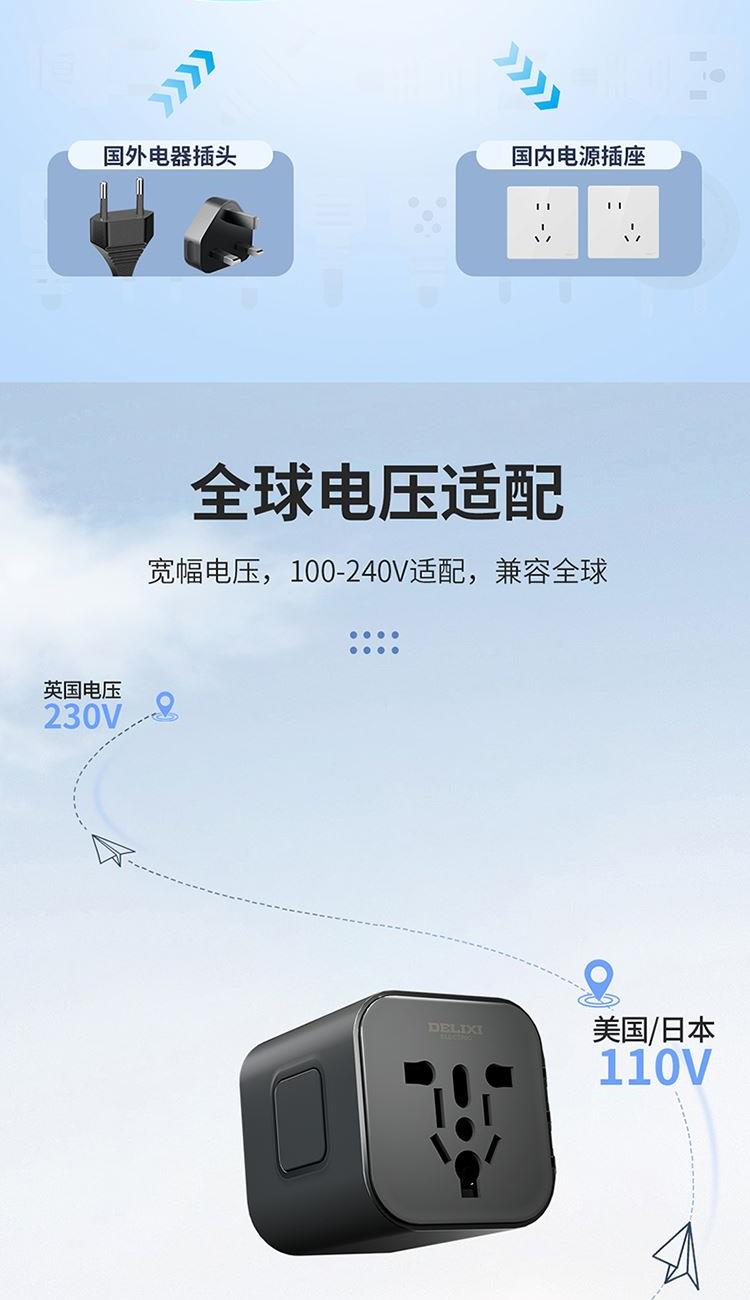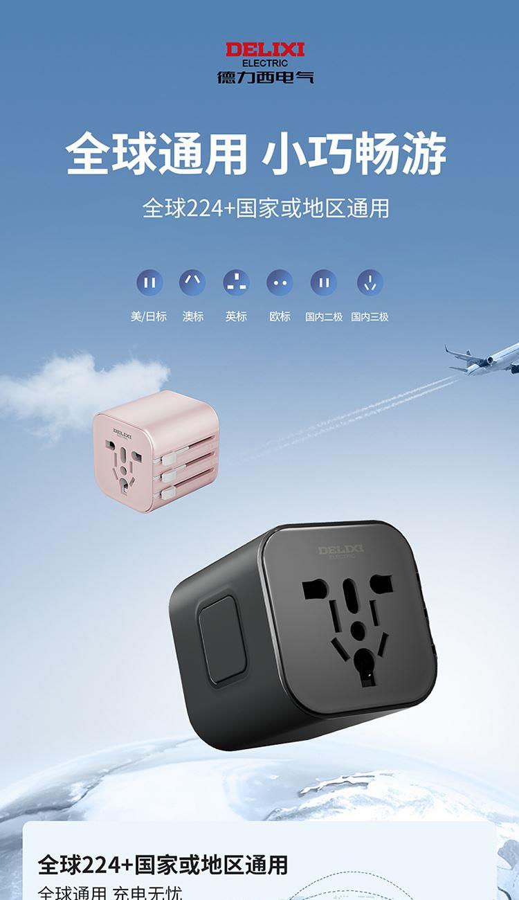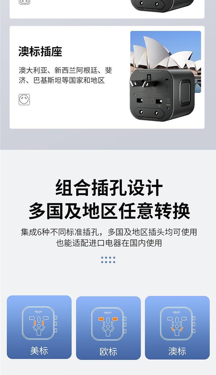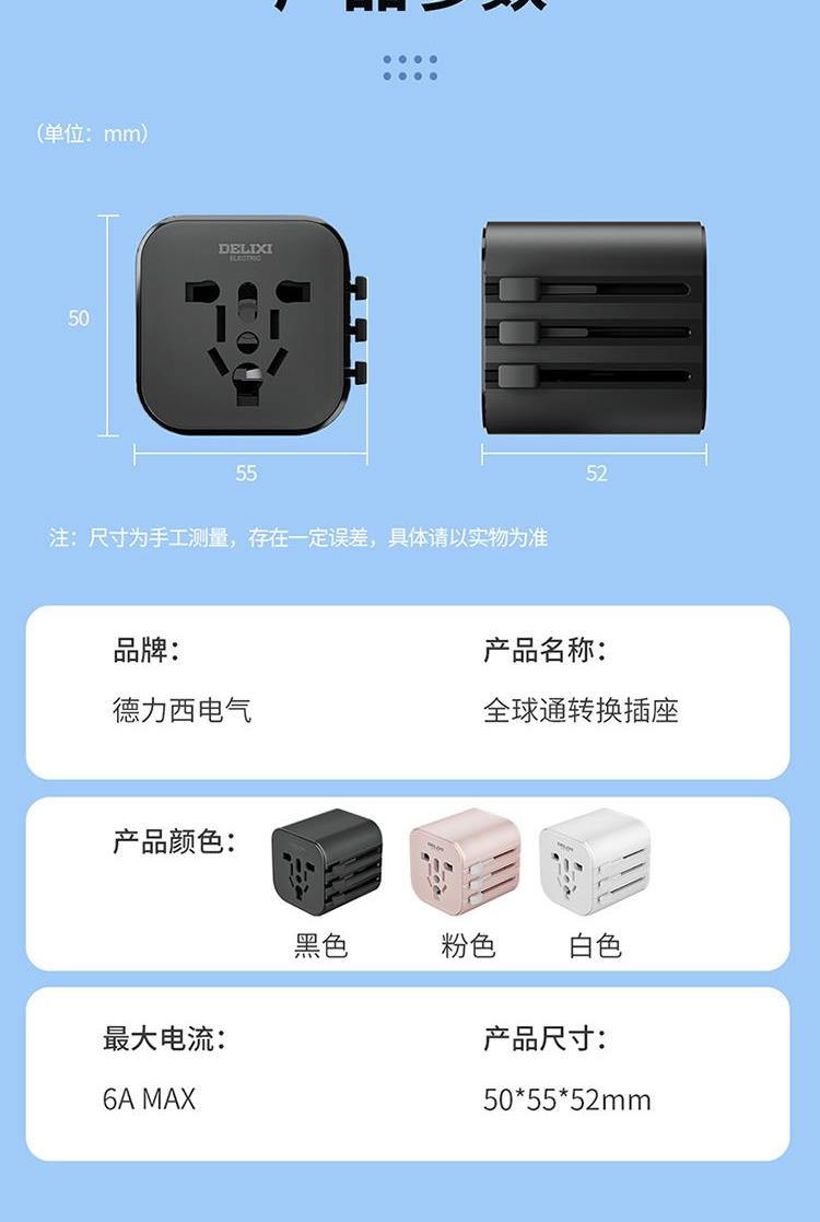产品:德力西电气全球通旅行插座 基础款 白色 产品型号:CD98-SPQ(HE)Q (B) 产品颜色:白色 宽幅电压:100-240V适配 产品尺寸:55*50* 52mm 产品材质:PC+ABS 阻燃材料 电流:6A MAX 产品位数:欧标、英标、美标、澳标、一位二孔、一位三孔、无线