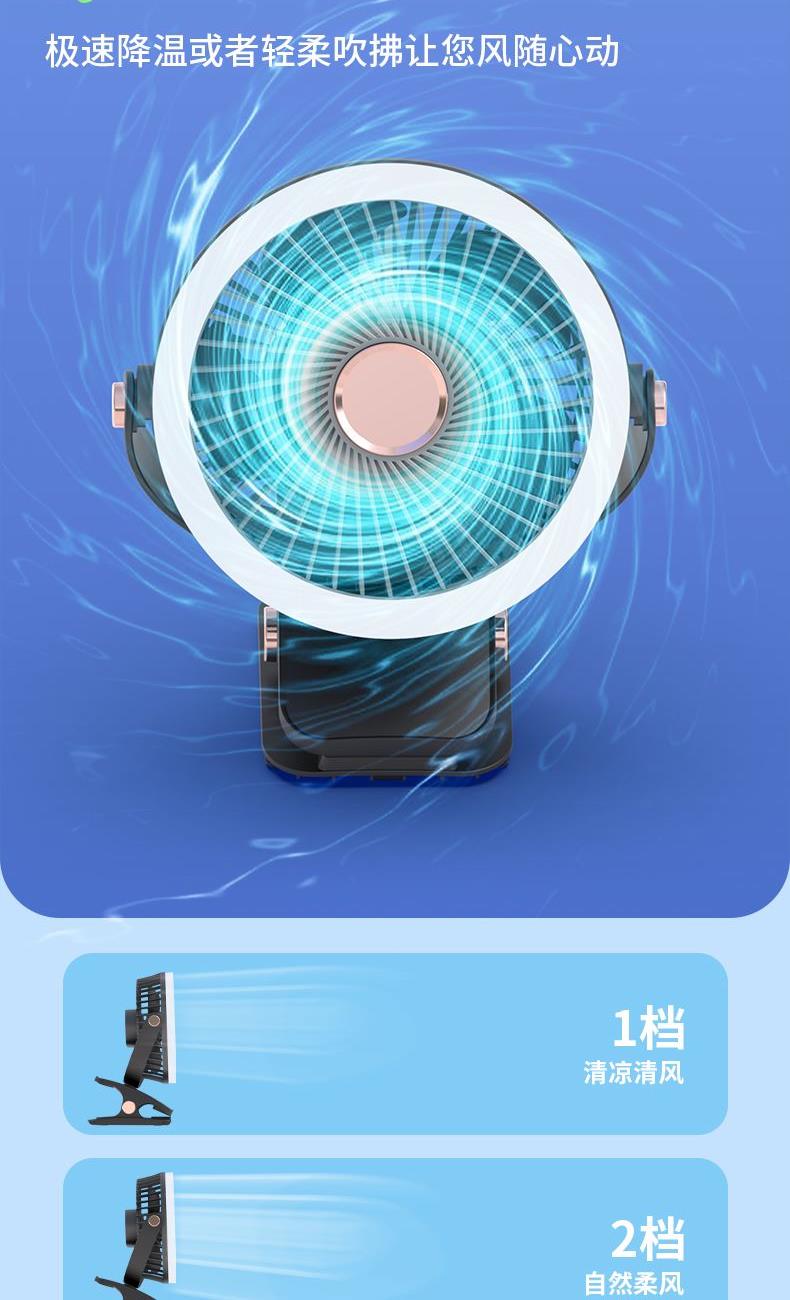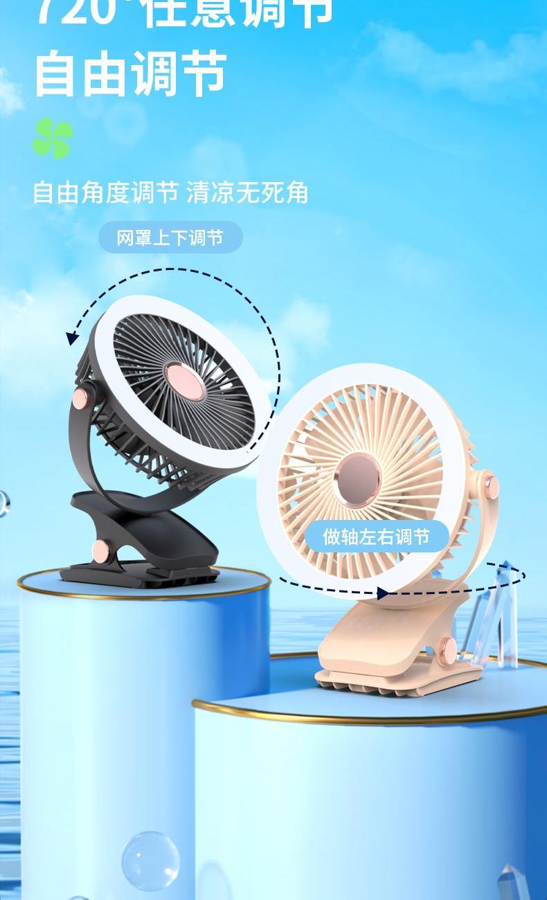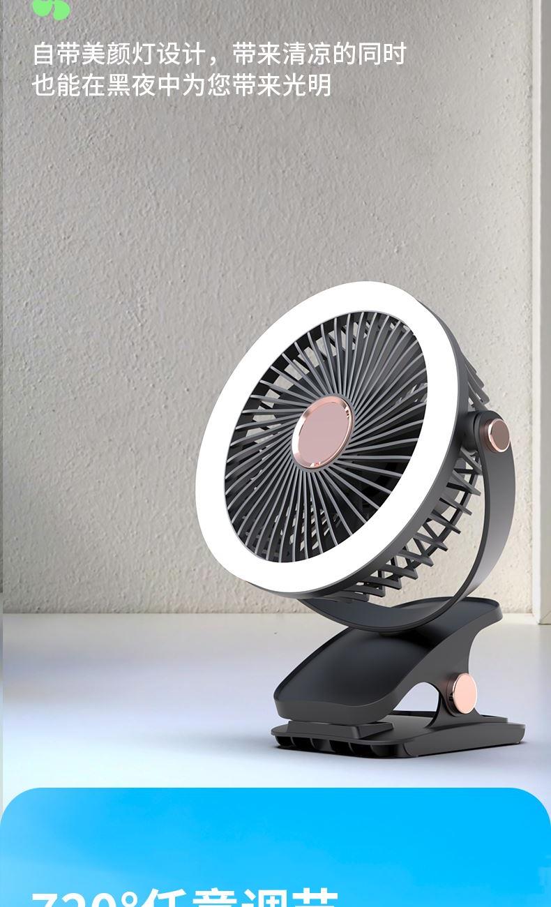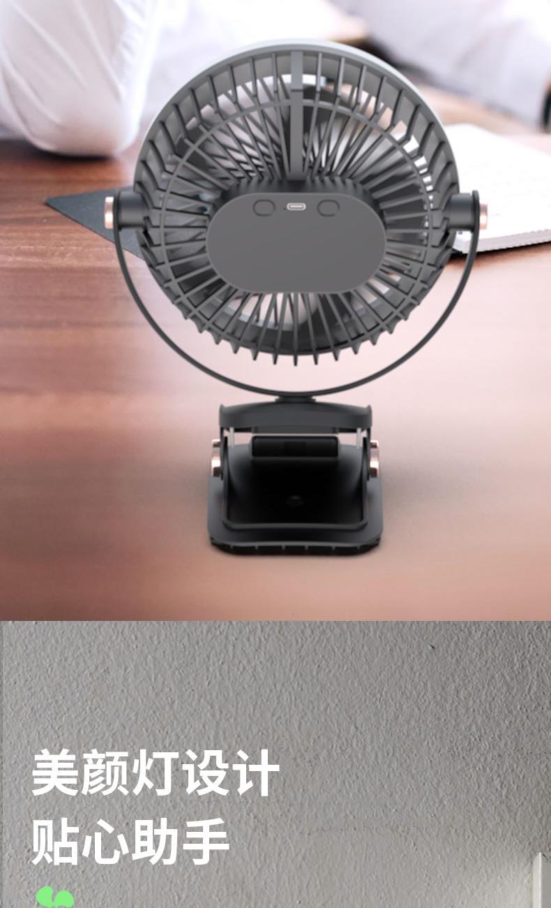 材质:ABS 电池类型:18650锂电池 电池容量:2400mAh 输入功率:5V-1A 额度功率:5W 角度调节:720度 产品接口:TYFE-C 档位调节:五档风速 颜色:黑色、白色 720°多方位自由旋转,清凉无处不在,智能五档调节超长续航,超静音、大风力 开启清凉之旅,夹力双重应用加强咬合力灵活应对多种场景;自带美颜灯设计,带来清凉的同时也能在黑夜中为您带来光明。