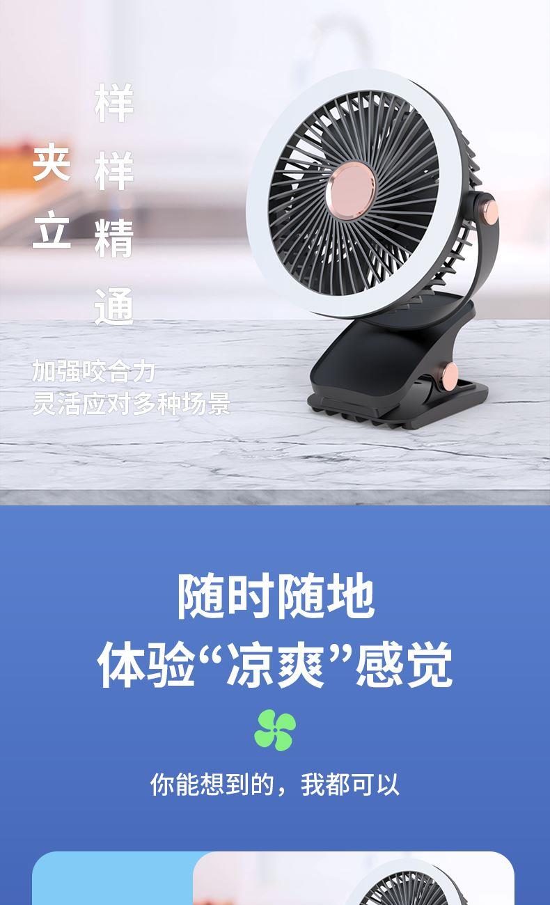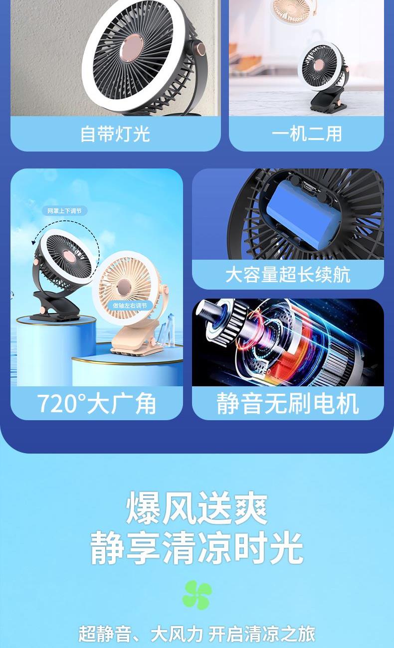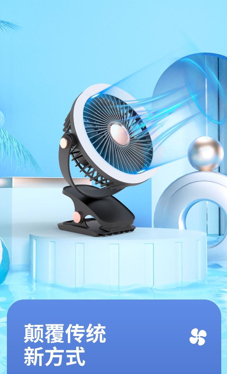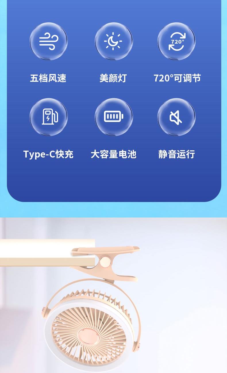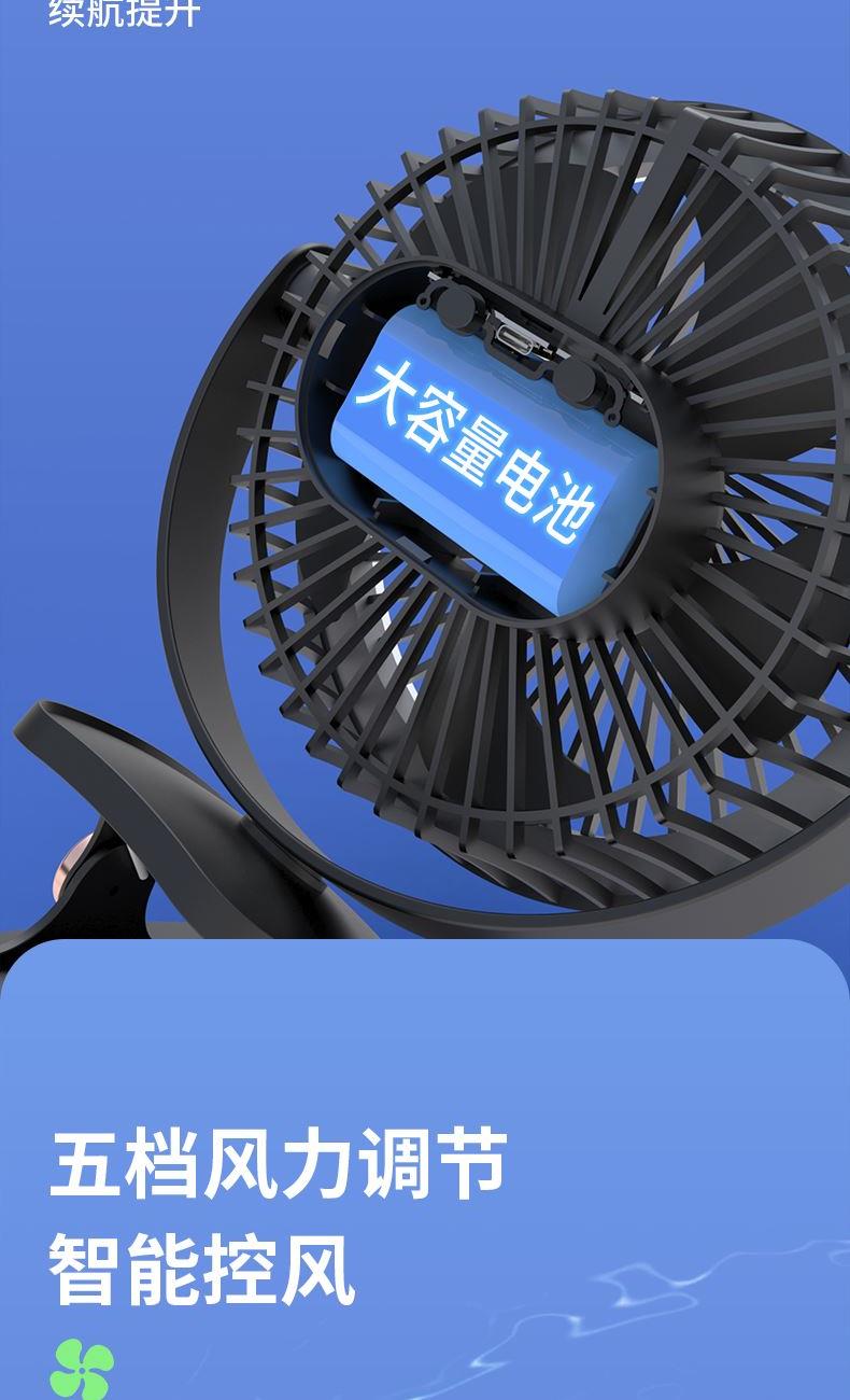 材质:ABS 电池类型:18650锂电池 电池容量:2400mAh 输入功率:5V-1A 额度功率:5W 角度调节:720度 产品接口:TYFE-C 档位调节:五档风速 颜色:黑色、白色 720°多方位自由旋转,清凉无处不在,智能五档调节超长续航,超静音、大风力 开启清凉之旅,夹力双重应用加强咬合力灵活应对多种场景;自带美颜灯设计,带来清凉的同时也能在黑夜中为您带来光明。
