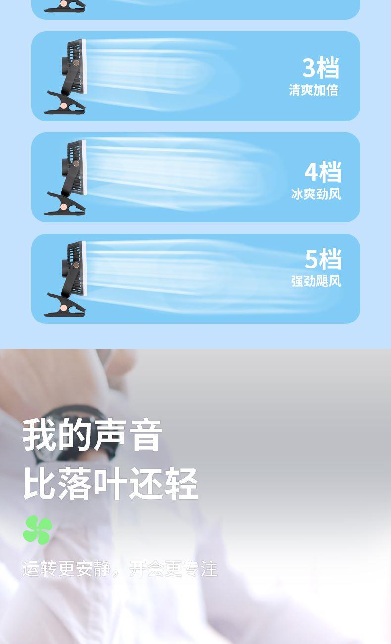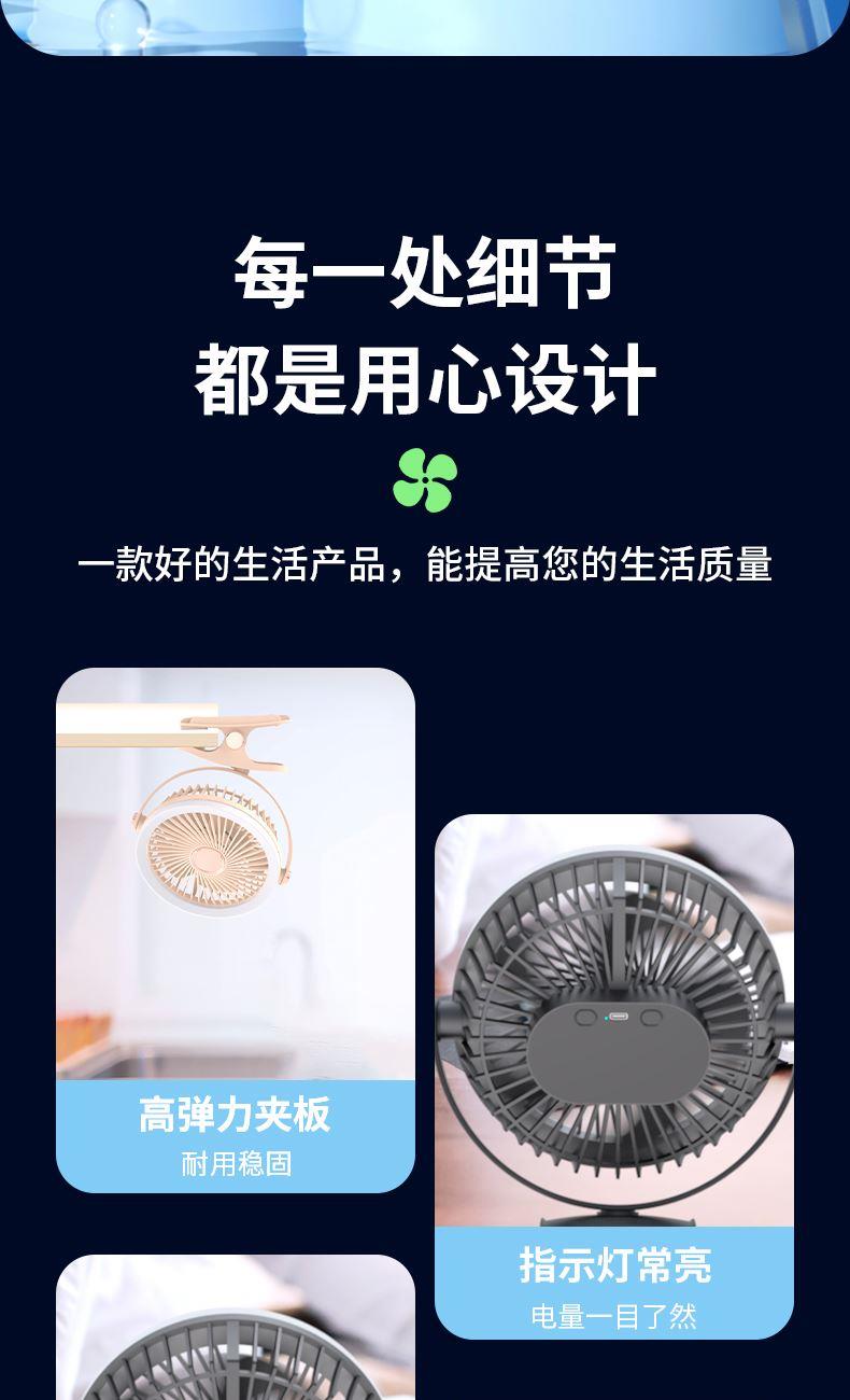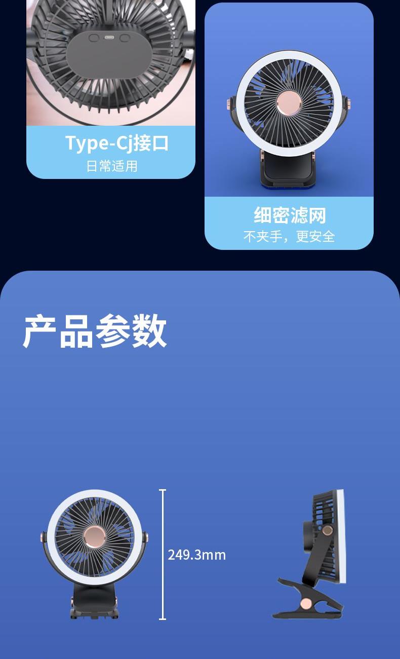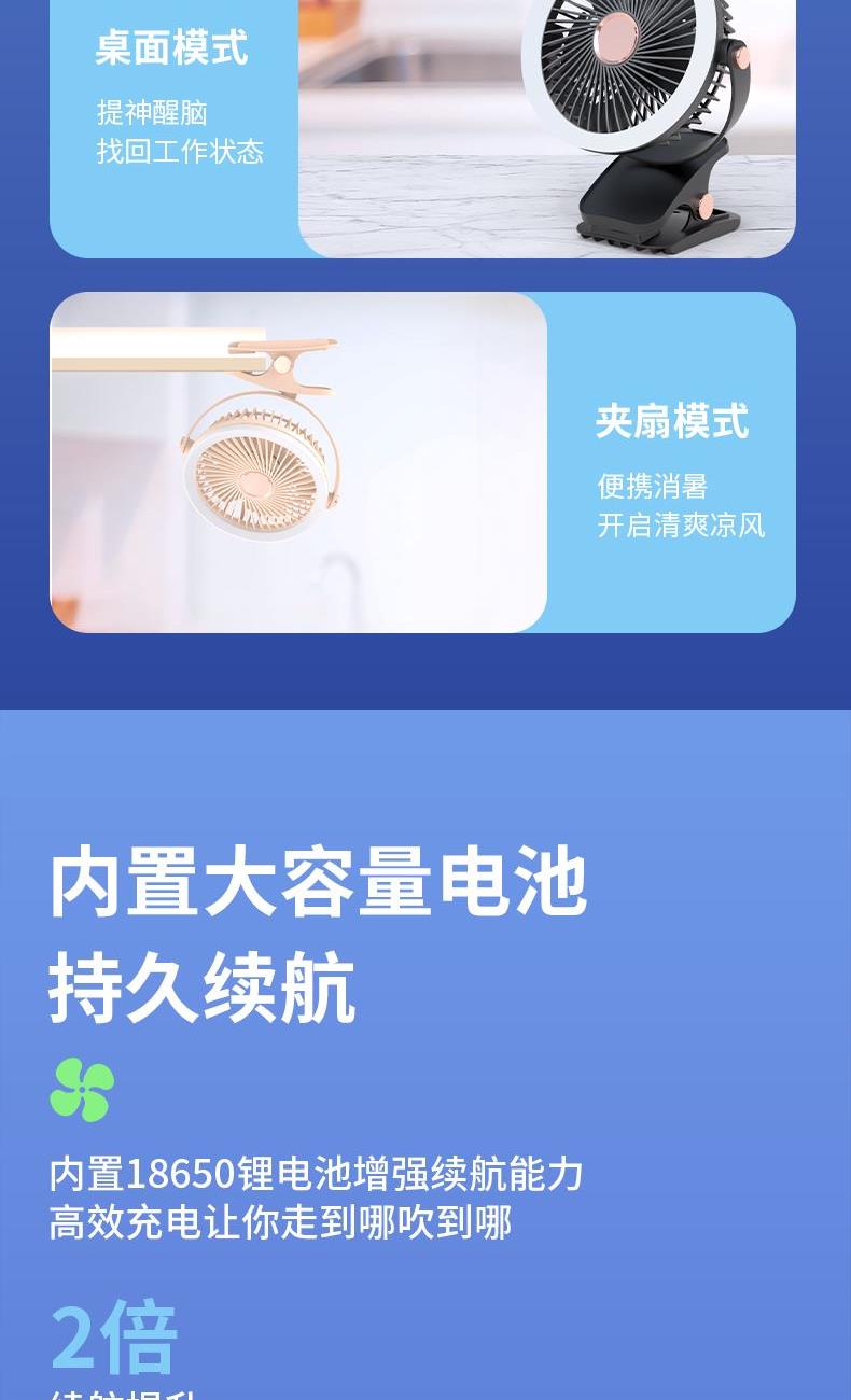 材质:ABS 电池类型:18650锂电池 电池容量:2400mAh 输入功率:5V-1A 额度功率:5W 角度调节:720度 产品接口:TYFE-C 档位调节:五档风速 颜色:黑色、白色 720°多方位自由旋转,清凉无处不在,智能五档调节超长续航,超静音、大风力 开启清凉之旅,夹力双重应用加强咬合力灵活应对多种场景;自带美颜灯设计,带来清凉的同时也能在黑夜中为您带来光明。