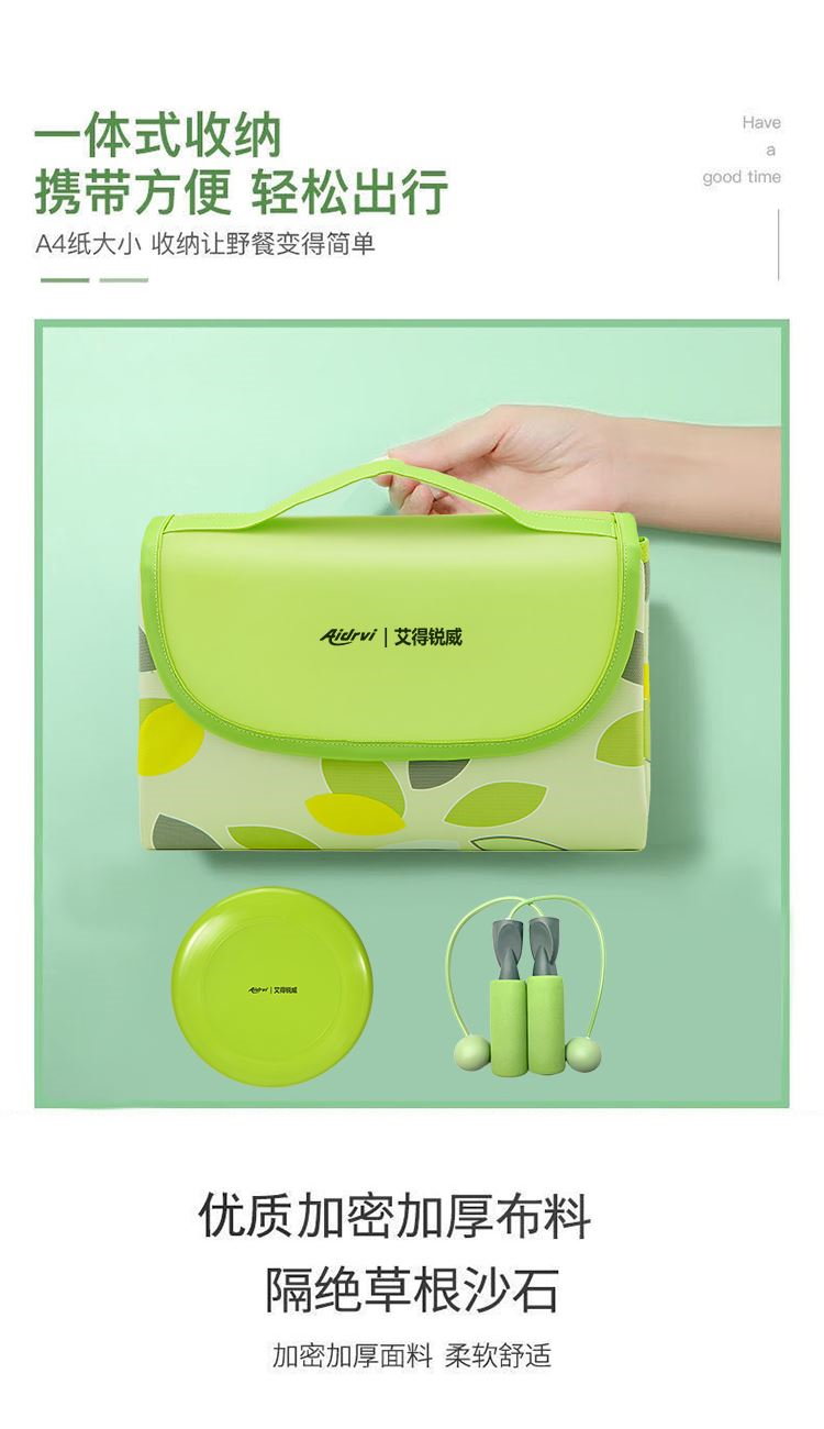 产品尺寸:贵族野餐垫:200x150cm/飞盘:175g/圆球跳绳:3cm 产品材质:600D牛津花瑶布+PE+泡棉 套装组合:贵族野餐垫+飞盘+圆球跳绳 彩盒尺寸:31x8x28.5cm 外箱尺寸:43*32.5*60 贵族野餐垫:一体式收纳,携带方便、轻松出行,面料软硬适中,不沾沙草,防潮耐磨易清洗; 飞盘:耐摔耐用,飞行平稳,可个性化定制图案,社交神器; 圆球跳绳:不限场地室内也能跳,优质轴承丝滑耐用,高密度泡棉吸汗又防滑