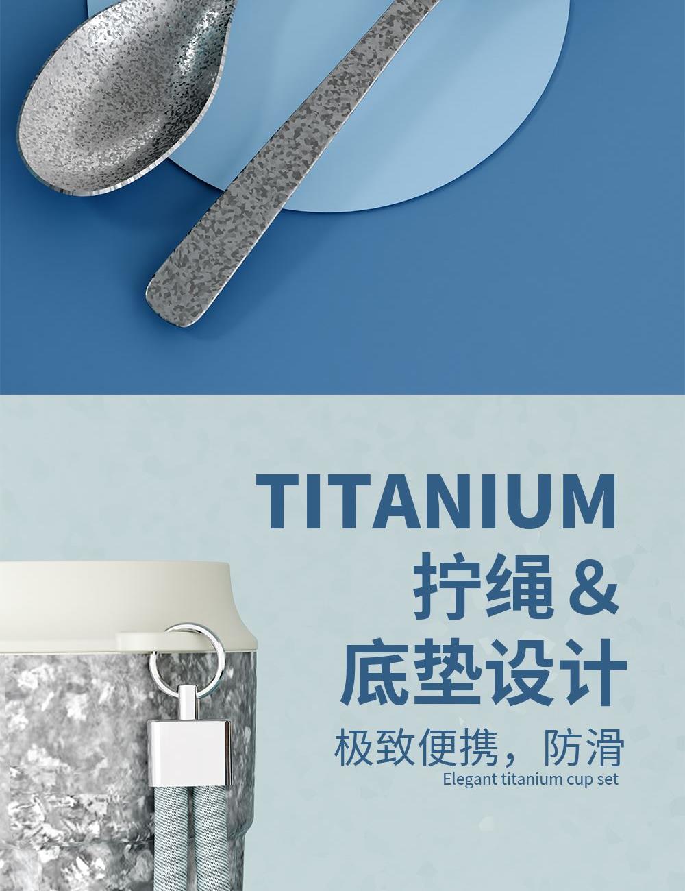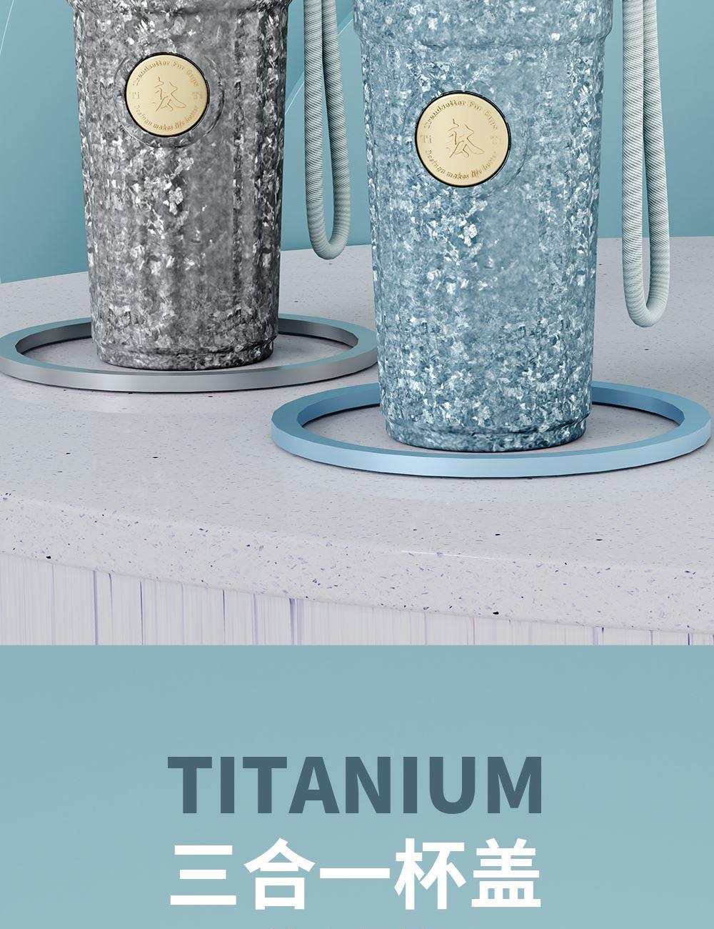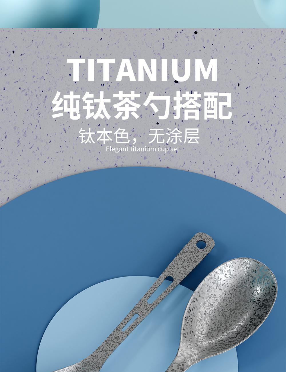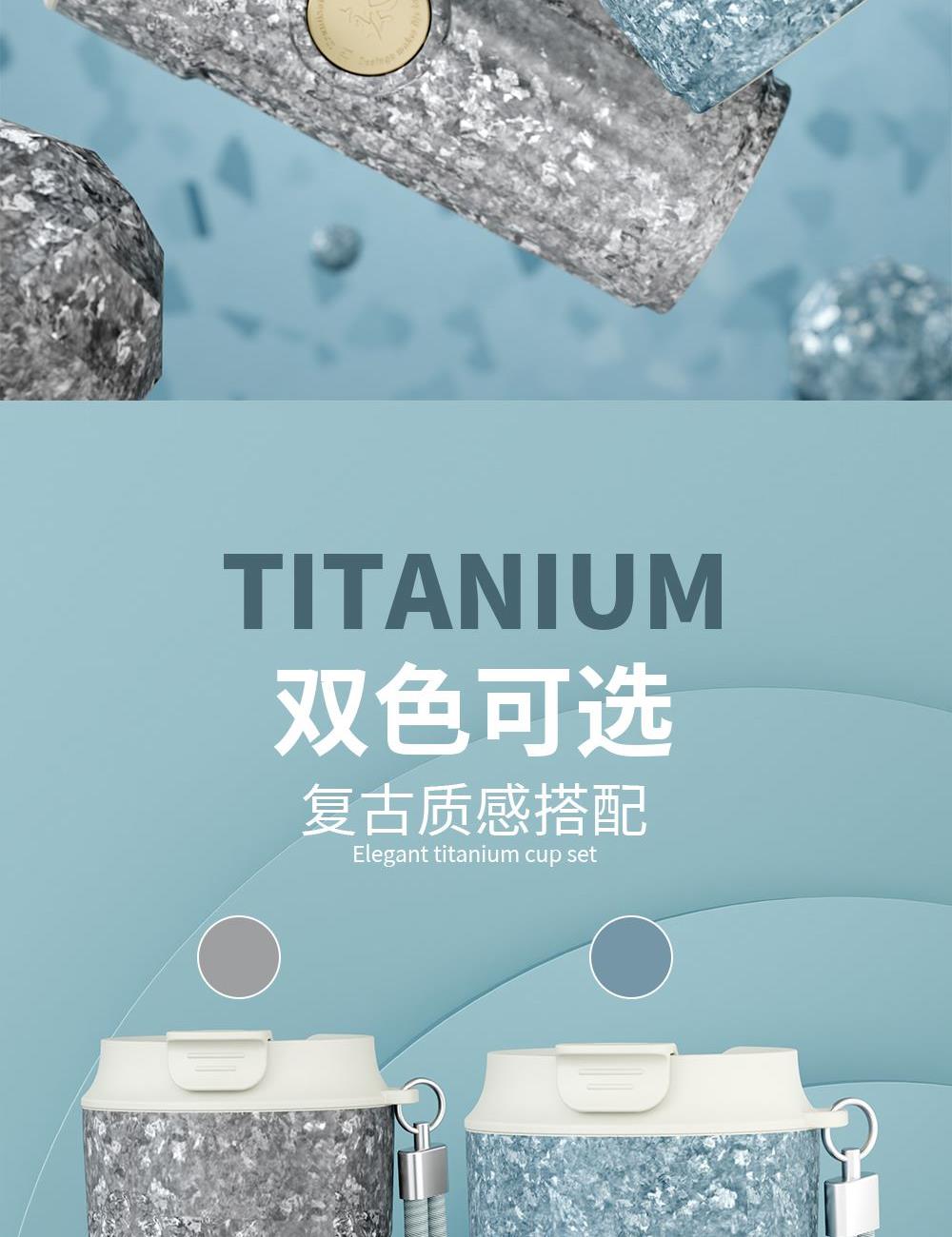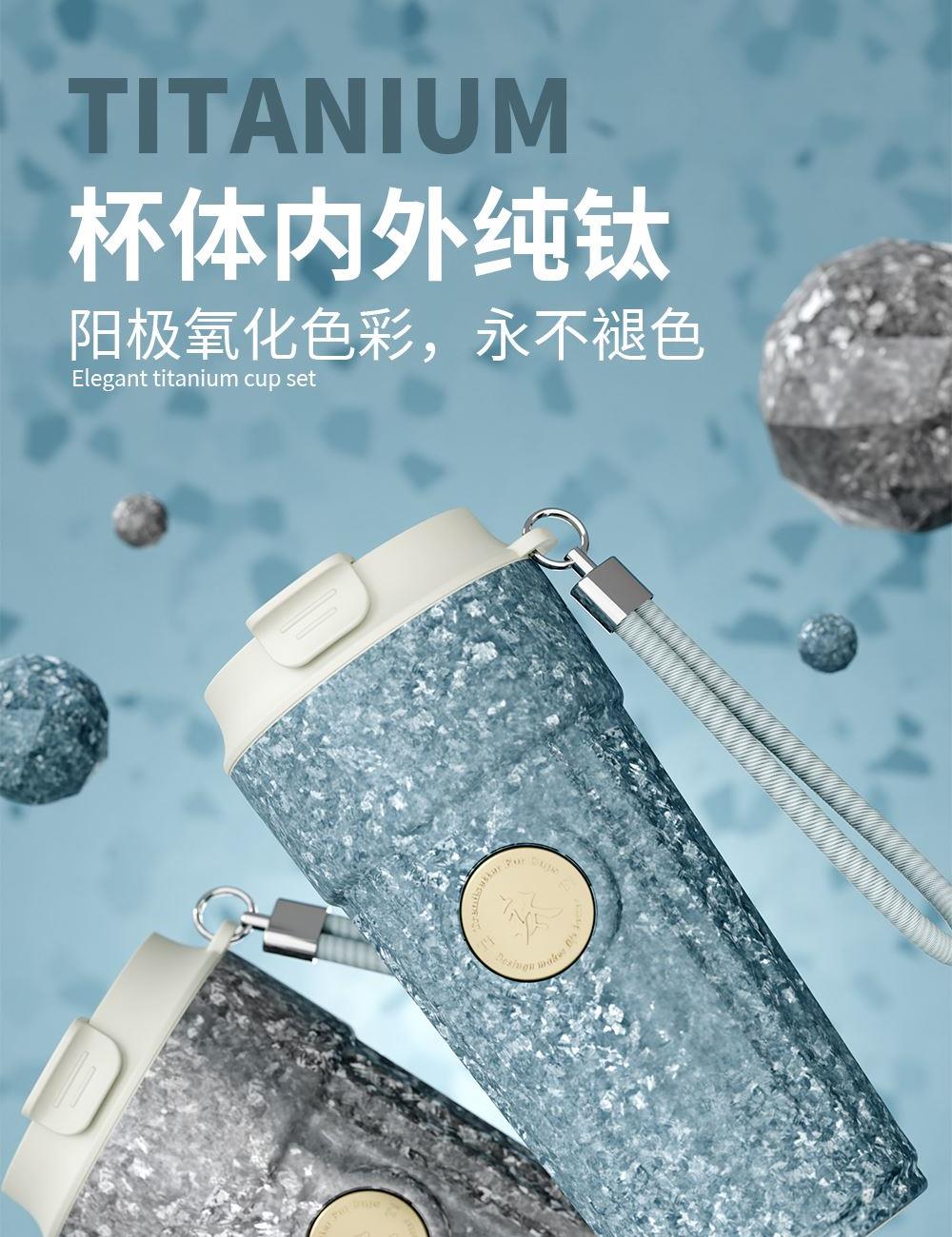 · 杯体材质 : 内外纯钛 · 勺子材质 : 纯钛 · 塑 料 件:PP(食品接触用) · 密 封 圈:硅胶(食品接触用) · 配 置 :钛杯*1+勺子*1+茶仓*1+冷萃仓*1 · 容 量 : 钛杯容量480ML · 颜 色 :星光银 / 孔雀蓝 · 彩盒尺寸 :24*24*10.5CM · 外箱尺寸 :56*51*37CM · 毛重(带礼盒):718g 卖点: · 杯体内外采用纯钛材质,含钛量达99.8%。 · 保冷保温,健康锁鲜。 · 材质健康安全,不与各类酸碱性饮品产生化学反应,安 全无析出,放心盛放日常饮品。 · 表面色彩不喷漆上色,阳极氧化自然产生色彩,长期使用不掉色。