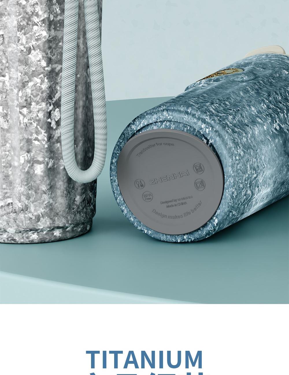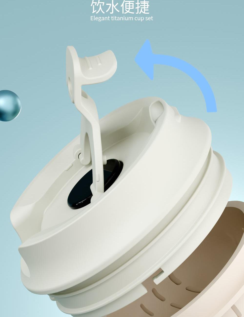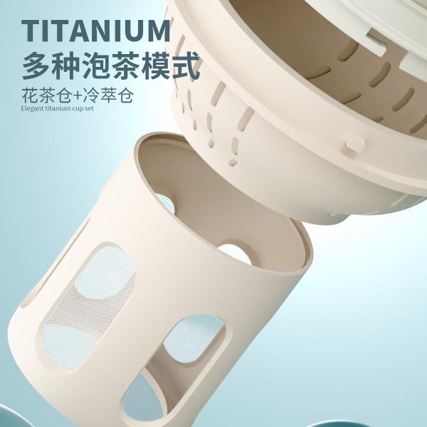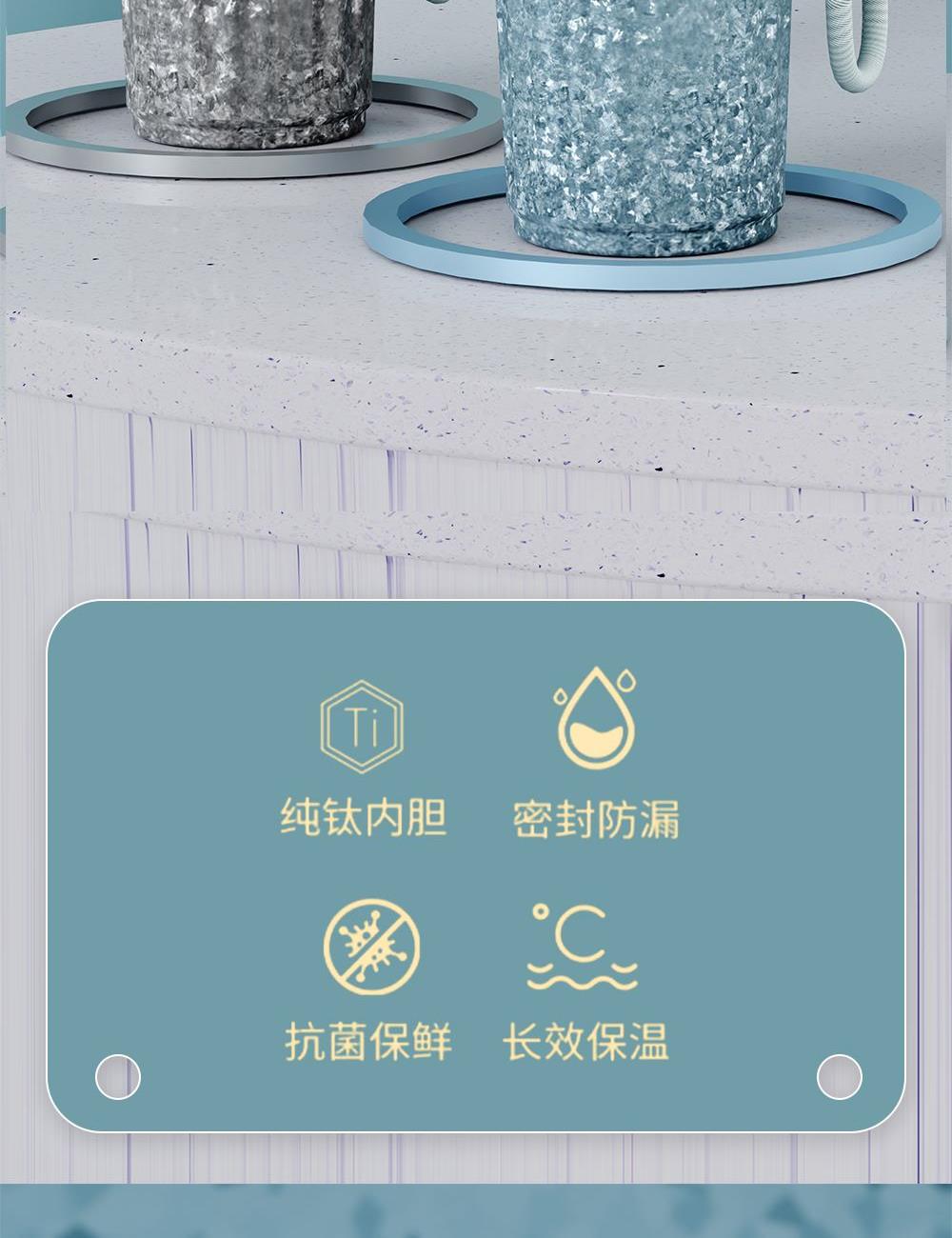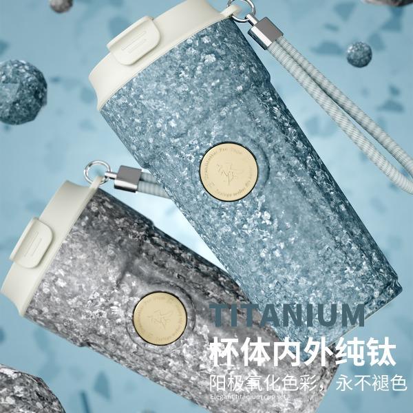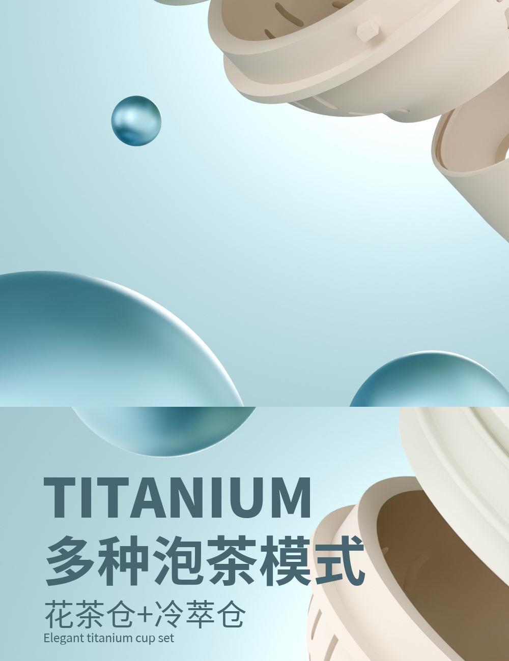 · 杯体材质 : 内外纯钛 · 勺子材质 : 纯钛 · 塑 料 件:PP(食品接触用) · 密 封 圈:硅胶(食品接触用) · 配 置 :钛杯*1+勺子*1+茶仓*1+冷萃仓*1 · 容 量 : 钛杯容量480ML · 颜 色 :星光银 / 孔雀蓝 · 彩盒尺寸 :24*24*10.5CM · 外箱尺寸 :56*51*37CM · 毛重(带礼盒):718g 卖点: · 杯体内外采用纯钛材质,含钛量达99.8%。 · 保冷保温,健康锁鲜。 · 材质健康安全,不与各类酸碱性饮品产生化学反应,安 全无析出,放心盛放日常饮品。 · 表面色彩不喷漆上色,阳极氧化自然产生色彩,长期使用不掉色。