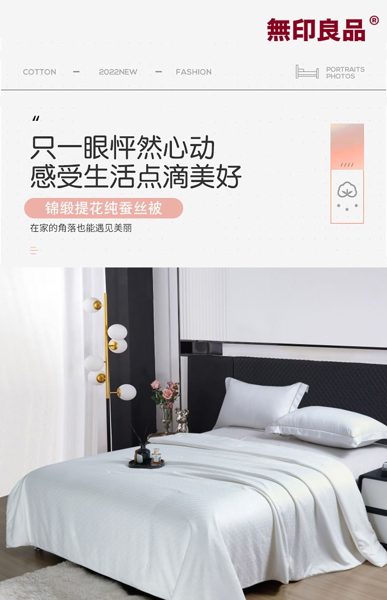 规 格:200×230cm 面 料:锦缎提花(聚酯纤维) 填 充:柞蚕丝克 重:蚕丝 500g/总重 1700g “無印良品”大染无印,优良品质的产品是年轻人喜欢的,“無印”设计, 优雅 , 质朴 , 自然 , 是無印良品的初心与追求。让体验更舒适。享受简约健康生活,走进無印,上善若水,大爱无疆,创新让生活更精彩。