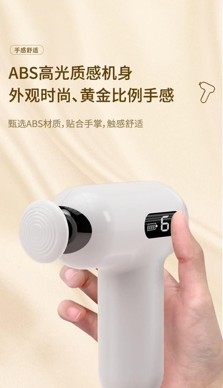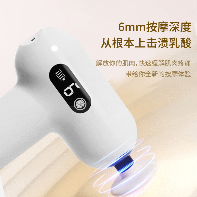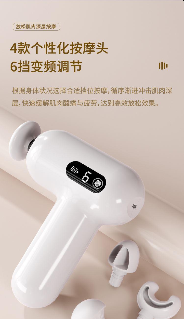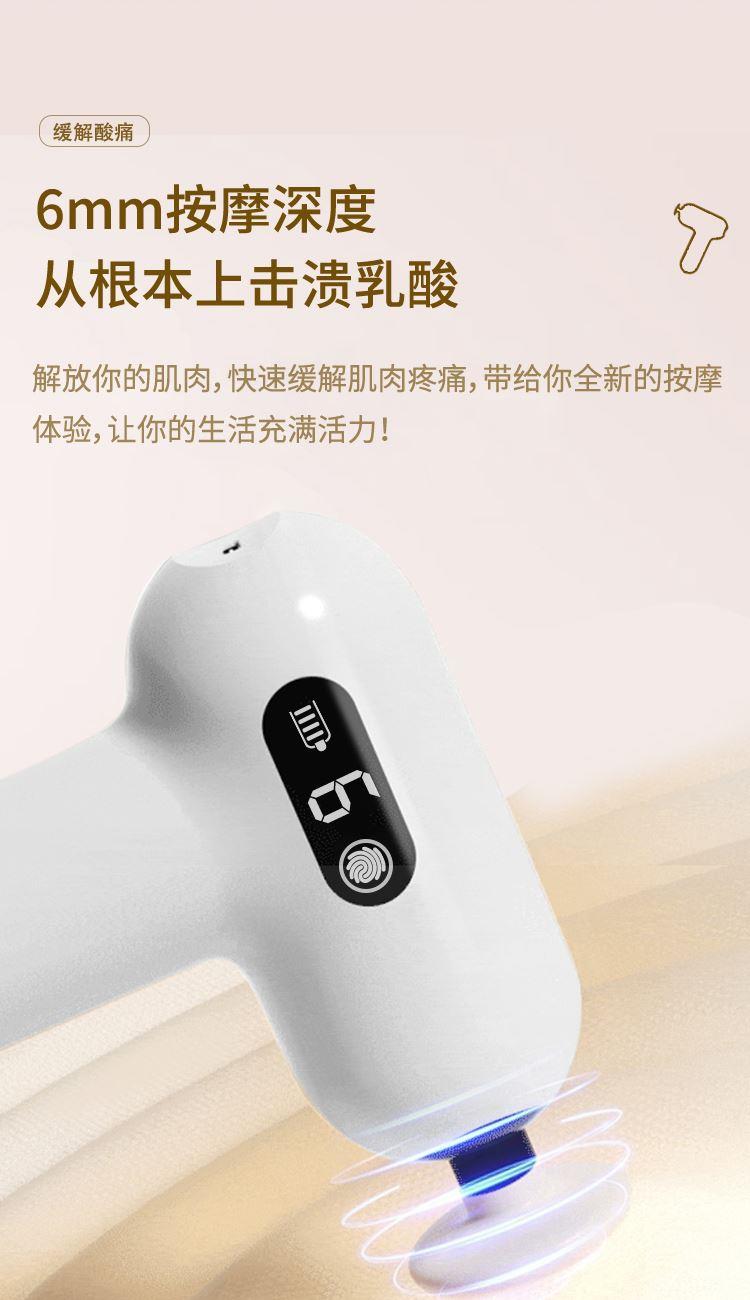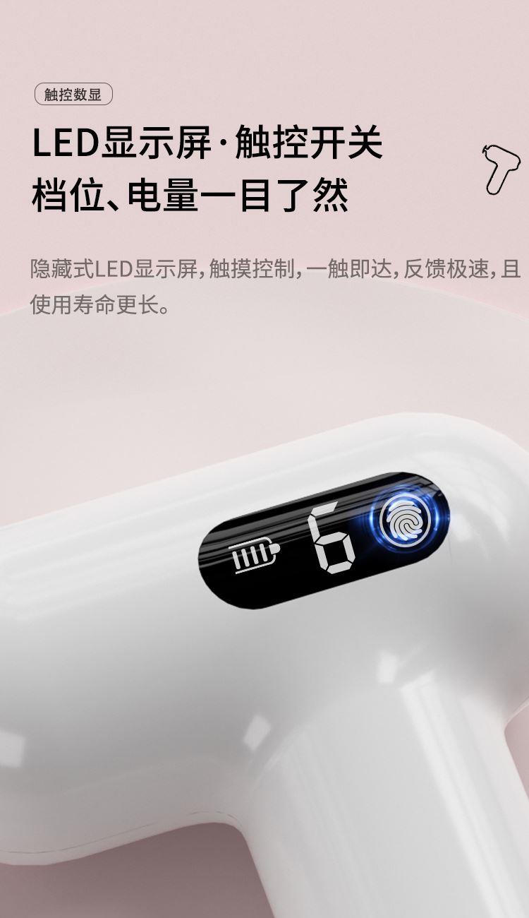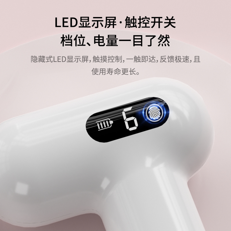 智能触控屏显筋膜枪电动按摩器 颜色:白色 粉色 紫色 绿色 材质:ABS 包装:彩盒包装 【功能特点】: 智能触控屏幕显示 智能芯片智能控速 6mm深度按摩体验 配备四种专业级按摩头 六档可调节动力深入肌群