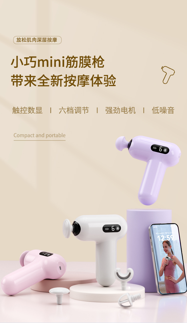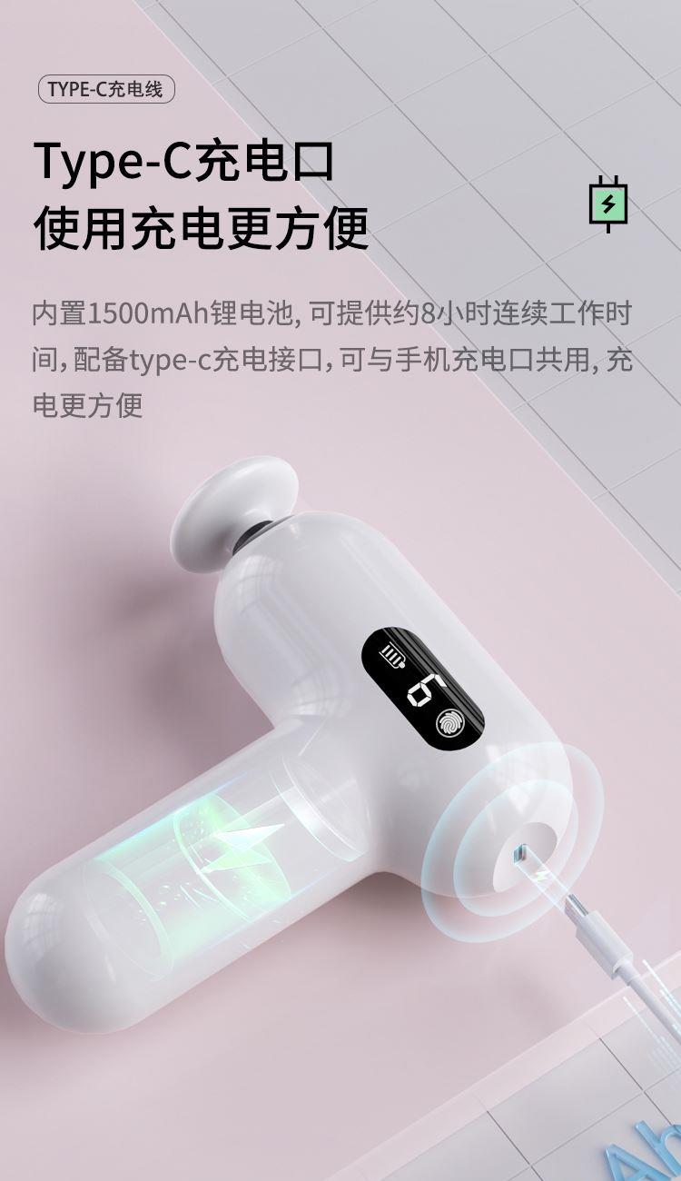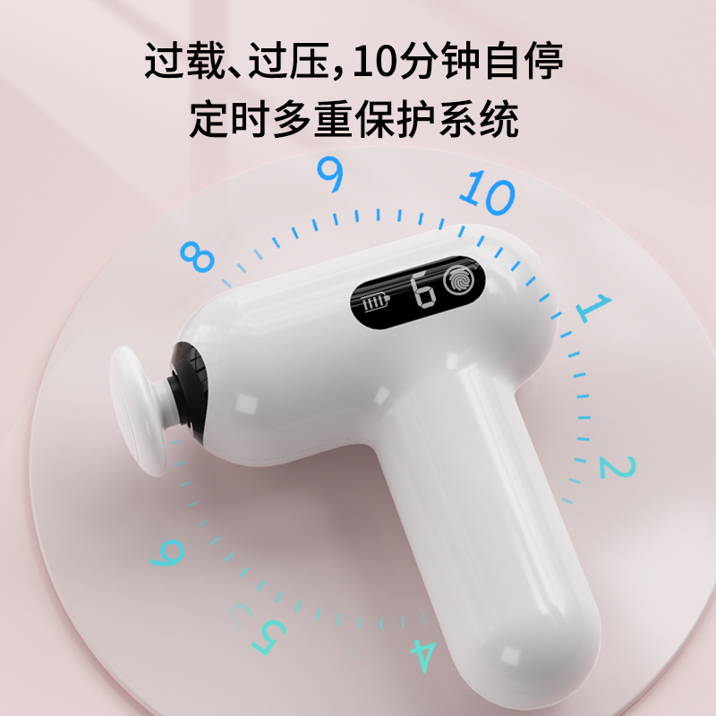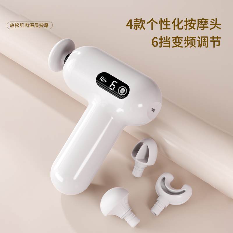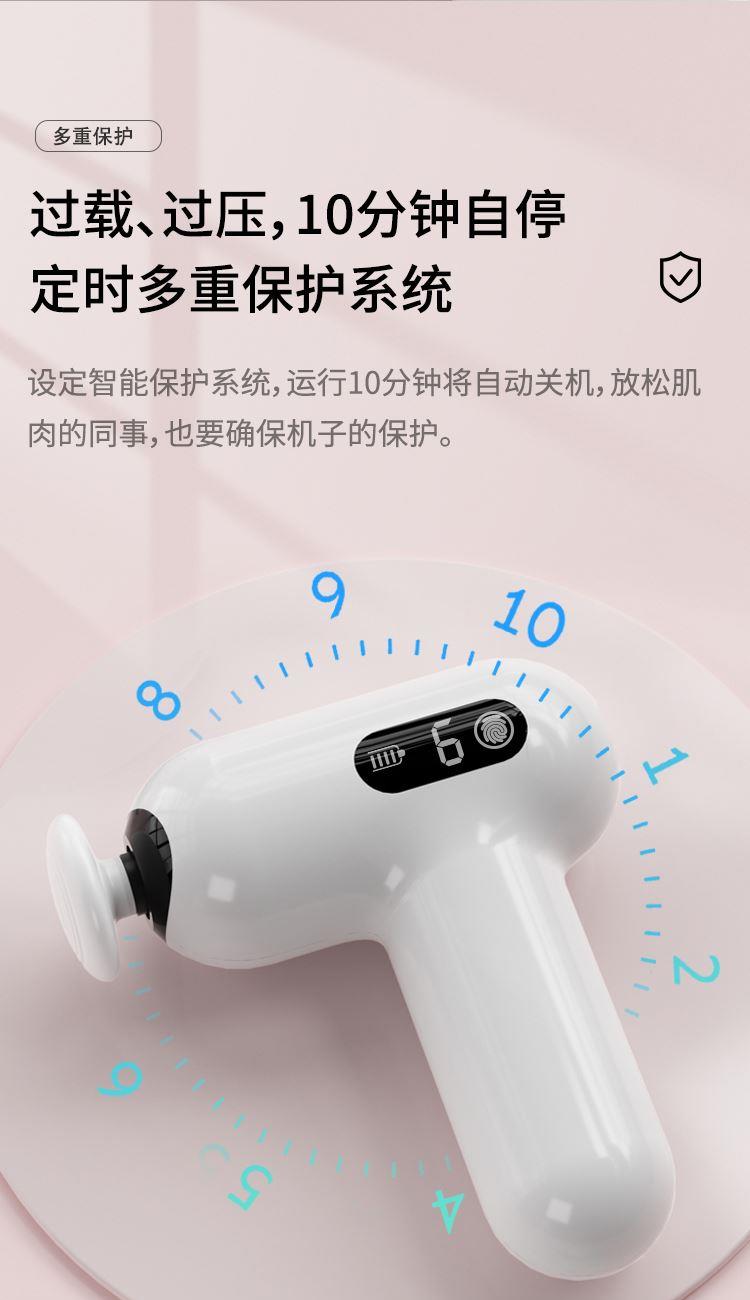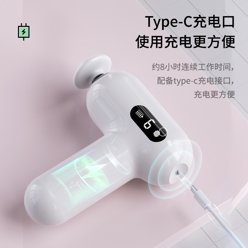 智能触控屏显筋膜枪电动按摩器 颜色:白色 粉色 紫色 绿色 材质:ABS 包装:彩盒包装 【功能特点】: 智能触控屏幕显示 智能芯片智能控速 6mm深度按摩体验 配备四种专业级按摩头 六档可调节动力深入肌群