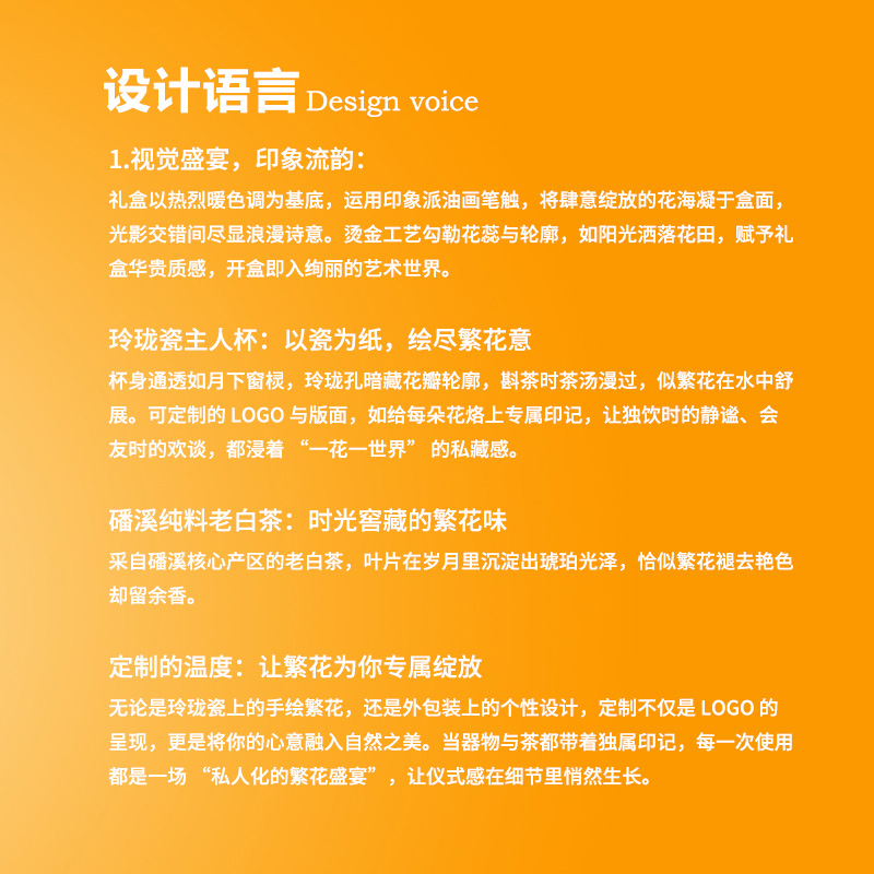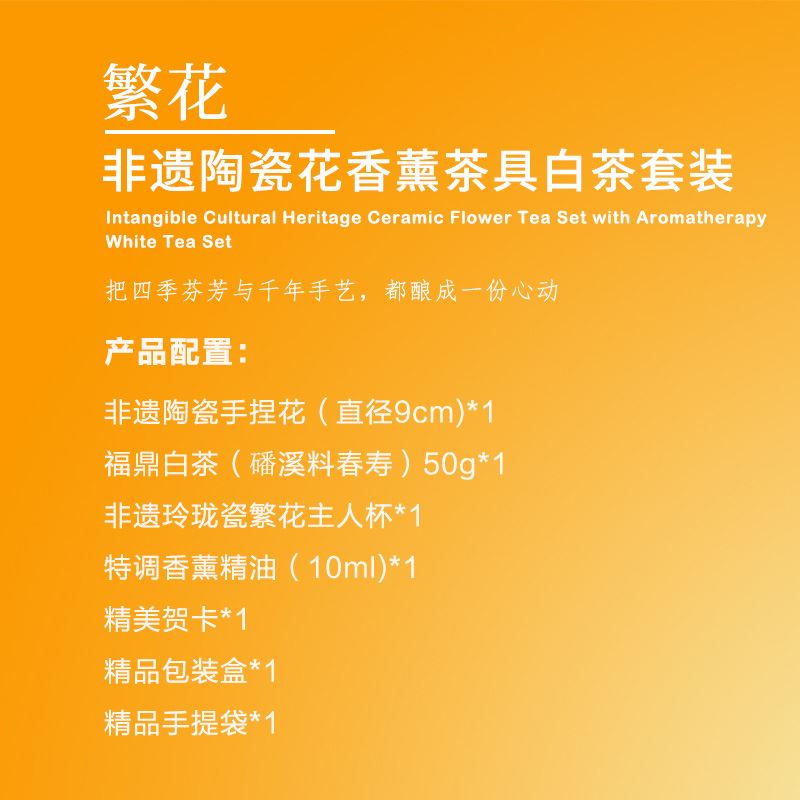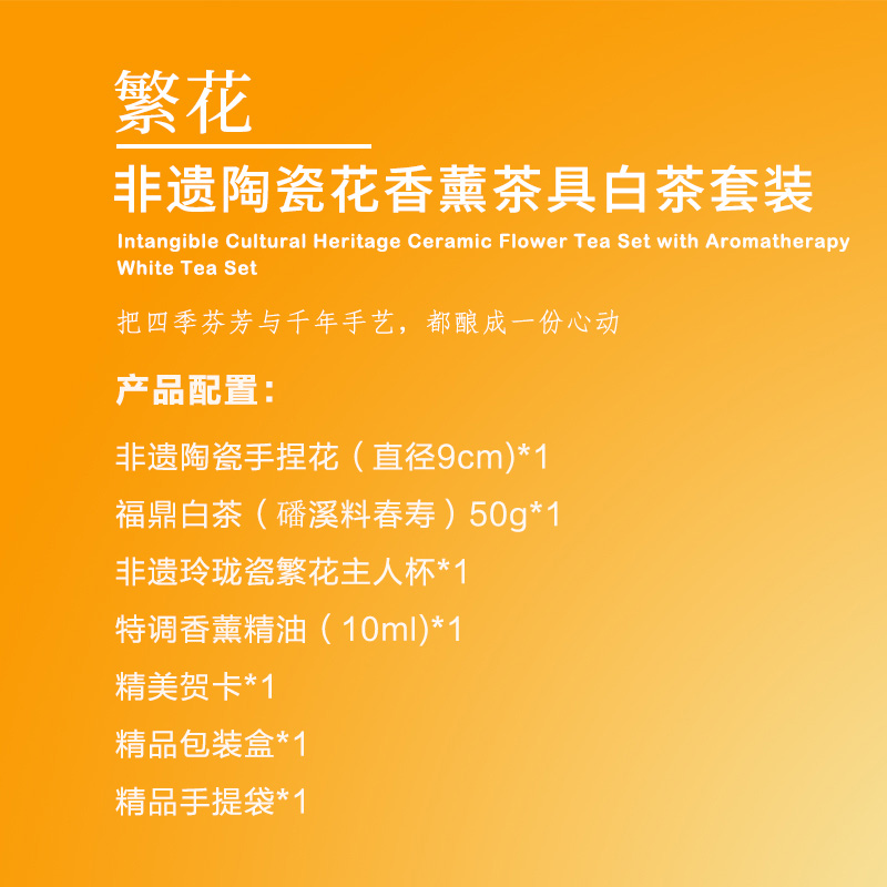 【产品配置】 福鼎白茶(50g)*1,菱烟非遗玲珑杯(80ml)*1,非遗手捏花摆件(直径90mm)*1 ,特调香薰精油*1 , 贺卡*1 ,礼盒*1,礼袋*1 【产品说明】 陶瓷手捏花”+“玲珑瓷”双非遗技艺,艺术与实用并存; 茶香、花香、器美,视觉、嗅觉、味觉三重享受; 精装礼盒+贺卡+手提袋,商务馈赠显尊贵; 手工捏制陶瓷花+非遗玲珑瓷杯,指尖生花,玲珑透月; 福鼎白茶+香薰精油,品茶养心,舒缓身心。