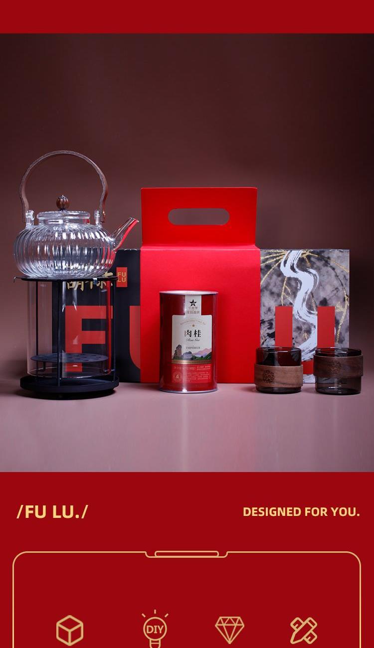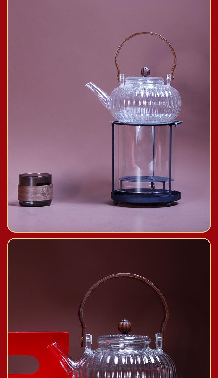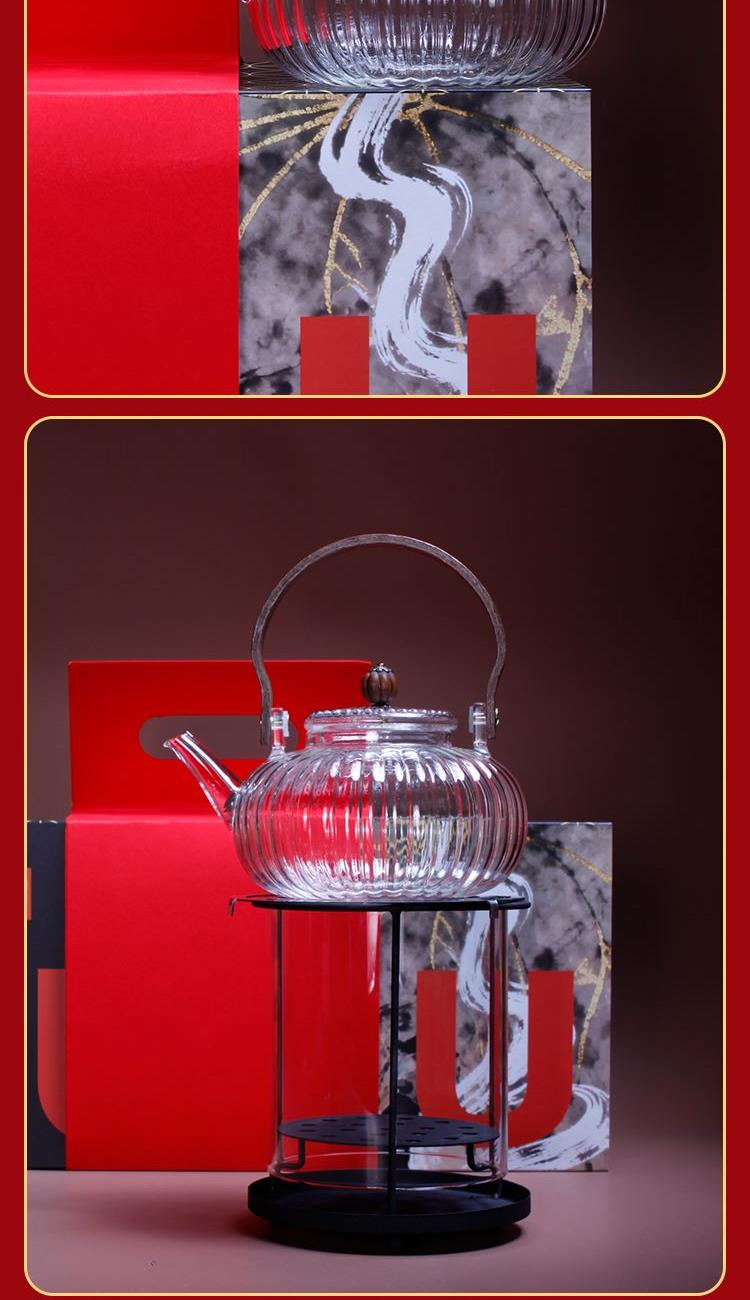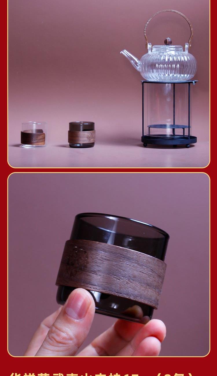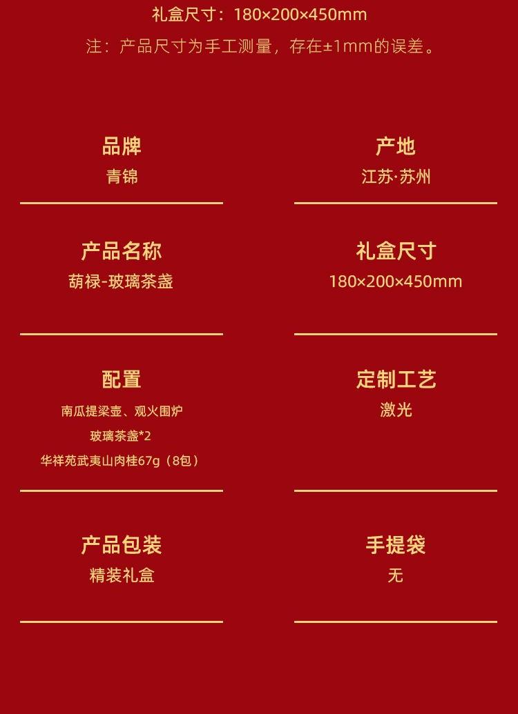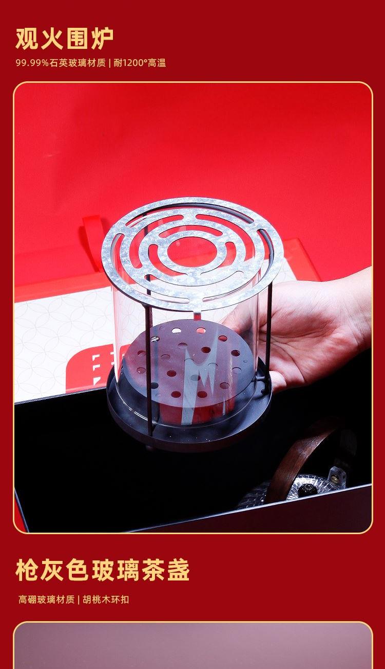1-南瓜提梁壶*1 900ml 尺寸约 15*11.5*7.5cm 胡桃木提梁/加厚高硼玻璃/茶水分离/耐冷耐热 2-观火围炉*1 99.99%石英玻璃材质 耐1200°高温 尺寸:16.2*14.5cm 3-枪灰色玻璃茶盏*2 150ml 6*6.5cm 高硼玻璃材质胡桃木环扣 4-华祥苑武夷山肉桂*1罐 67克8包 5-精装实用性礼盒*1 包装可做挂历
