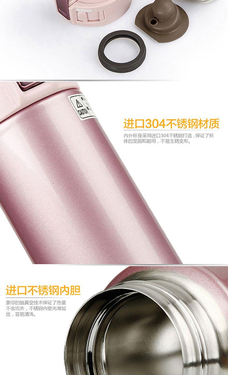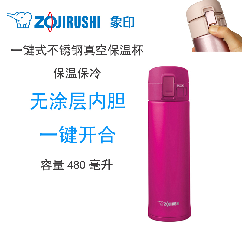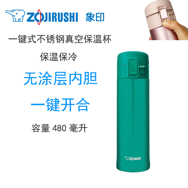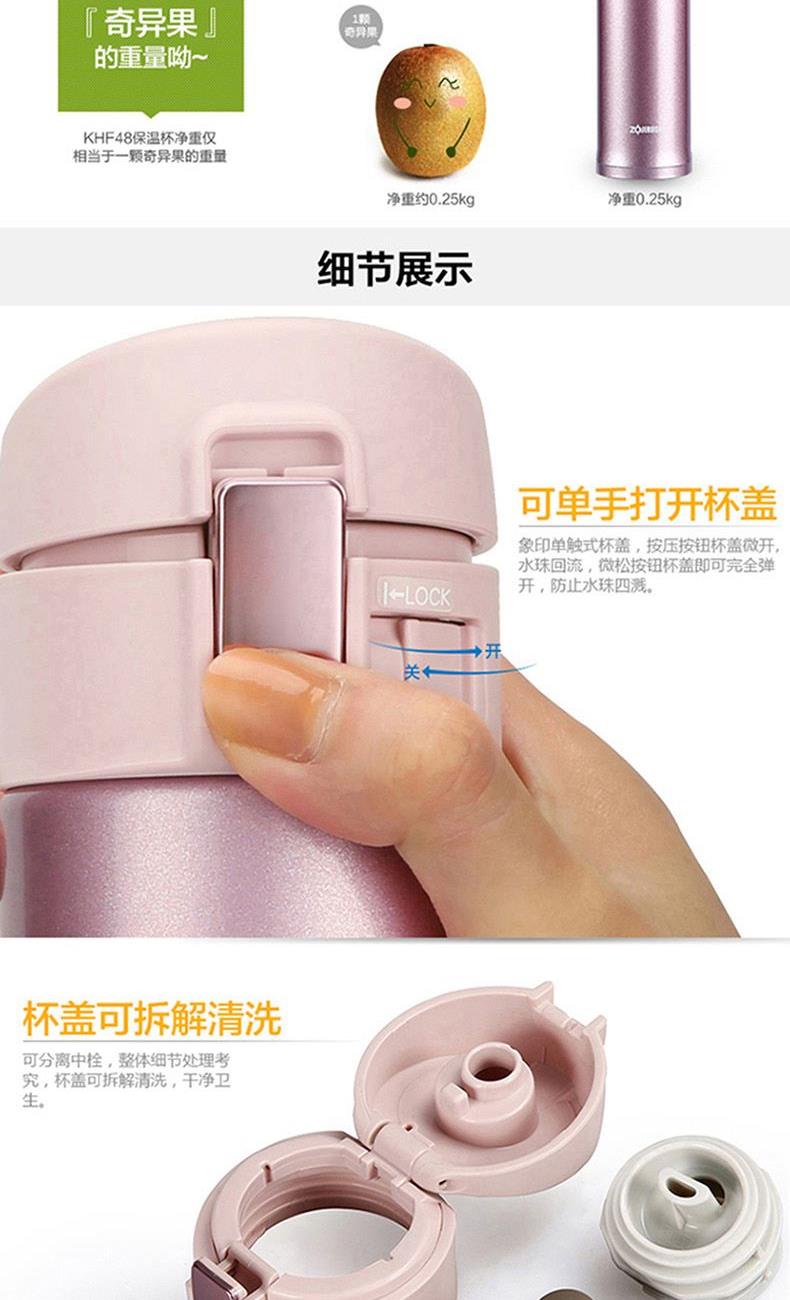 型号:SM-KHF48 颜色:深樱桃色PV,祖母绿色GC 容量:480ml 内胆涂层:无涂层 外形尺寸(宽深高):6.5×7×23cm 保温效率:86℃/1h 、 68℃/6h 保冷效率:9℃/6h 重量:0.25kg 产地:泰国 单手开盖,单触式杯盖,微松按钮杯盖即可摊开,防止水珠四溅 有可分离中栓,杯盖可拆洗,干净卫生 内外杯身进口304不锈钢材质,保证杯体坚固和耐用,不易生锈变形 进口不锈钢内胆,象印抽真空技术保证热量不会流失,内壁光滑易清洗 杯口螺纹咬合严密不易漏水