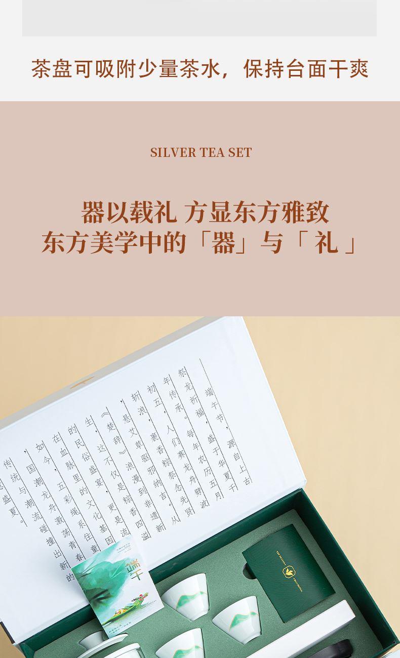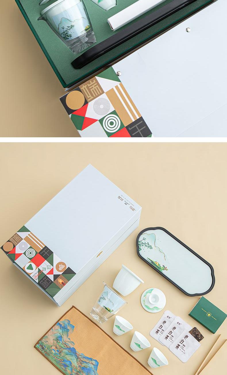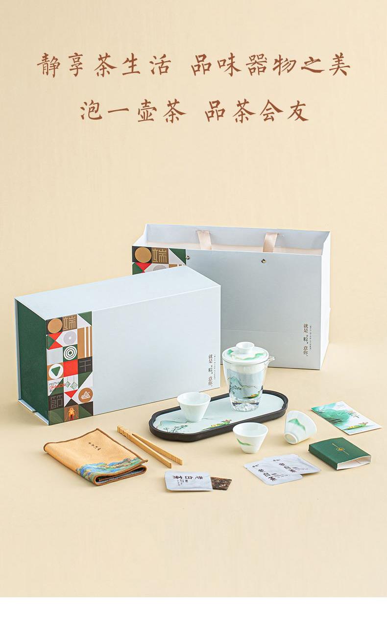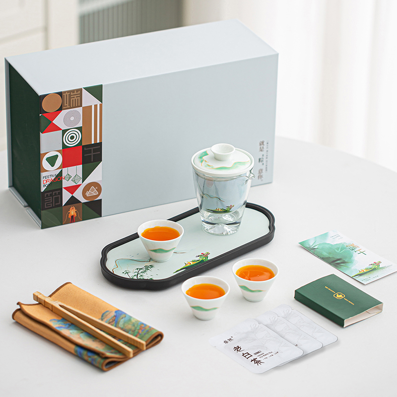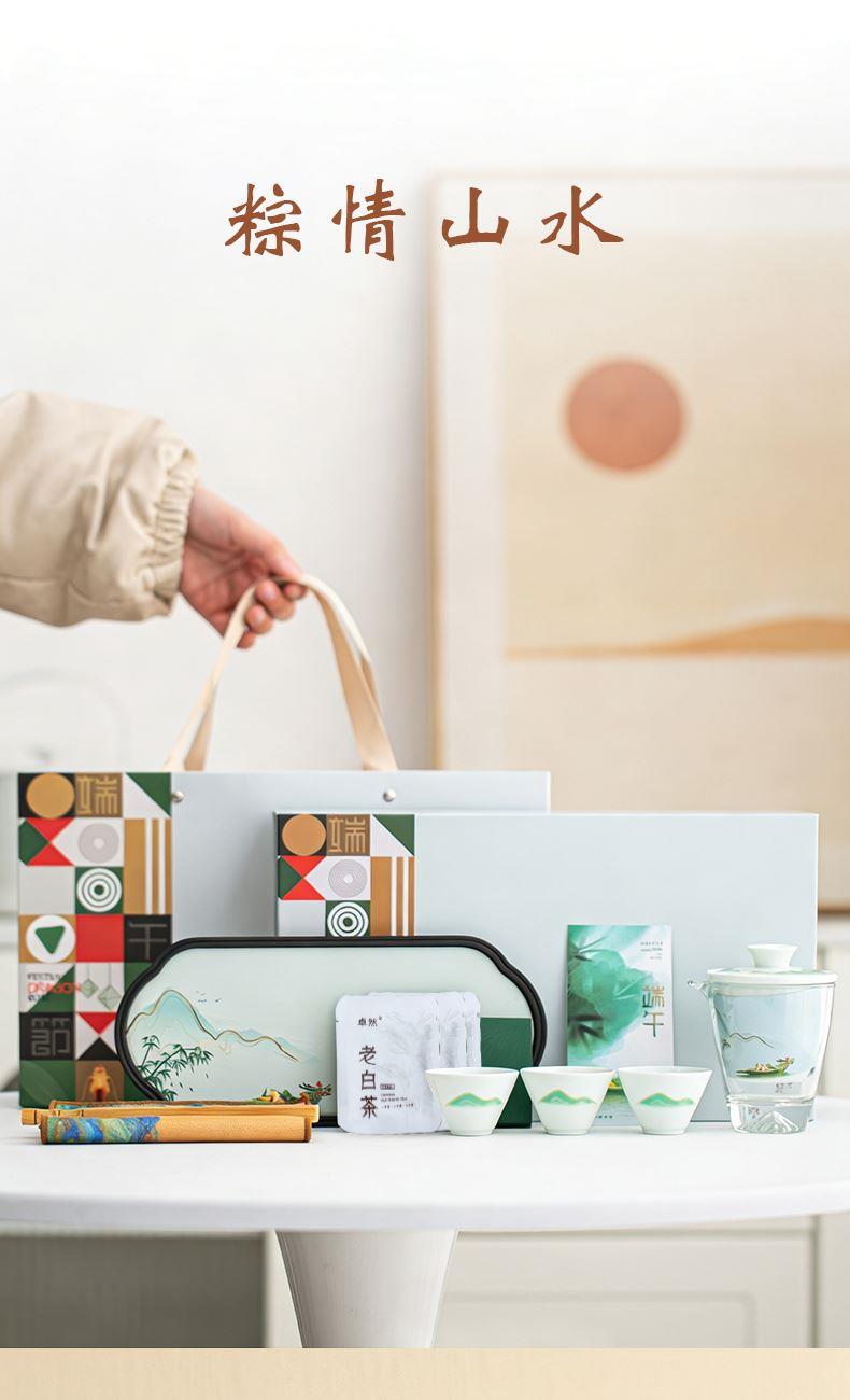 1.茶器融端午龙舟、粽韵与山水诗意于一体,将传统节俗与东方风雅凝于茶席之间,尽显格调与文化底蕴。 2.茶盘可吸附少量茶水,保持台面干爽,让每一刻品茗时光从容雅致、悠然舒心。 3.甄选2017年老白茶,枣香与药香交织,温润解腻,茶汤醇厚绵软,回甘悠长。 4.礼盒简约雅致,端午元素点缀,古韵融于现代审美,赠送亲友、馈赠客户,皆情意满满。 材 质:羊脂玉瓷、高硼硅玻璃 容 量:茶壶180ml、茶杯35ml 包装尺寸:L33  W19  H12.5cm 配 置:带胆茶壶一个,茶杯三个,干泡盘一个,2017年饼干形老白茶三片(共15克),茶巾一条,茶夹一个,贺卡一张,含手提袋礼盒包装。