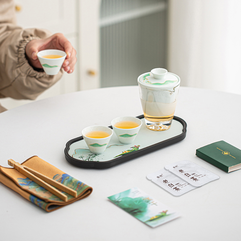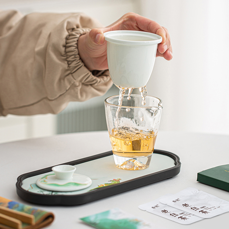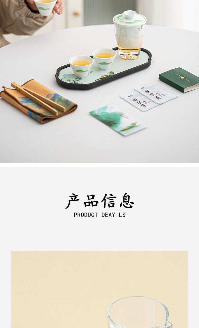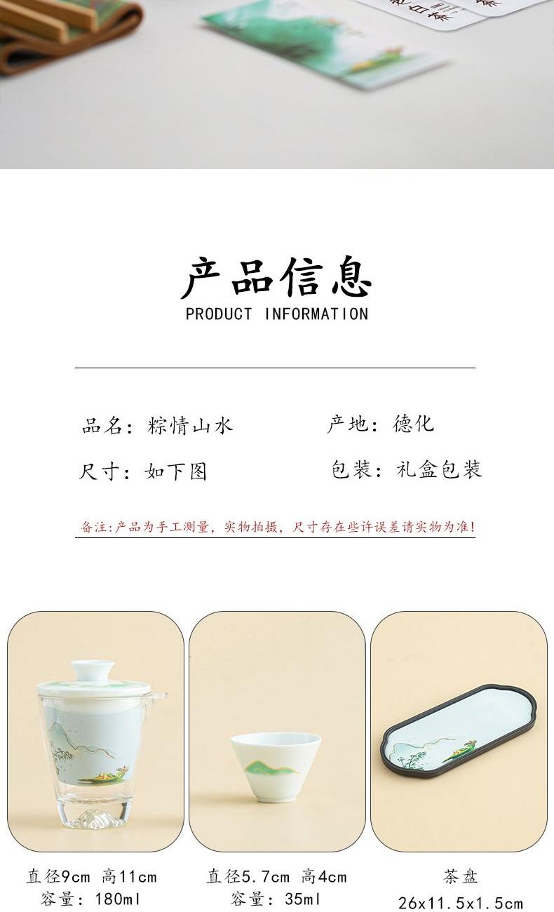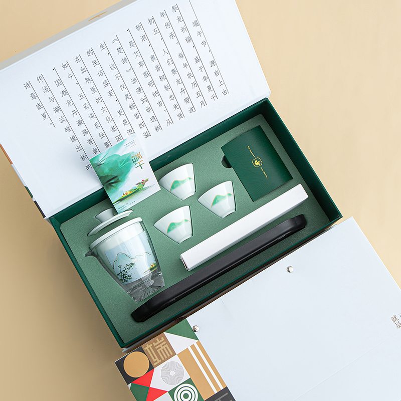 1.茶器融端午龙舟、粽韵与山水诗意于一体,将传统节俗与东方风雅凝于茶席之间,尽显格调与文化底蕴。 2.茶盘可吸附少量茶水,保持台面干爽,让每一刻品茗时光从容雅致、悠然舒心。 3.甄选2017年老白茶,枣香与药香交织,温润解腻,茶汤醇厚绵软,回甘悠长。 4.礼盒简约雅致,端午元素点缀,古韵融于现代审美,赠送亲友、馈赠客户,皆情意满满。 材 质:羊脂玉瓷、高硼硅玻璃 容 量:茶壶180ml、茶杯35ml 包装尺寸:L33  W19  H12.5cm 配 置:带胆茶壶一个,茶杯三个,干泡盘一个,2017年饼干形老白茶三片(共15克),茶巾一条,茶夹一个,贺卡一张,含手提袋礼盒包装。