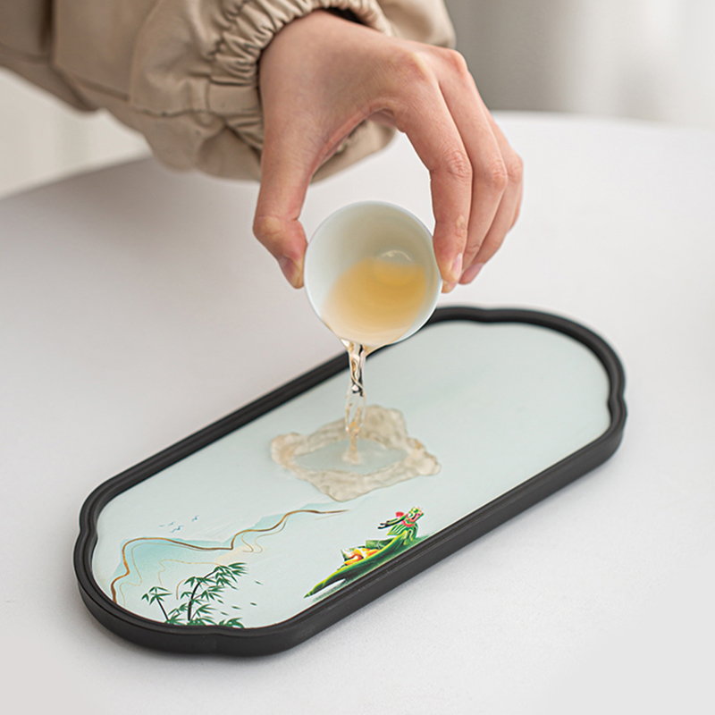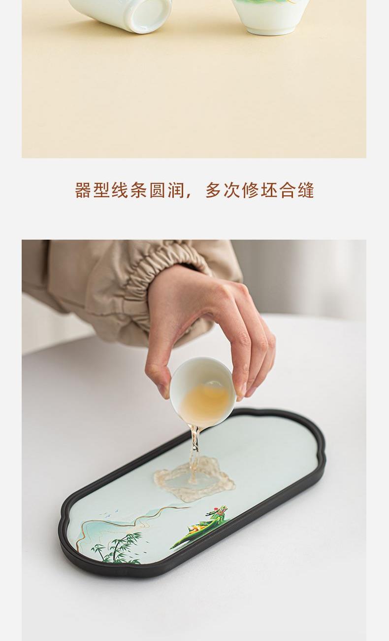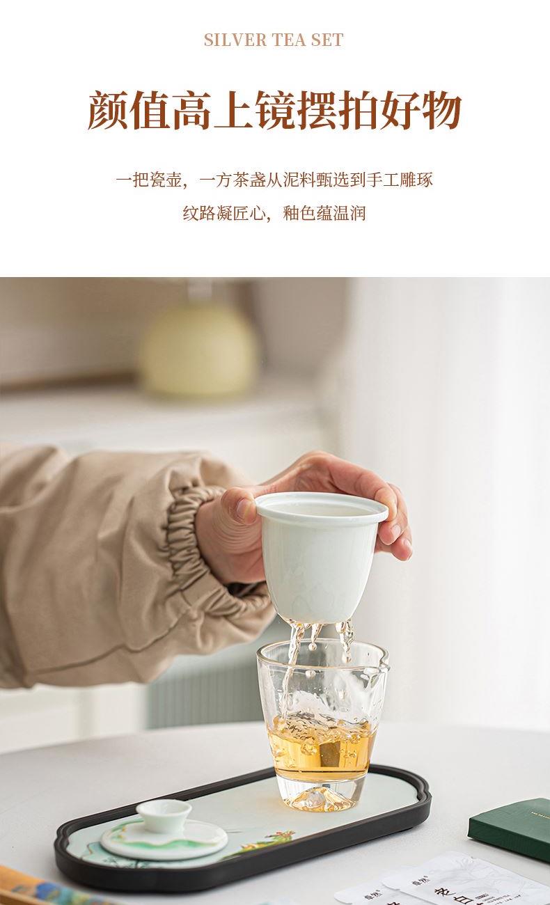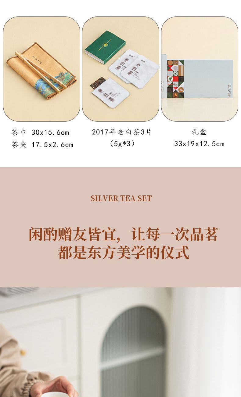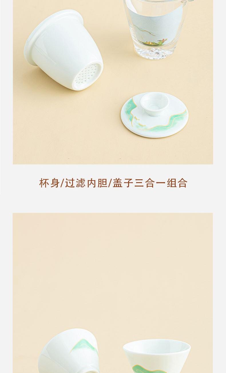1.茶器融端午龙舟、粽韵与山水诗意于一体,将传统节俗与东方风雅凝于茶席之间,尽显格调与文化底蕴。 2.茶盘可吸附少量茶水,保持台面干爽,让每一刻品茗时光从容雅致、悠然舒心。 3.甄选2017年老白茶,枣香与药香交织,温润解腻,茶汤醇厚绵软,回甘悠长。 4.礼盒简约雅致,端午元素点缀,古韵融于现代审美,赠送亲友、馈赠客户,皆情意满满。 材 质:羊脂玉瓷、高硼硅玻璃 容 量:茶壶180ml、茶杯35ml 包装尺寸:L33  W19  H12.5cm 配 置:带胆茶壶一个,茶杯三个,干泡盘一个,2017年饼干形老白茶三片(共15克),茶巾一条,茶夹一个,贺卡一张,含手提袋礼盒包装。