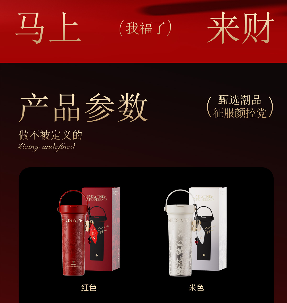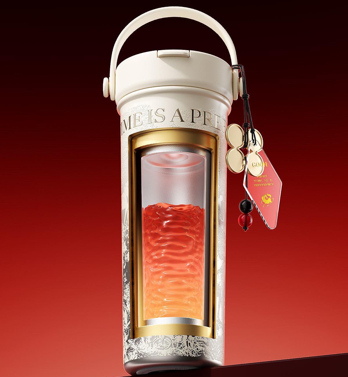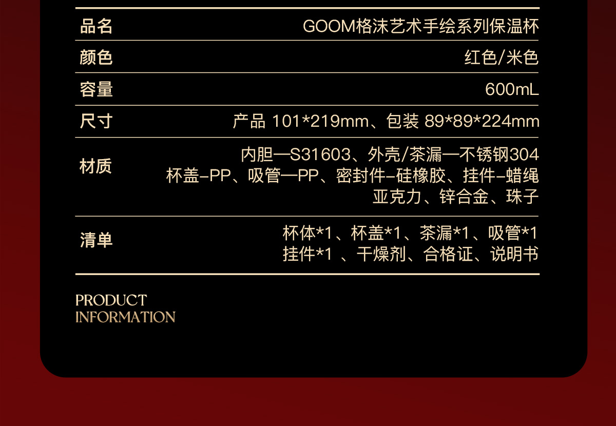 型 号:GM-23AW-B7 颜 色:添鸿运(红色) / 丰米运(米色) 材 质:内胆一奥氏体不锈钢S31603 外壳/茶漏一奥氏体不锈钢S30408 吸管-PP聚丙烯(丙烯均聚物) 杯盖-PP聚丙烯(丙烯与乙烯的聚合物) 密封件-硅橡胶,挂件-蜡绳、亚克力、锌合金珠子 容 量:600ml 单杯尺寸:101*219mm 外箱尺寸:89*89*247mm 1、一杯双饮:痛快敞口喝、精致吸管口不花妆,茶仓泡饮方便 2、密封防漏:360密封,安心无忧,多种场景放心畅饮 3、安心材质:食品级316内胆、长效锁温锁冷 4、黄金容量:600ml贴心续航,满足日常饮水需求! 5、便携随行:自带硅胶提手,出行更便捷 6、来财杯饰:细碎金光点缀,寓意美好