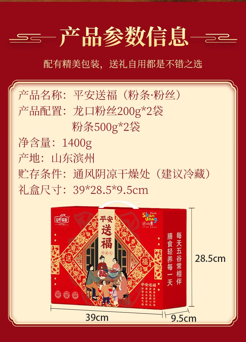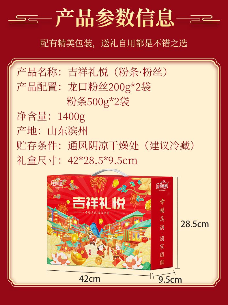 净含量:1400g 产品规格配置:龙口粉丝200g*2袋粉条500g*2袋 盒尺寸:42*9.5*28.5cm 箱体积:0.077方 箱尺寸:59.5*43*30 箱重量:12.55kg
