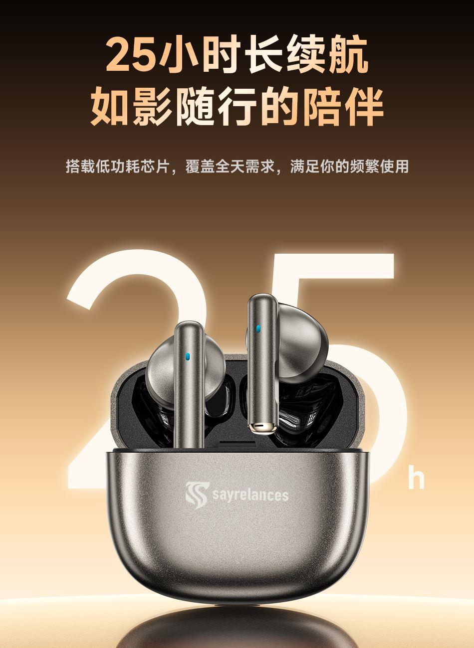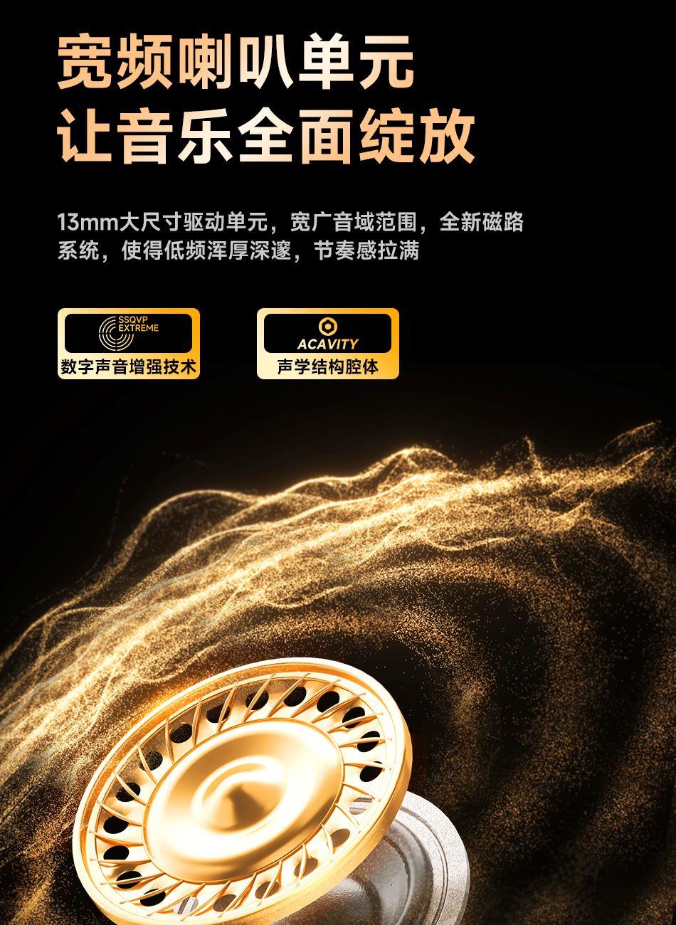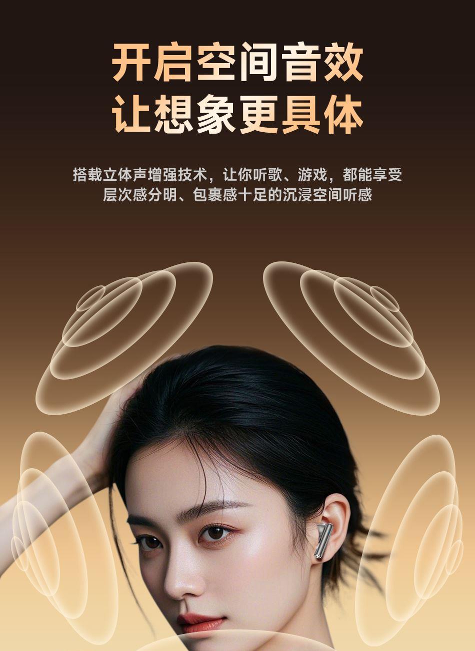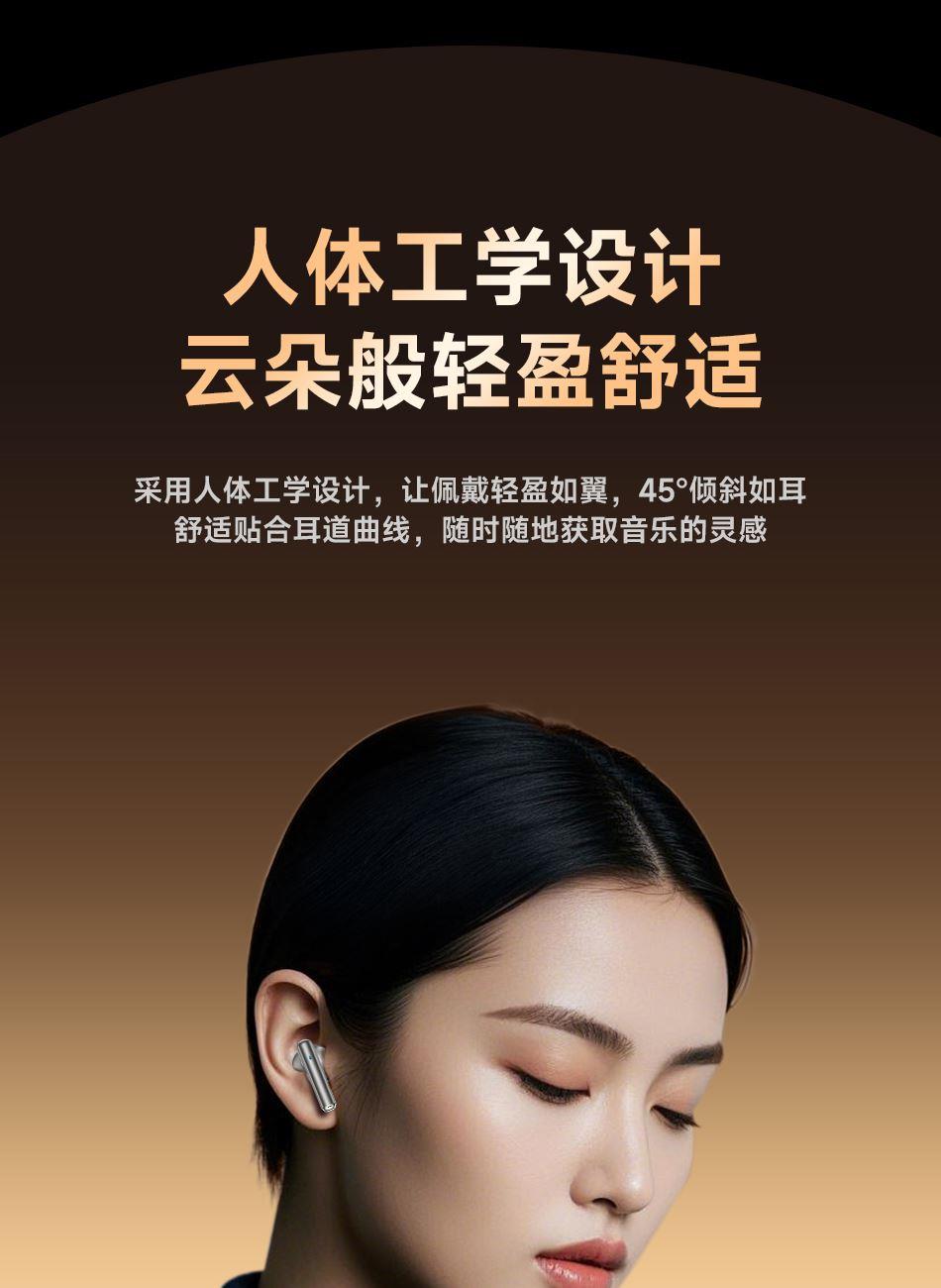 1.用人体工 学设计让佩戴轻盈如翼 45°倾斜如耳舒适贴合耳道曲线; 2.13mm大尺寸驱动单元,宽广音域范围,全新磁路系统,使得低频浑厚深邃,节奏感拉满; 3.搭载立体声增强技术,让你听歌、游戏,都能享受层次感分明、包裹感十足的沉浸空间听感; 4.25小时长续航如影随行的陪伴,搭载低功耗芯片,覆盖全天需求; 5.蓝牙5.4传输延迟低,快响应,秒响应秒连上,游戏/观影都流畅十足;