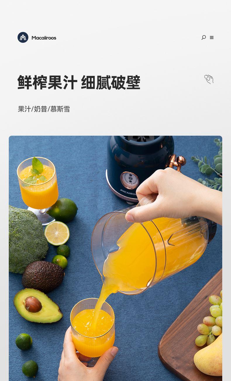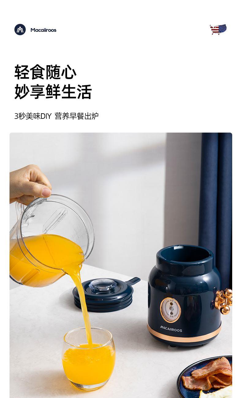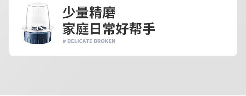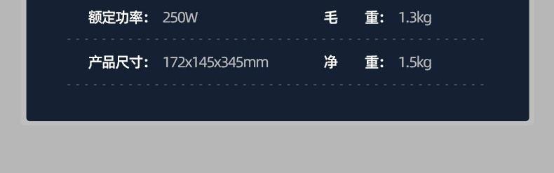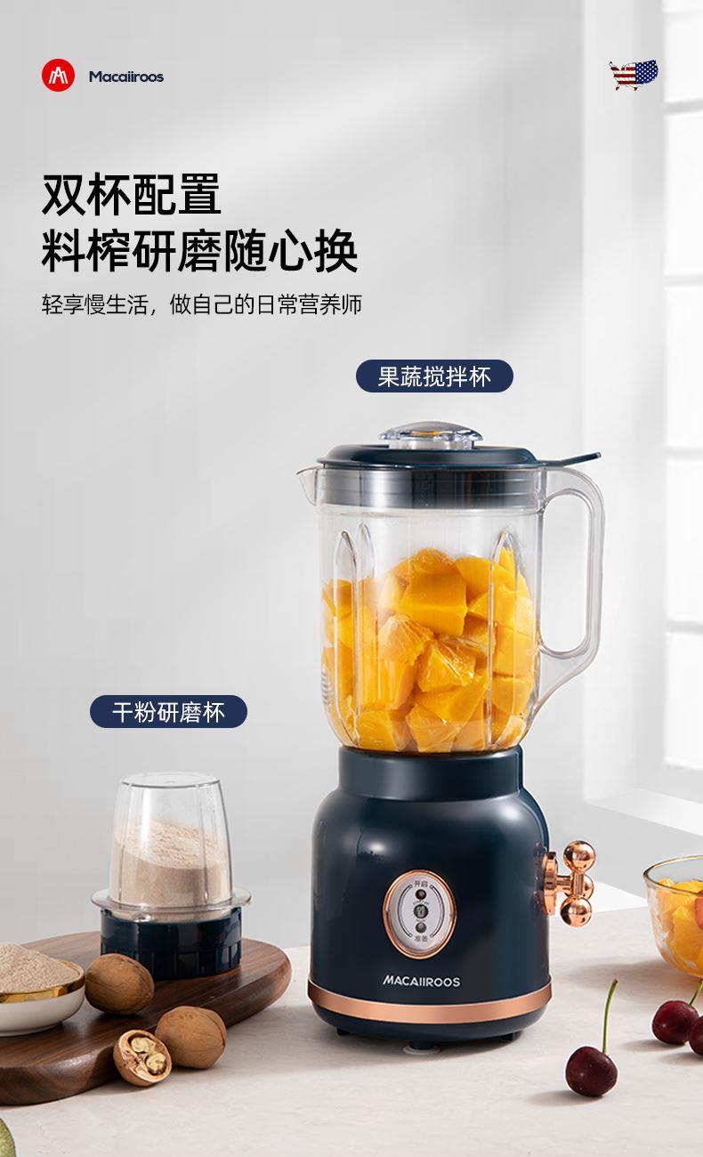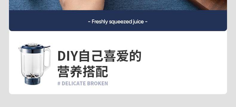 额定功率:250W 额定容量:1.5L 额定电压:220V~ 额定频率:50Hz 产品净重:1.3kg 产品毛重:1.5kg 整箱重量:13.2kg 装 箱 数:8台/箱 产品尺寸:172x145x345mm 彩盒尺寸:275x160x270mm 产品条码:6971537237501 外箱尺寸:665x290x565mm 一机双杯集榨汁搅拌、辅食、干粉研磨功能; 高速电机高速强劲动力低噪音电机,3档可调,轻松旋转操作; 不锈钢刀头&健康杯体精钢4维刀组,加厚PC耐冲击搅拌杯体,透明卫生; 高颜值机体美式复古机体高颜值,自带保护锁扣,安全开关断电保护。