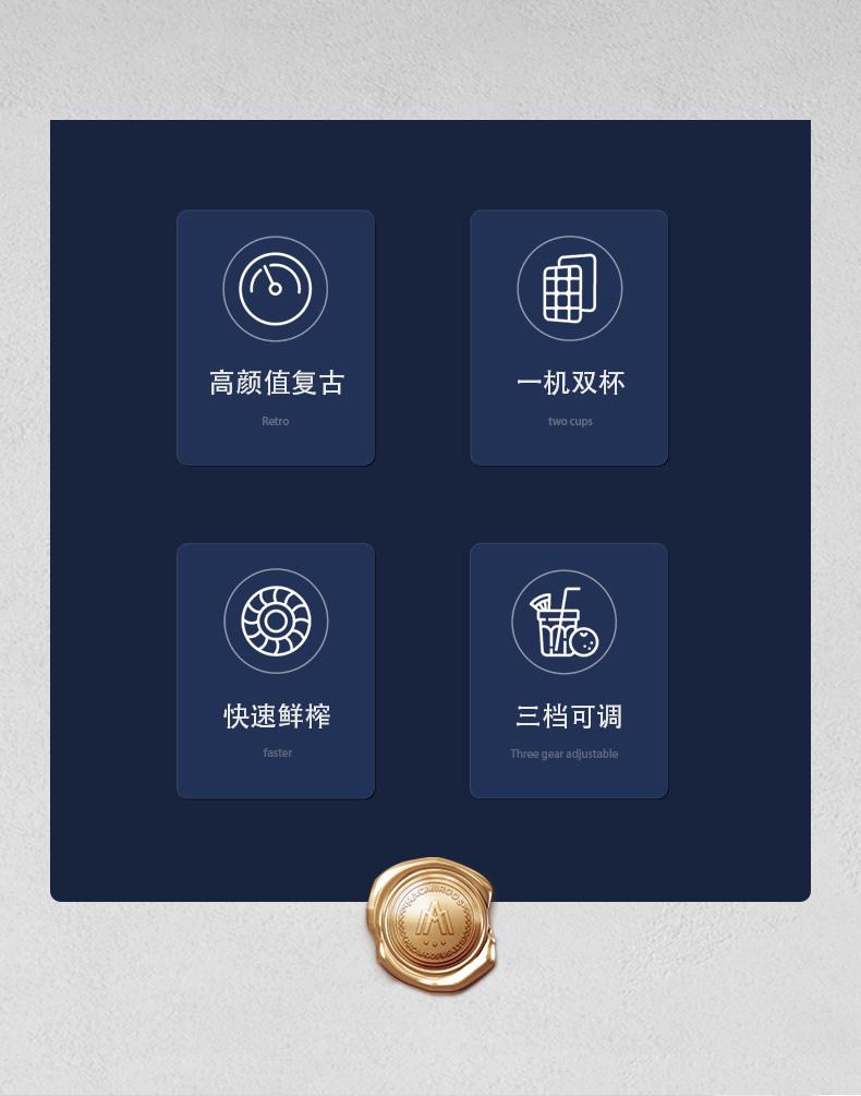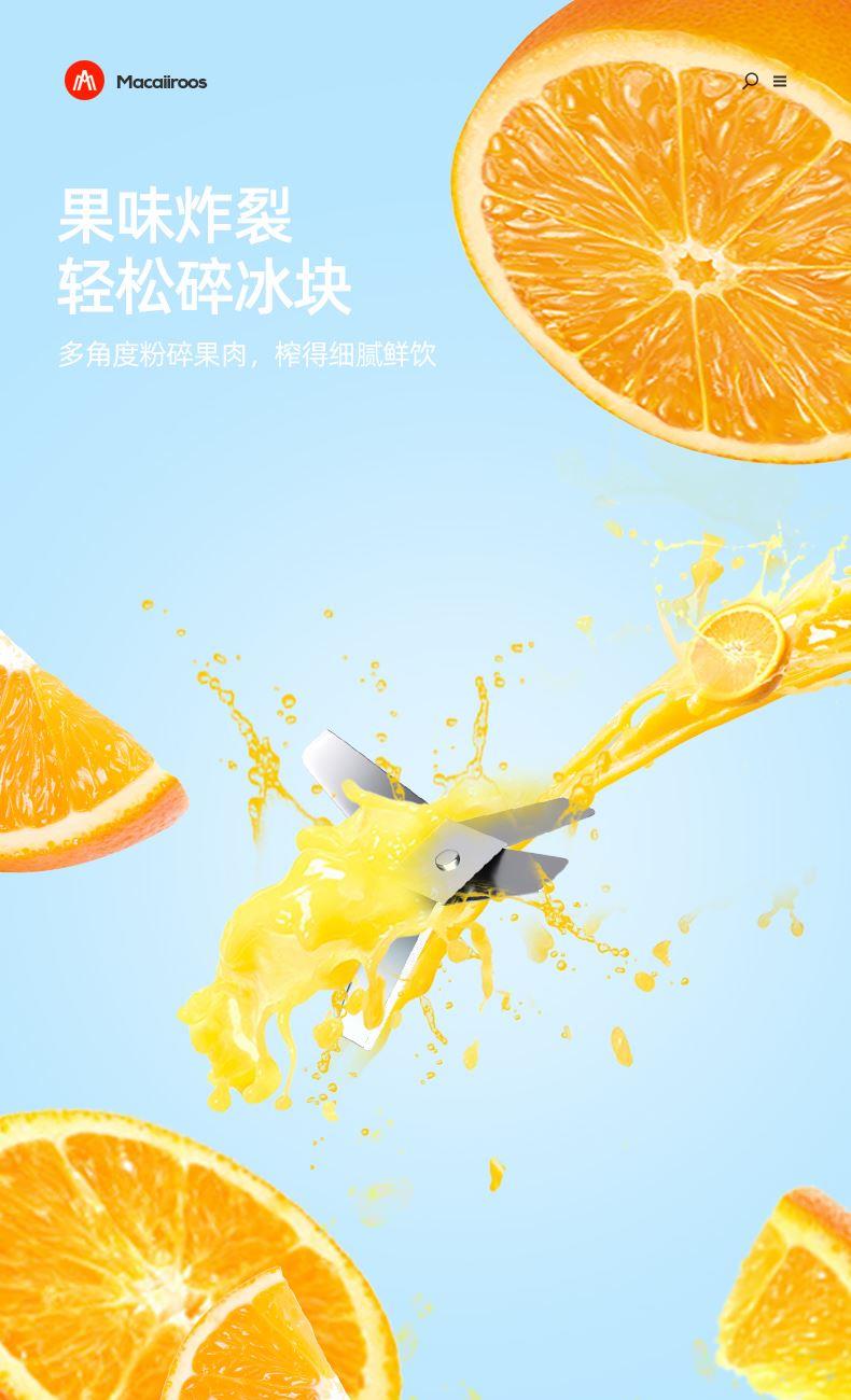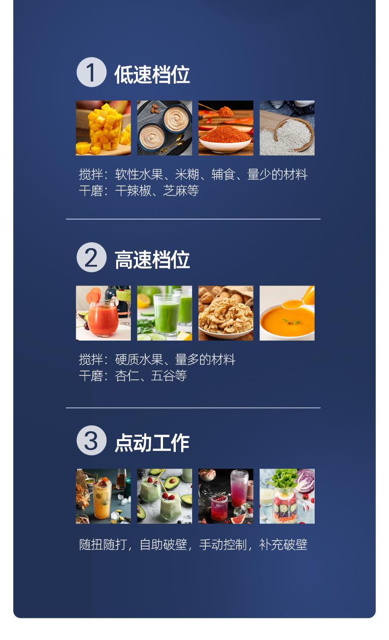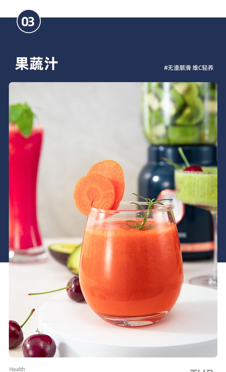 额定功率:250W 额定容量:1.5L 额定电压:220V~ 额定频率:50Hz 产品净重:1.3kg 产品毛重:1.5kg 整箱重量:13.2kg 装 箱 数:8台/箱 产品尺寸:172x145x345mm 彩盒尺寸:275x160x270mm 产品条码:6971537237501 外箱尺寸:665x290x565mm 一机双杯集榨汁搅拌、辅食、干粉研磨功能; 高速电机高速强劲动力低噪音电机,3档可调,轻松旋转操作; 不锈钢刀头&健康杯体精钢4维刀组,加厚PC耐冲击搅拌杯体,透明卫生; 高颜值机体美式复古机体高颜值,自带保护锁扣,安全开关断电保护。