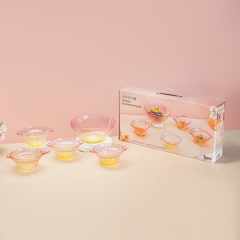 货号:XH-L5 汐花五件套 规格:12套 组合:玻璃大碗*1(1000ml)小碗*4(250ml) 简介:汐花五件套,由一只1000ml的玻璃大碗与四只250ml的玻璃小碗组成,柔和浪漫的粉色与黄色渐变色调,宛如春日里绽放的花朵,洋溢着满满的少女心与温馨感,无论是摆放在现代简约的餐桌,还是温馨复古的厨房角落,都能瞬间成为视觉焦点,为空间增添一抹亮色。 彩盒尺寸:43.4*8.3*22.5CM 外箱尺寸:52.2*44.6*46.6CM 重量:20.2KG