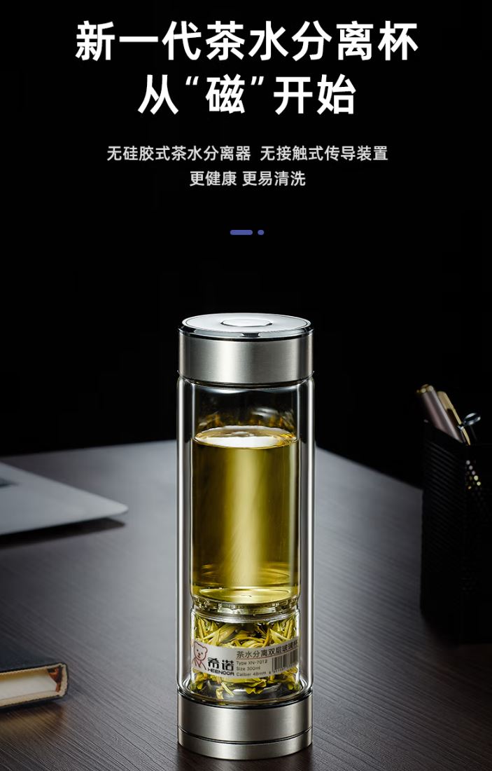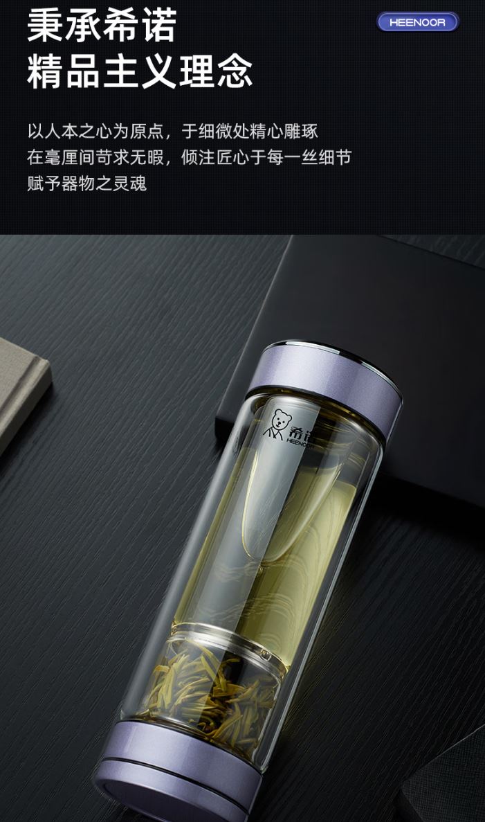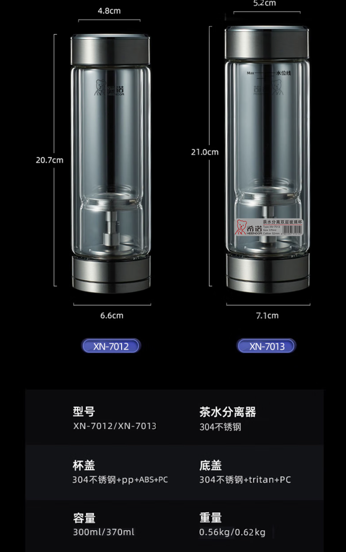 容 量 XN-7013:370ml 规格(mm) XN-7013:52(杯口直径)x71(直径)×207(高度) 杯 体 双层高硼硅玻璃 杯 盖 食品级PP、304不锈钢 滤 网 304不锈钢、食品级硅胶 密封圈 食品级硅胶 重 量 XN-7013:0.62kg 颜 色 XN-7013:烟灰、本色、紫罗兰