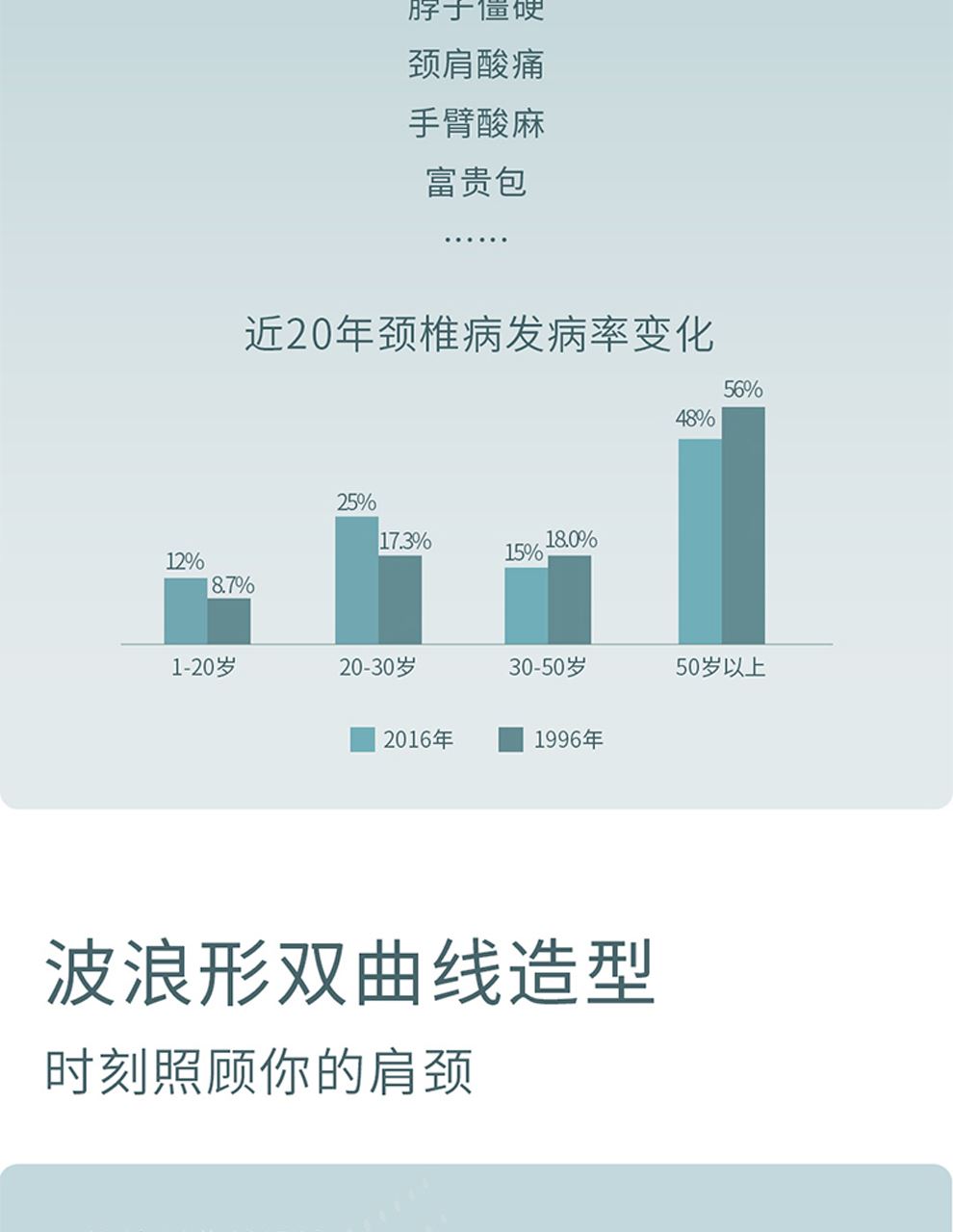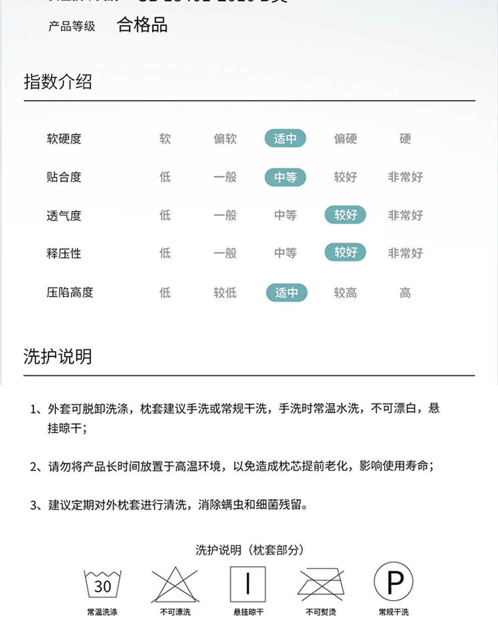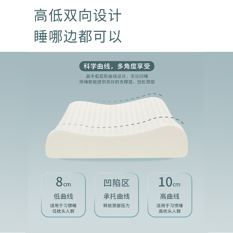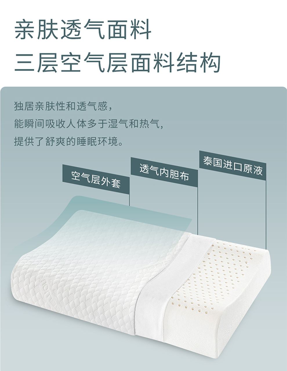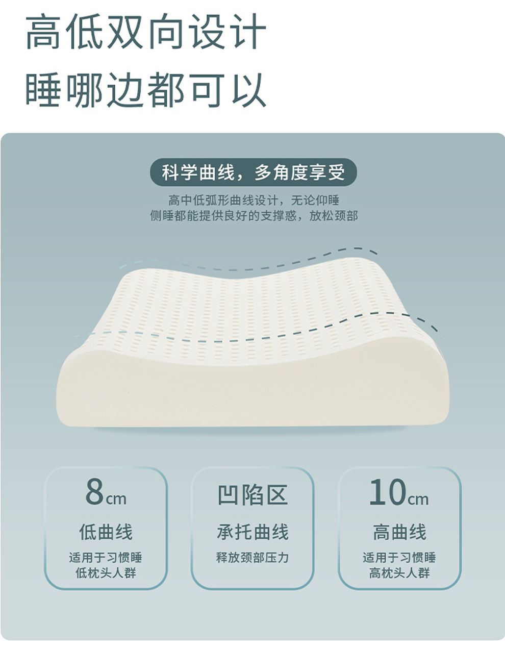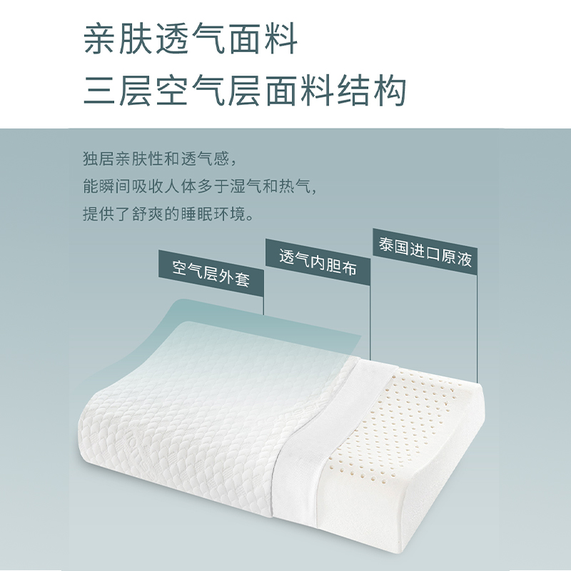 1.波浪形双曲线造型:深度考量人体工程学,任意角度都能贴合颈椎曲线,时刻照顾你的肩颈 2.高低双向设计:高中低弧形曲线设计,无论仰睡侧睡都能提供良好的支撑惑,放松颈部 3.三层空气层面料结构:兼具亲肤性和透气感,能瞬间吸收人体多余的湿气和热气,提供舒爽的睡眠环境 4.泰国天然乳胶:具有柔嫩触感和高效回弹性能,无论平躺还是翻身,都能迅速响应头部变换,更灵敏地贴合头颈。而且天然乳胶蛋白具有抑制细菌和防螨效果,守护身体健康 外层面料:70%聚酷纤维,30%再生纤维素纤维 内层面料:聚酯纤维 枕芯:天然乳胶 包装方式:礼盒装 规格尺寸:60*40*10cm