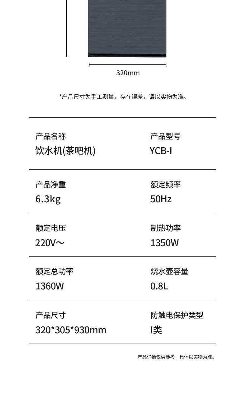 额定电压:220V~ 额定功率:1360W 额定频率:50Hz 容 量:养生壶900ML,烧水壶800ML 材 质:龙头:ABS,面板:钢化玻璃 烧水壶外观、玻璃壶把手、侧板:PP,玻璃壶:高硼硅玻璃,烧水壶内胆:304不锈钢 触控面板,操作简单 旋转水龙头,取水方便快捷 24H长效保温,畅想温热水 收纳储物柜,方便水杯茶叶收纳 大容量储水更多,下置换水省心省力