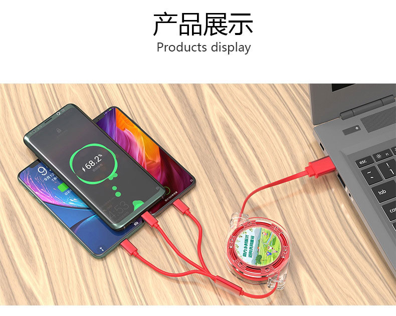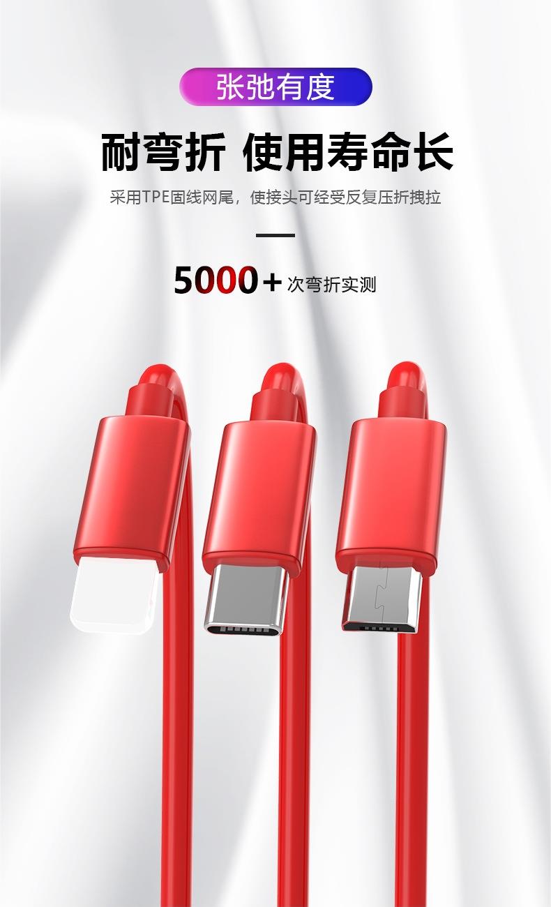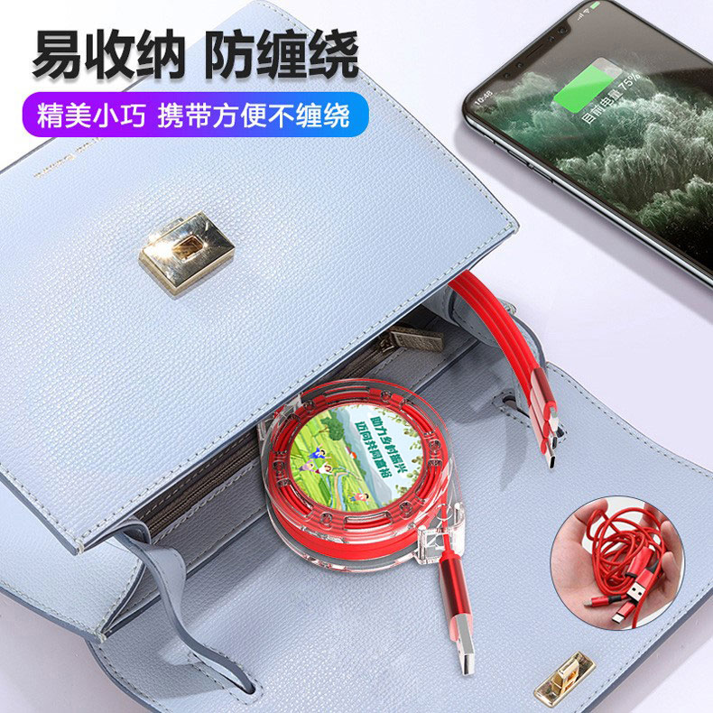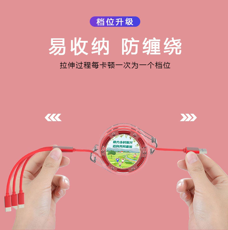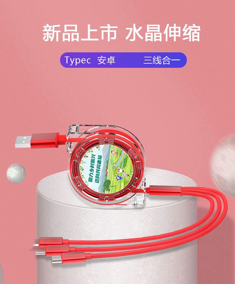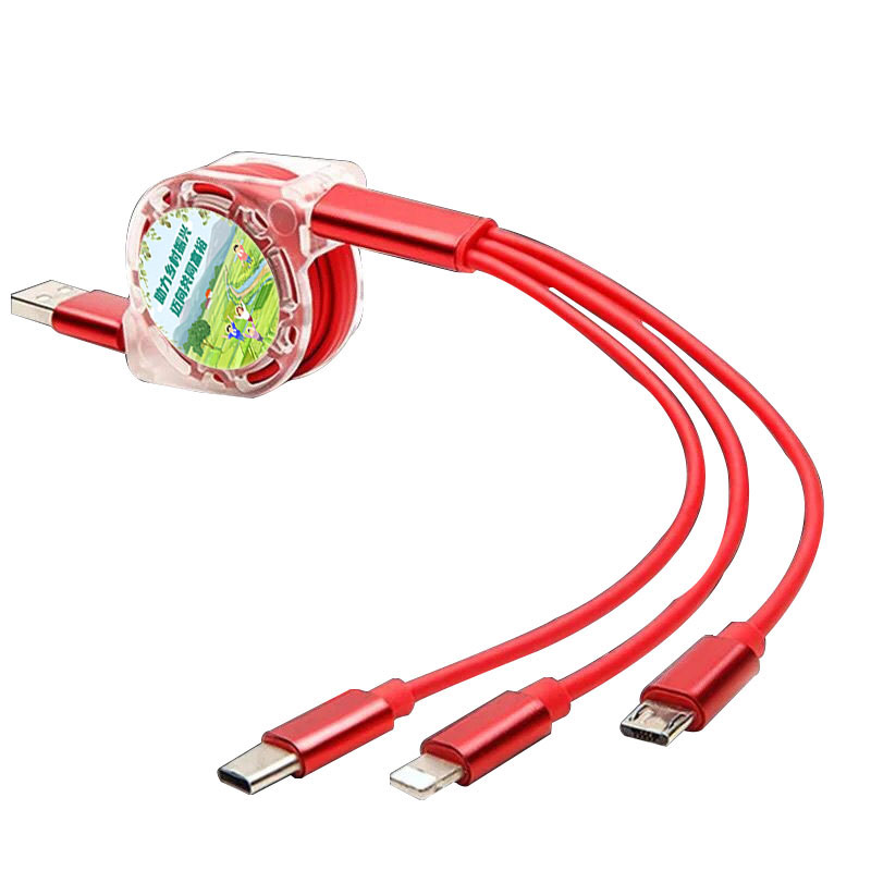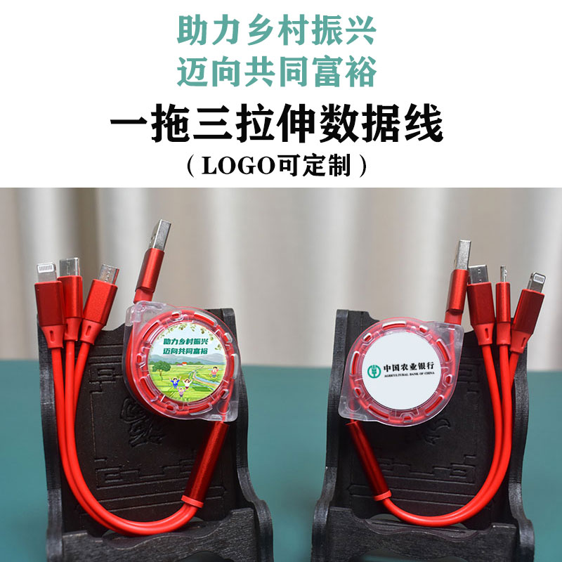 数据线长度:120cm 分线接头数量:一托三 颜色:红色 材料:硅胶+铝金合头 适用机型:苹果/安卓/Type-C • 一拖三数据线:可充电任何手机,数码设备接口。 • 自由伸缩,小巧便携 • 正面财神,背面可定制LOGO宣传 • 经济实用性价比高 出货速度快