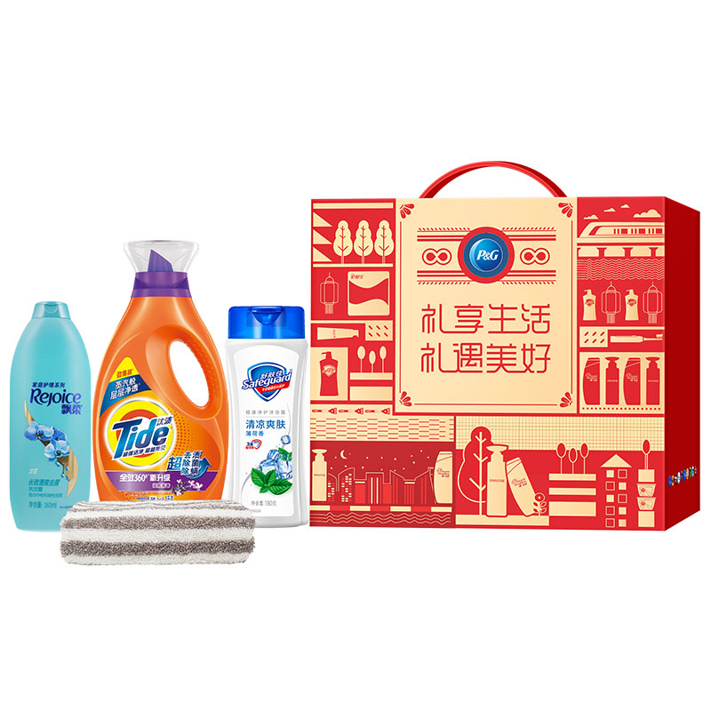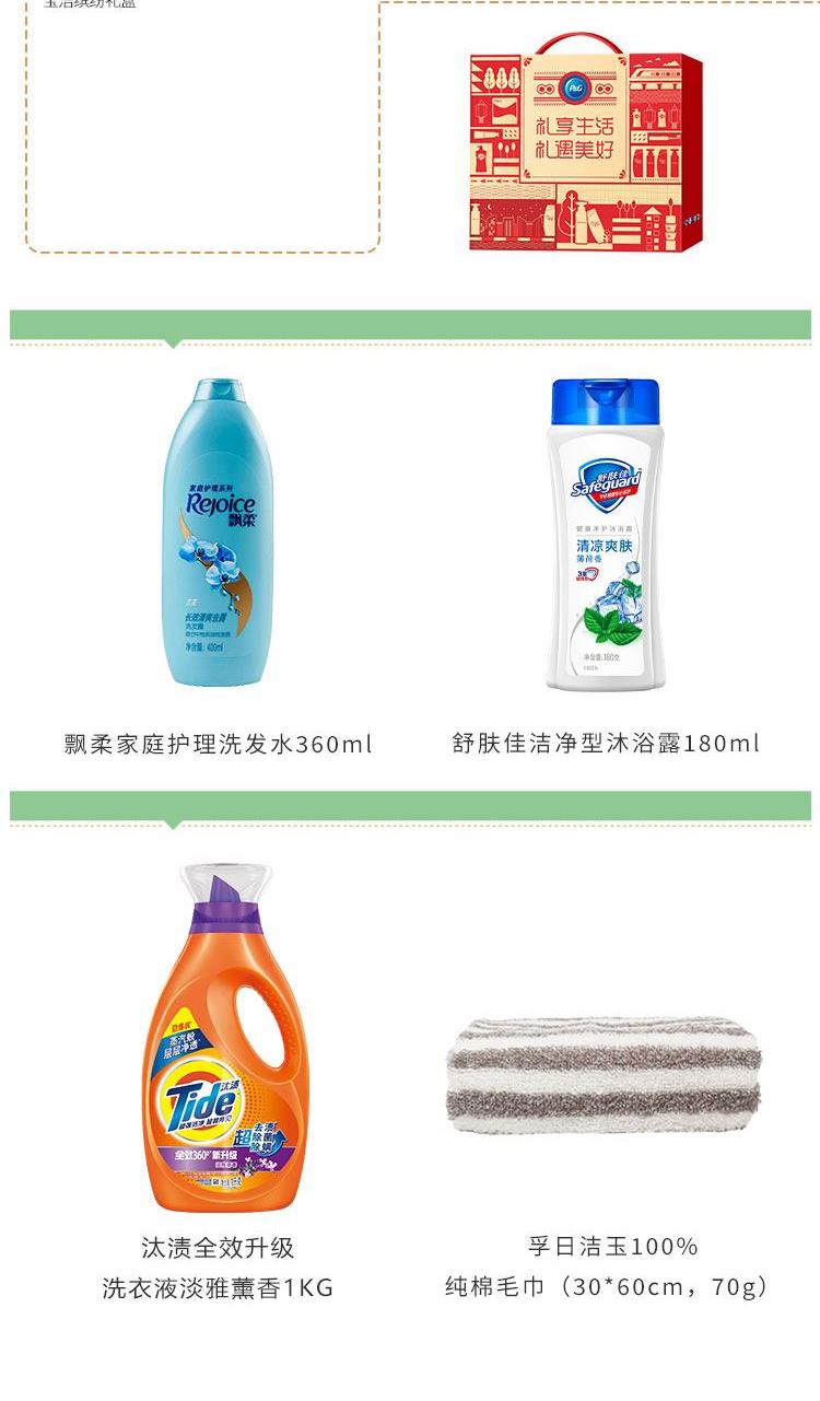 飘柔家庭护理洗发水360ml 舒肤佳洁净型沐浴露180ml 汰渍全效升级洗衣液淡雅薰香1KG 孚日洁玉纯棉毛巾(30*60cm,70g) 宝洁缤纷礼盒