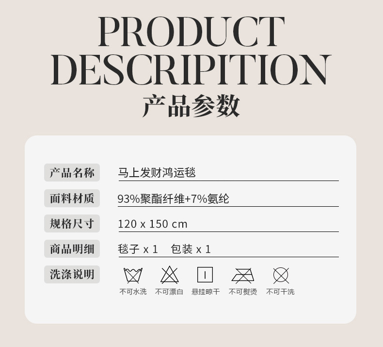 商品参数: 面料:93%聚酯纤维 7%氨纶 规格:120*150cm 毛重:1kg 礼盒尺寸:42.5*35*11cm 纸箱尺寸:55.5*42.5*36.5cm