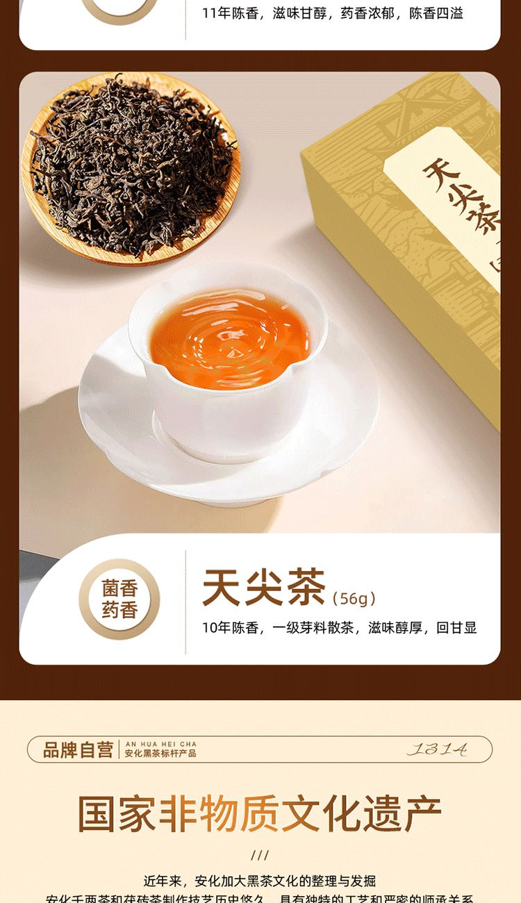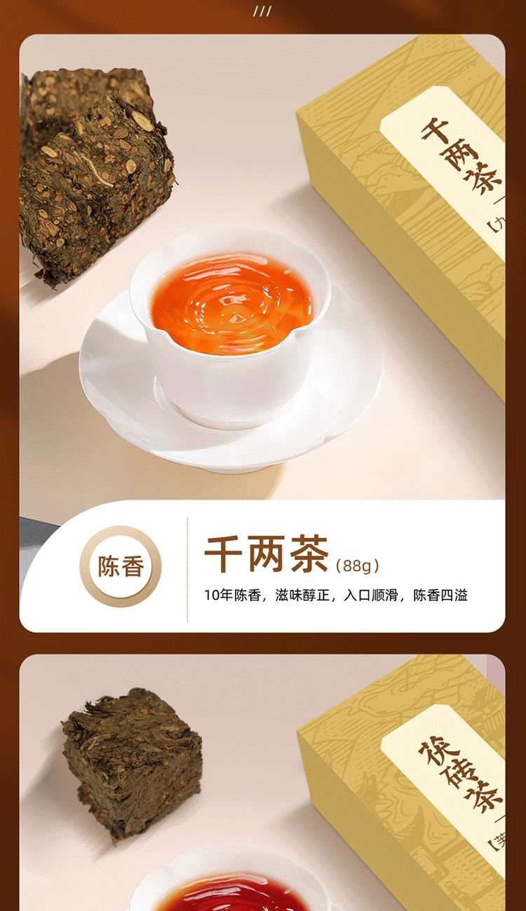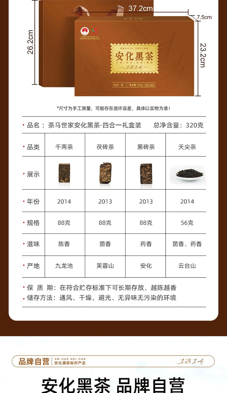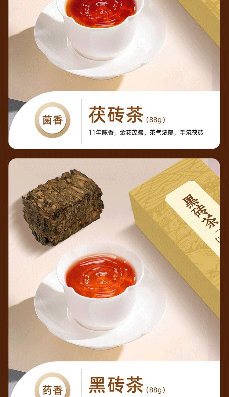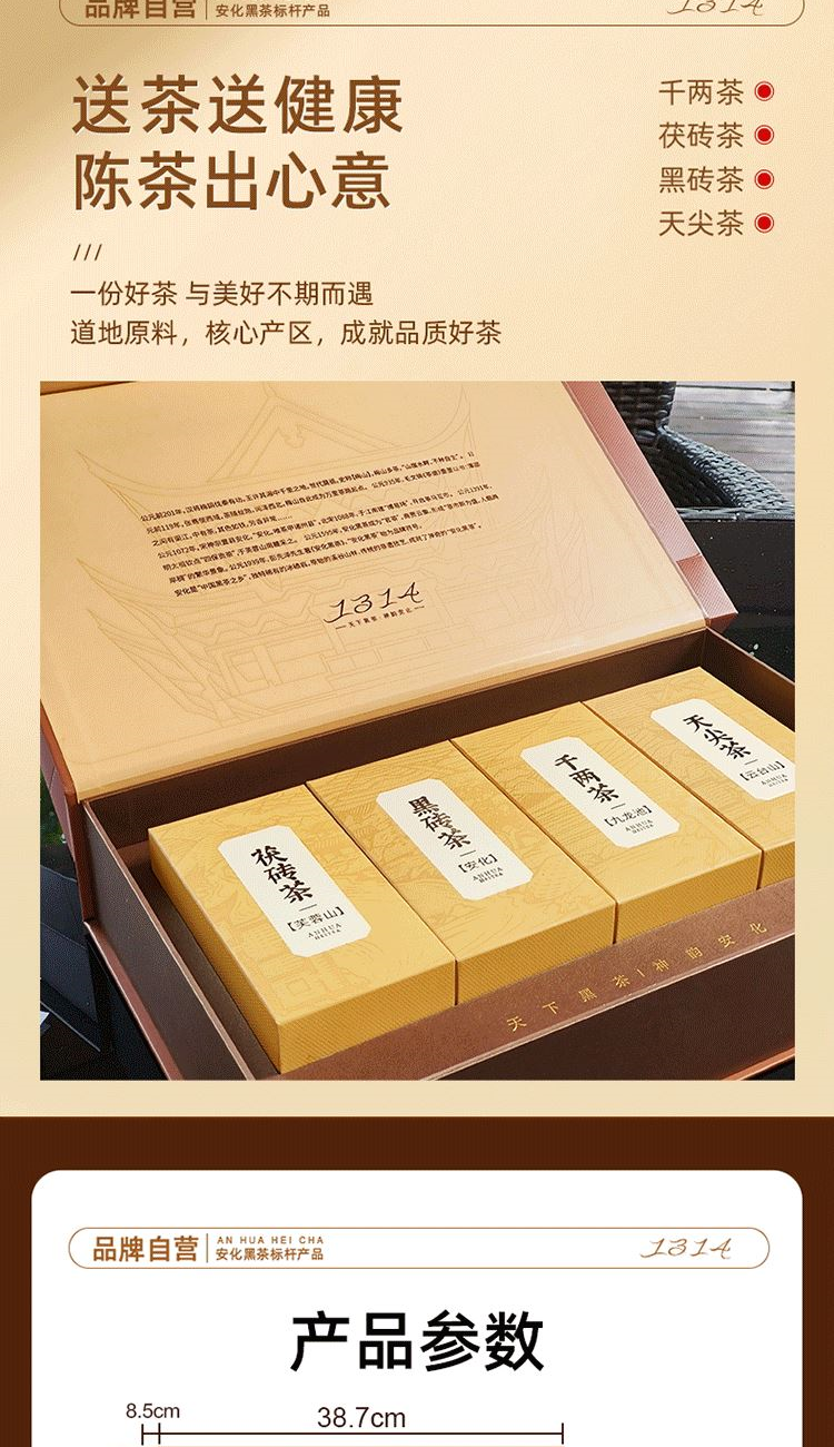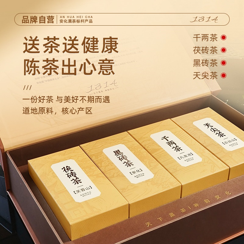 保质期:长期储存 类别:茯砖 包装形式:礼盒装 包装清单:茯砖88g*1,千两88g*1,黑砖88g*1, 天尖56g*1 储存方法:防潮 干燥 防异味 采摘要求:一芽两叶 一芽三叶 一芽四叶 卖点: 1、源自安化黑茶核心产区生态茶园,平均海拔800米以上,自然环境优,适合茶树生长。 2、陈年老料,香气浓厚,滋味醇正,经久耐泡。 3、一盒品鉴4种安化代表黑茶 ①千两:14年安化九龙池老料,由非遗传统工艺压制而成,金花密布,菌香浓郁,内含物质丰富,口感醇正甘润,药香; ②天尖:14年安化云台山陈年老料,叶底匀整成型,药香/参香,显茶韵,浓香耐泡,醇厚滑爽。 ③黑砖:13年安化核心产区陈年老料,含适量细嫩茶梗,入口爽滑回甘,适口性强; ④茯砖:13年安化芙蓉山老料,木仓自然陈化,叶片油润,金花密布,菌香浓郁,滋味醇正滑爽,有回甘; 4、寓意“一生一世”吉祥美好。 5、独立小袋装,即开即饮,便携耐泡,旅行陪伴,美味随享。