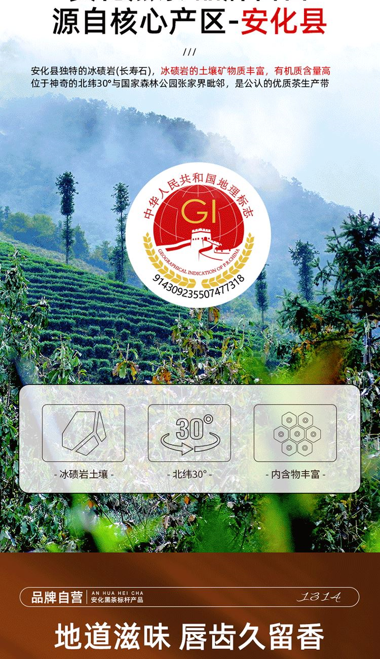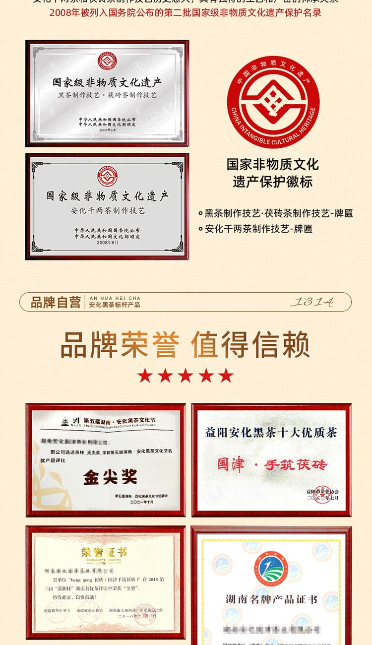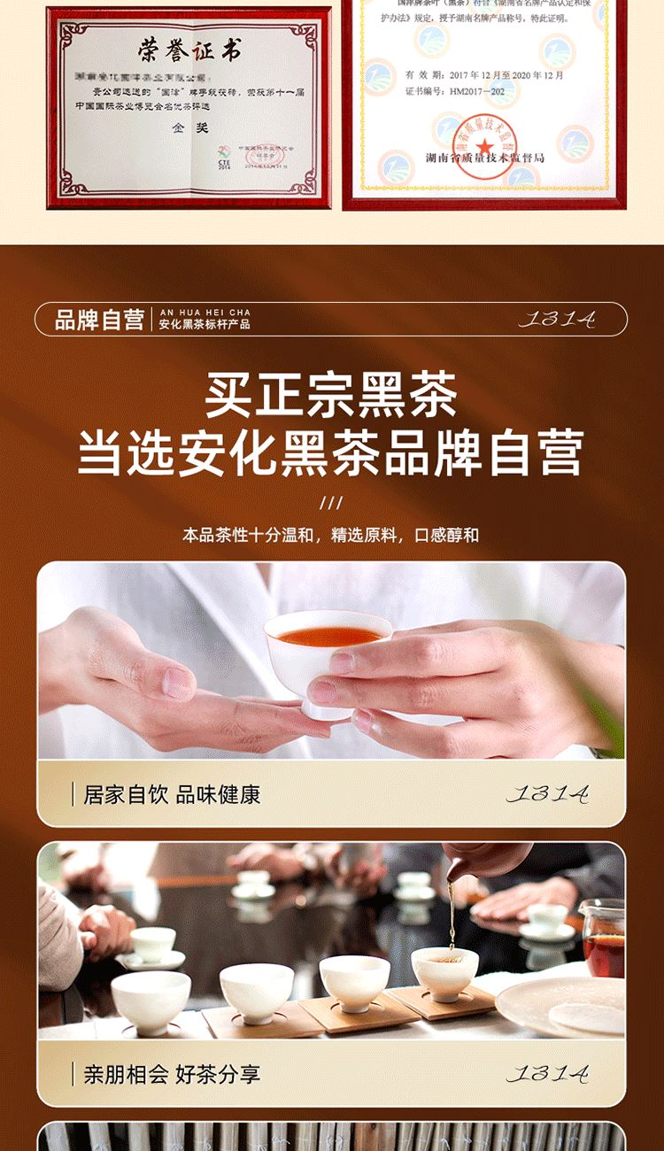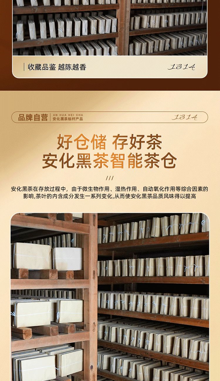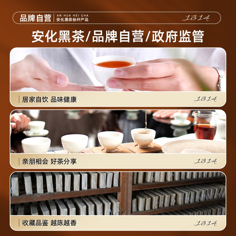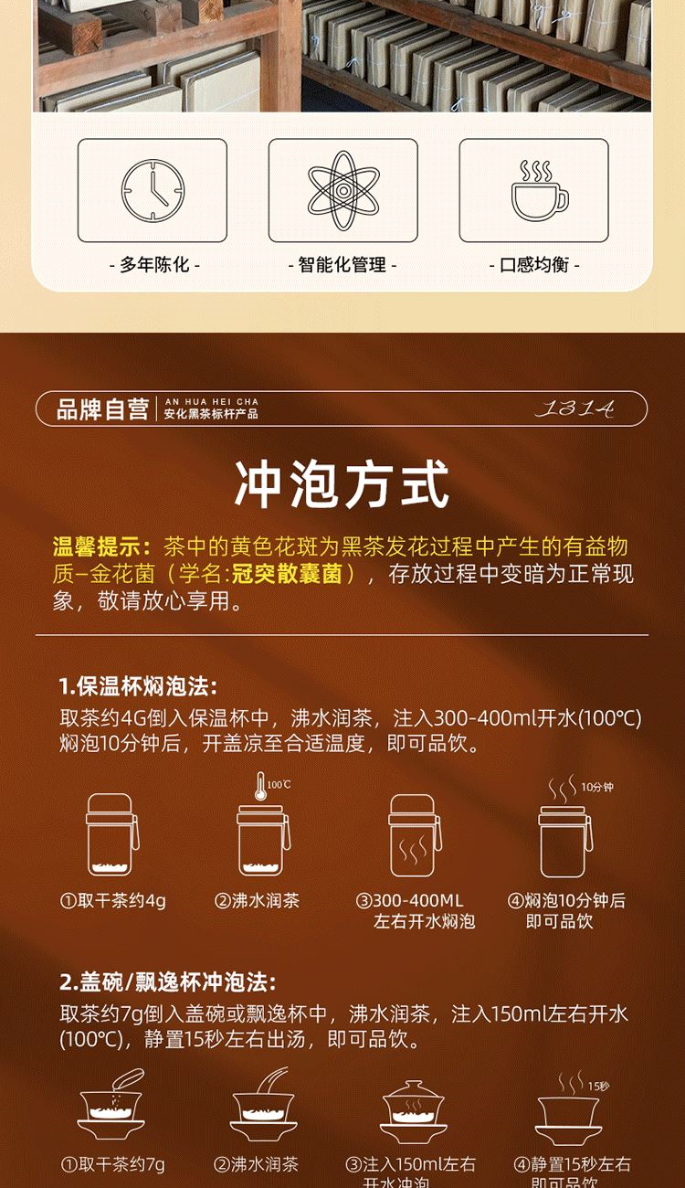 保质期:长期储存 类别:茯砖 包装形式:礼盒装 包装清单:茯砖88g*1,千两88g*1,黑砖88g*1, 天尖56g*1 储存方法:防潮 干燥 防异味 采摘要求:一芽两叶 一芽三叶 一芽四叶 卖点: 1、源自安化黑茶核心产区生态茶园,平均海拔800米以上,自然环境优,适合茶树生长。 2、陈年老料,香气浓厚,滋味醇正,经久耐泡。 3、一盒品鉴4种安化代表黑茶 ①千两:14年安化九龙池老料,由非遗传统工艺压制而成,金花密布,菌香浓郁,内含物质丰富,口感醇正甘润,药香; ②天尖:14年安化云台山陈年老料,叶底匀整成型,药香/参香,显茶韵,浓香耐泡,醇厚滑爽。 ③黑砖:13年安化核心产区陈年老料,含适量细嫩茶梗,入口爽滑回甘,适口性强; ④茯砖:13年安化芙蓉山老料,木仓自然陈化,叶片油润,金花密布,菌香浓郁,滋味醇正滑爽,有回甘; 4、寓意“一生一世”吉祥美好。 5、独立小袋装,即开即饮,便携耐泡,旅行陪伴,美味随享。