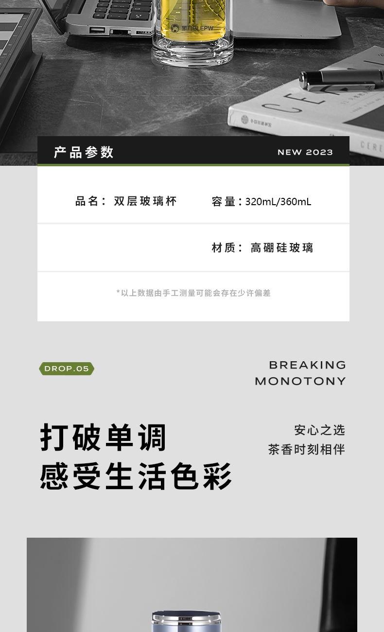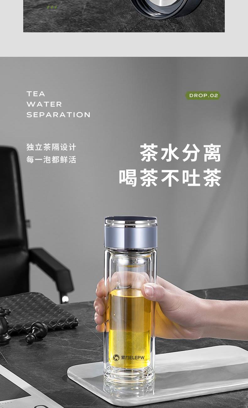 容量:320ml 颜色:金色 灰色 蓝色 材质: 304不锈钢提篮滤网,喝茶不吐叶。 不锈钢杯盖,商务外观,更适合定制。 双层高透亮高硼硅玻璃材质,耐急速瞬间温差。 杯体一体成型,手工加厚烧制,稳重耐用。 包装:单瓦盒