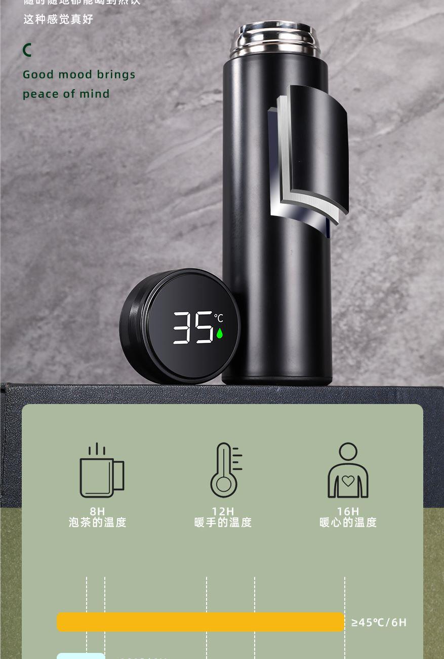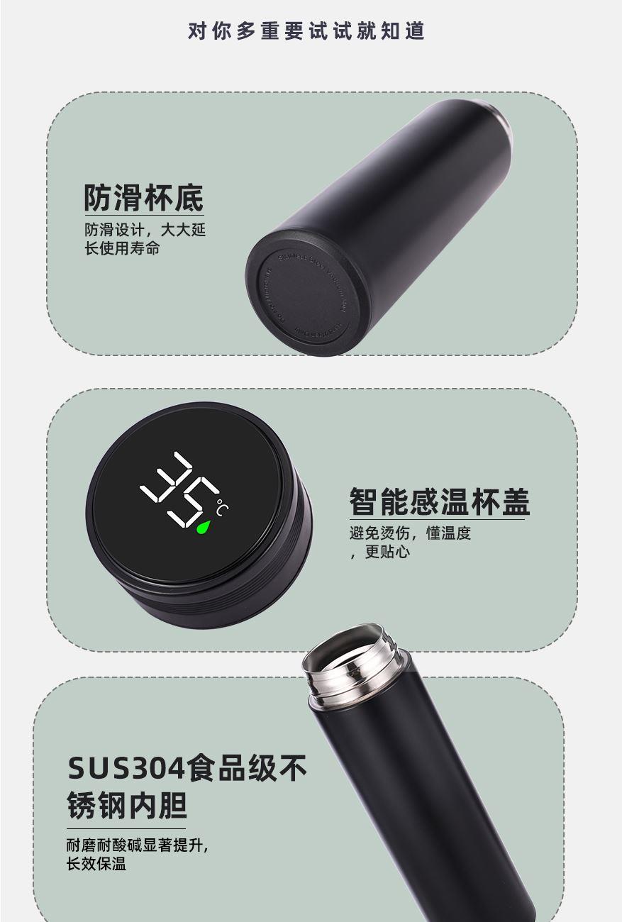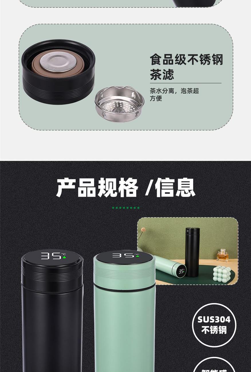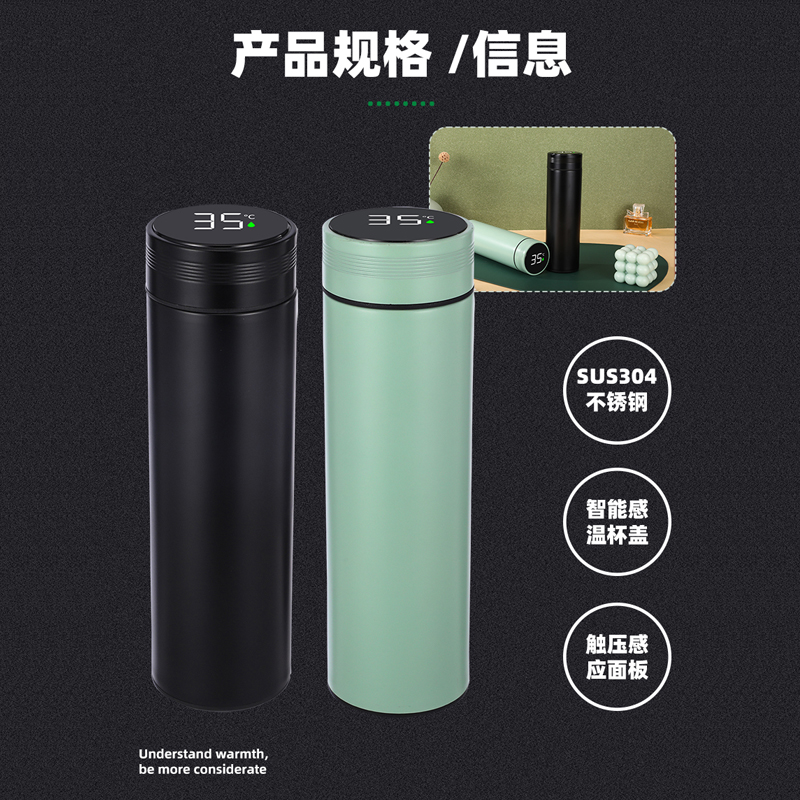 颜 色:黑色(绿色定制) 材 质:内胆SUS304/杯盖:食品级PP(聚丙烯)、硅胶 (食品接触用) 容 量:500ml 彩盒尺寸:6.7*6.7*23cm 1、采用优质SUS304食品级不锈钢内胆,耐磨耐酸碱显著提升,使用寿命提升的同时还能长效保温; 2、智能感温杯盖,告别嘴唇试温,避免烫伤,懂温度,更贴心 ; 3、LED显示屏,触压感应面板,大容量电池,无需充电。