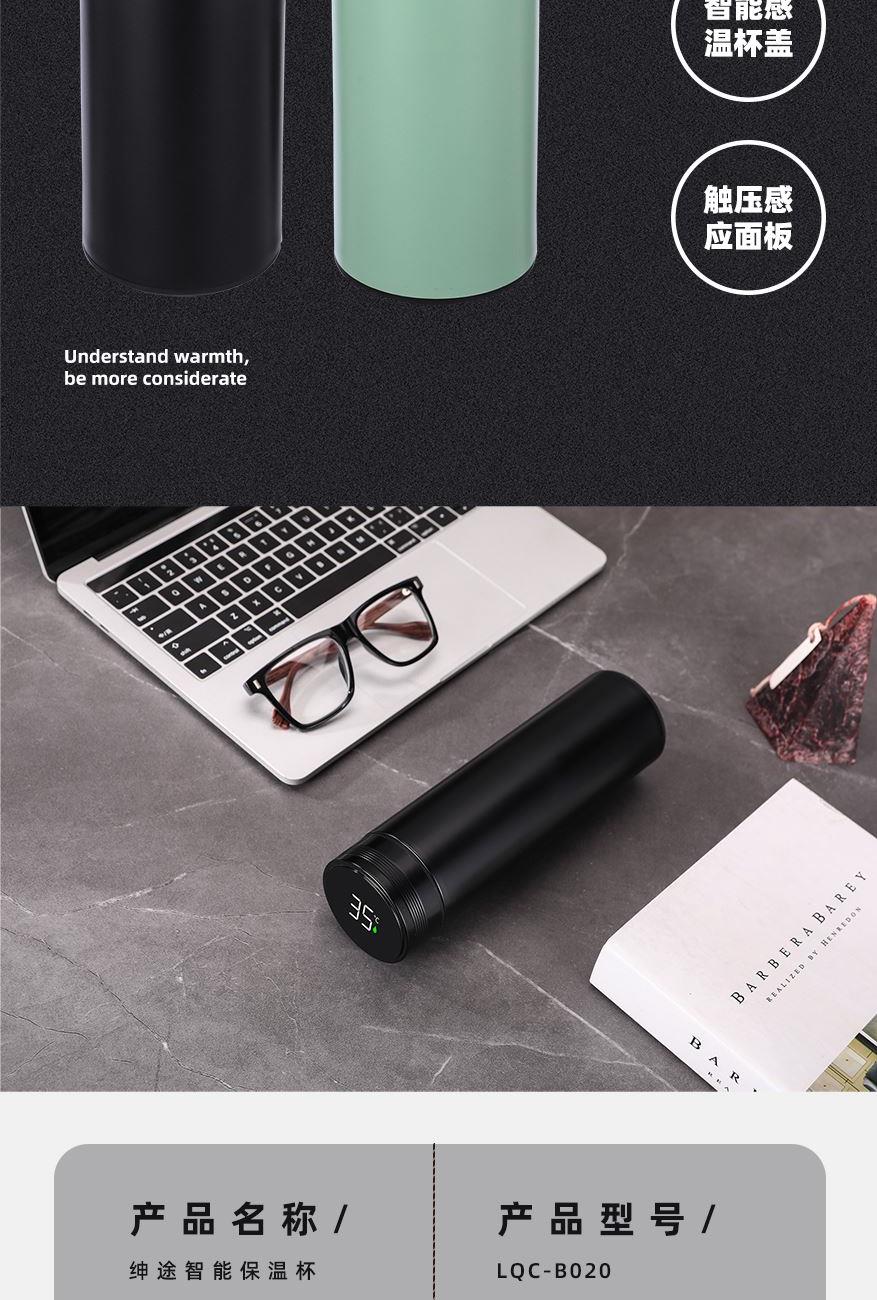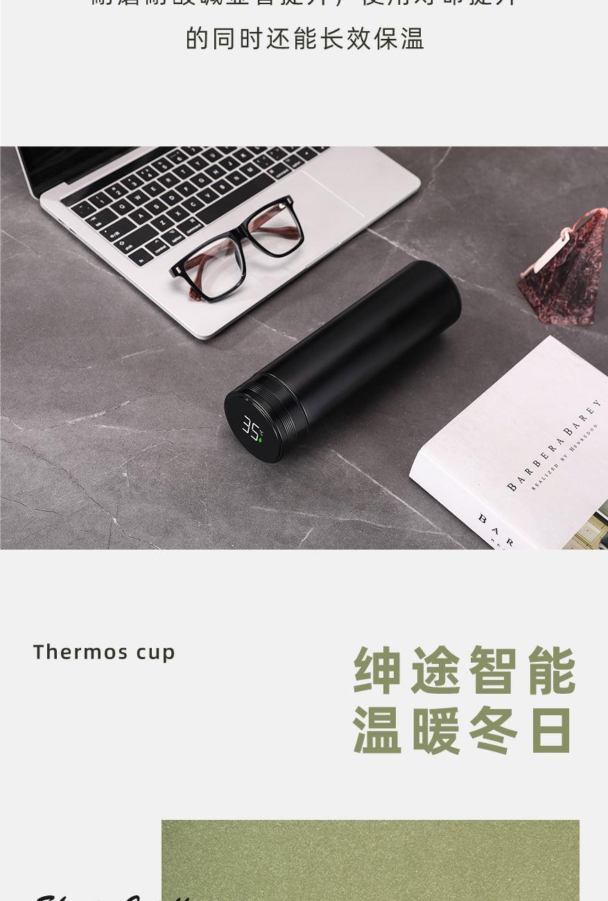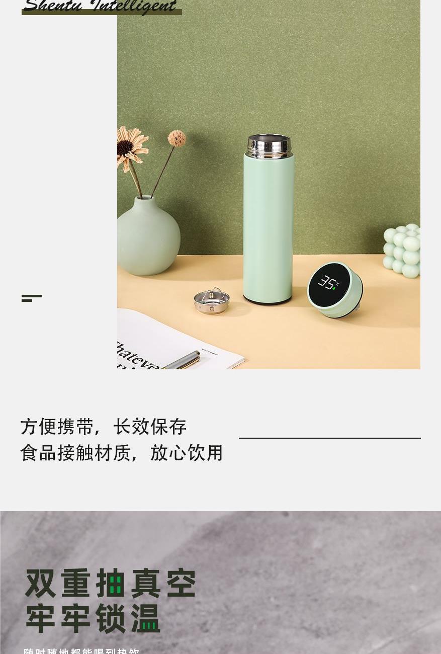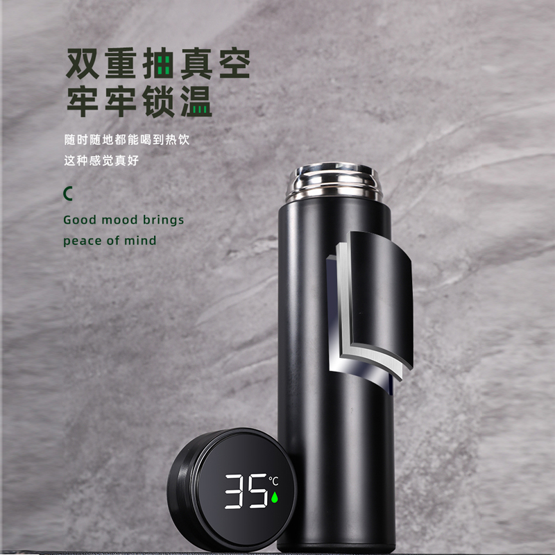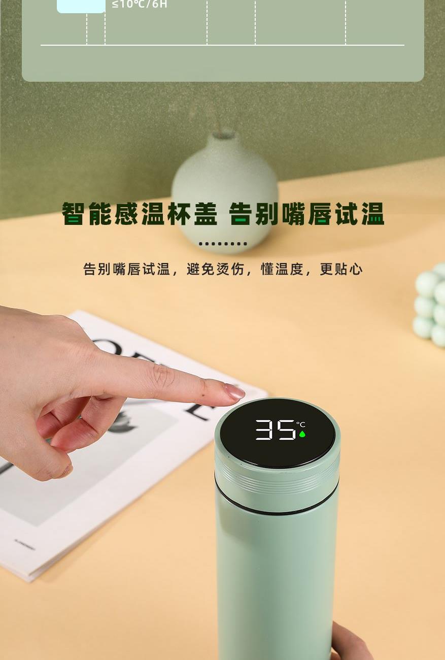 颜 色:黑色(绿色定制) 材 质:内胆SUS304/杯盖:食品级PP(聚丙烯)、硅胶 (食品接触用) 容 量:500ml 彩盒尺寸:6.7*6.7*23cm 1、采用优质SUS304食品级不锈钢内胆,耐磨耐酸碱显著提升,使用寿命提升的同时还能长效保温; 2、智能感温杯盖,告别嘴唇试温,避免烫伤,懂温度,更贴心 ; 3、LED显示屏,触压感应面板,大容量电池,无需充电。