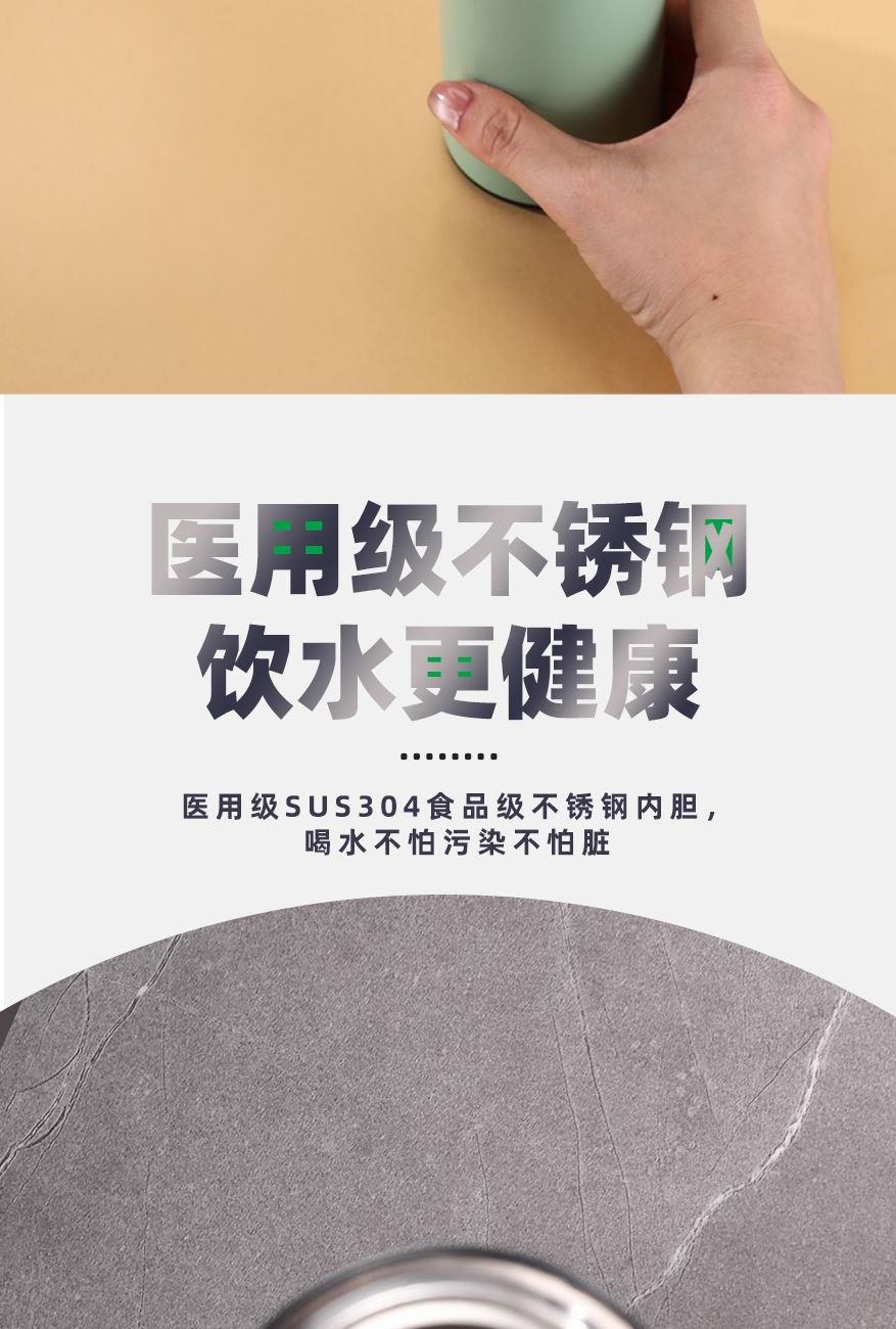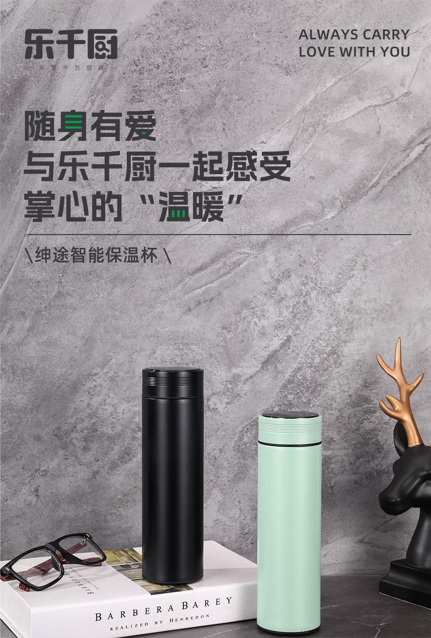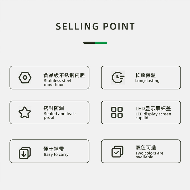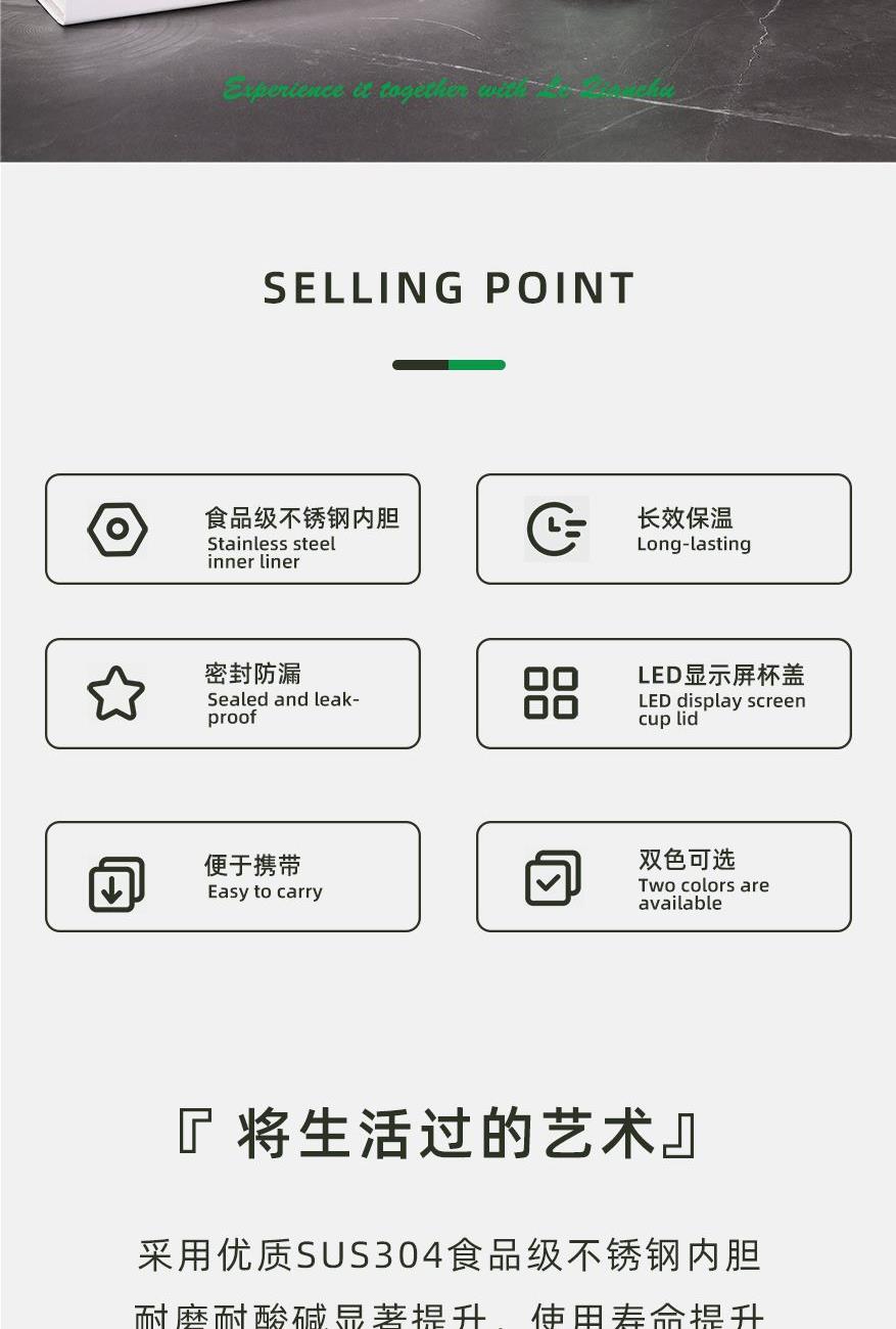 颜 色:黑色(绿色定制) 材 质:内胆SUS304/杯盖:食品级PP(聚丙烯)、硅胶 (食品接触用) 容 量:500ml 彩盒尺寸:6.7*6.7*23cm 1、采用优质SUS304食品级不锈钢内胆,耐磨耐酸碱显著提升,使用寿命提升的同时还能长效保温; 2、智能感温杯盖,告别嘴唇试温,避免烫伤,懂温度,更贴心 ; 3、LED显示屏,触压感应面板,大容量电池,无需充电。