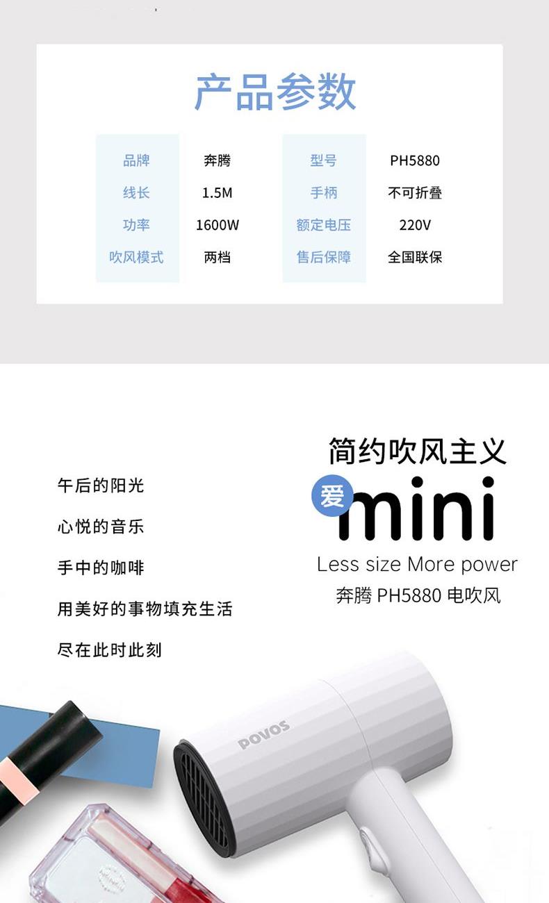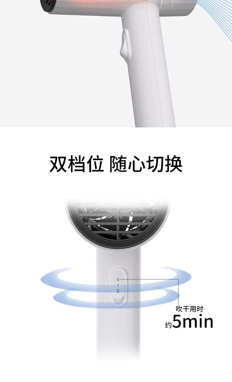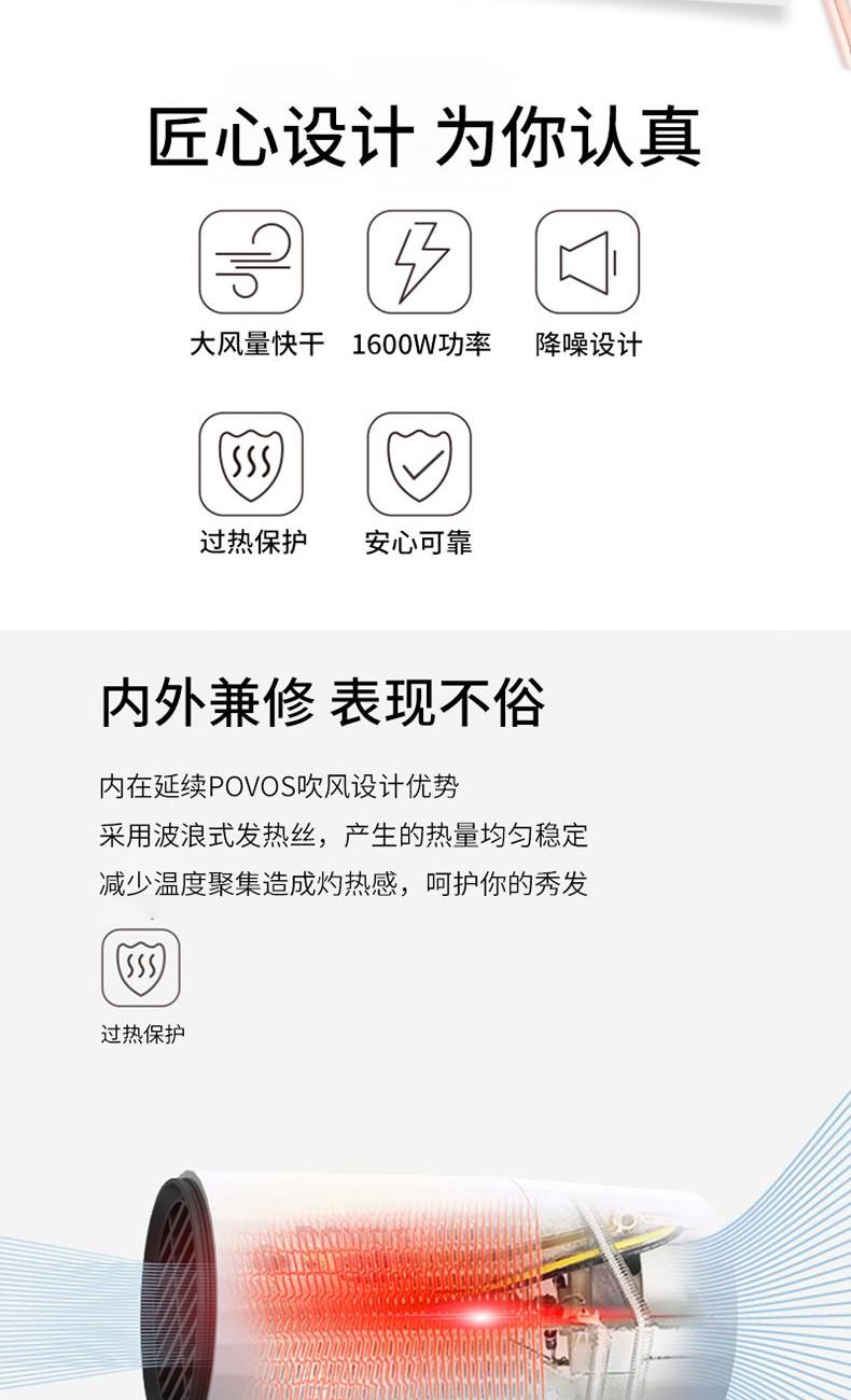 "1、二档吹风模式; 2、低噪音,大风量; 3、热量均衡系统; 4、防护式进风口; 5、便携式设计; 6、功率:1600W。 "