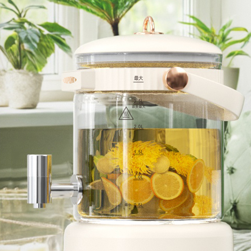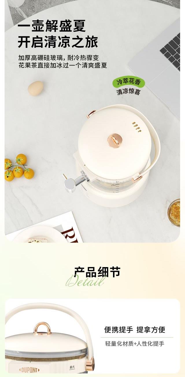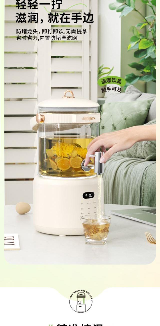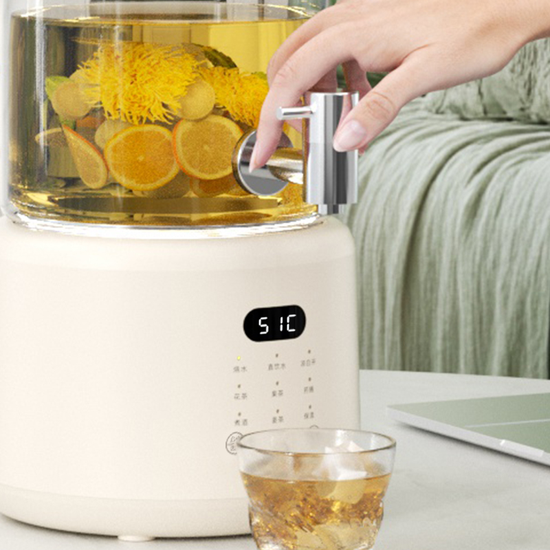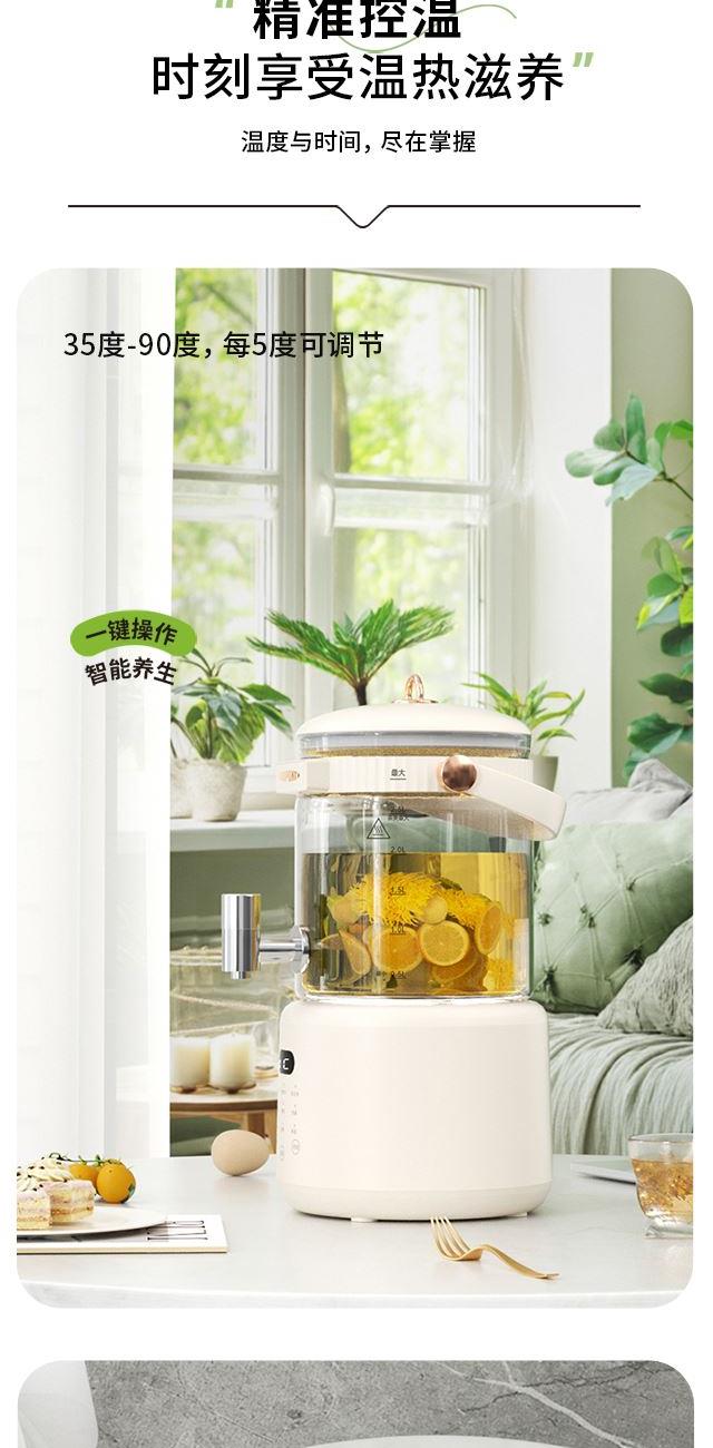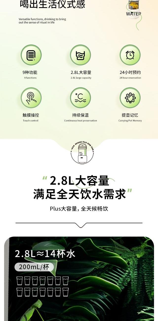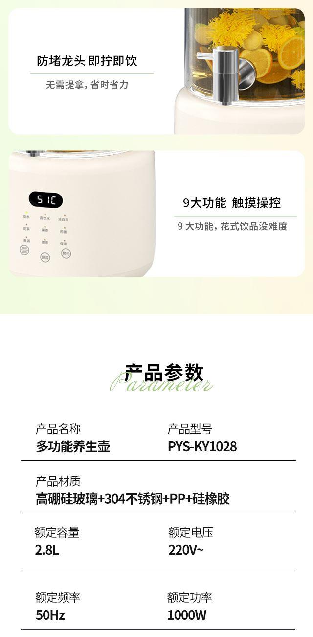 产 品 材 质:高硼硅玻璃+304不锈钢+ PP+硅橡胶 额 定 容 量:2.8L 额 定 电 压:220V~ 额 定 频 率:50Hz 额 定 功 率:1000W 产 品 净 重:1.62kg 产 品 毛 重:2.2kg 产 品 尺 寸:160*180*360mm 包 装 尺 寸:385*230*270mm 外 箱 尺 寸:480*400*560mm 装 箱 数:4台/箱 一机多用,调奶恒温壶\养生壶\煮茶器\花茶桶,2.8L大容量,1000W大功率,片刻即享醇香热饮。 · 防堵龙头,即拧即饮,无需提拿,省时省力,内置防堵塞滤网。 35度-90度,每5度可调节,加热至目标温度后,持续沸腾5分钟,按压保温键恒温24小时,每一口都安心。 9 大功能,花式饮品没难度,触摸操控,智能预约长达24小时,简单易操作。 304不锈钢茶漏,轻松滤渣,畅快吃喝。 加厚高硼硅玻璃,耐冷热骤变,花果茶直接加冰过一个清爽盛夏。 分体设计,提放清洗无限制,底座分离设计,方便移动和使用。 240S提壶记忆,自动记忆提壶前水温,放回后无需重设。