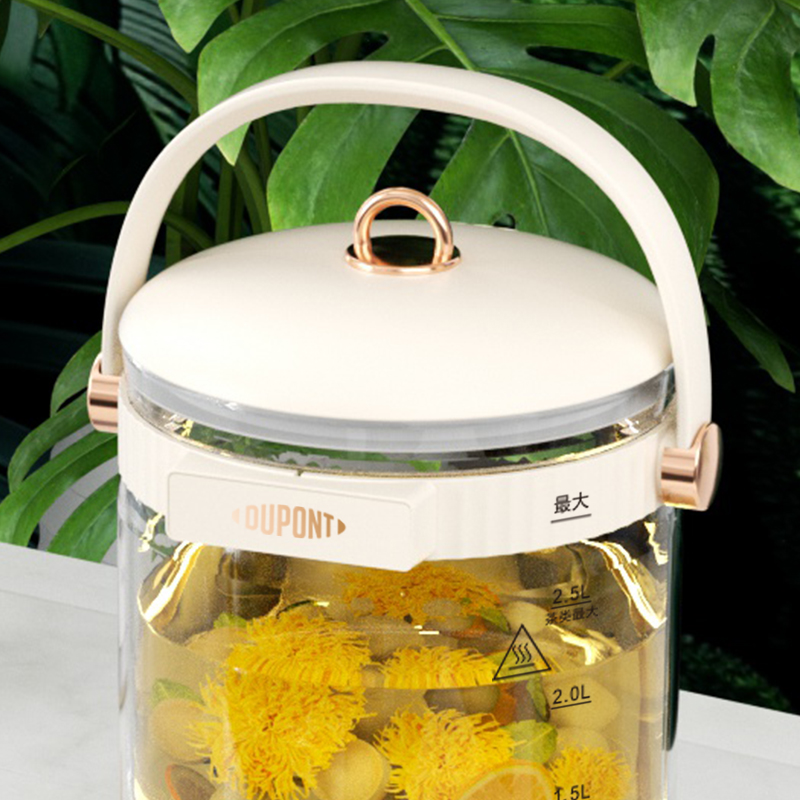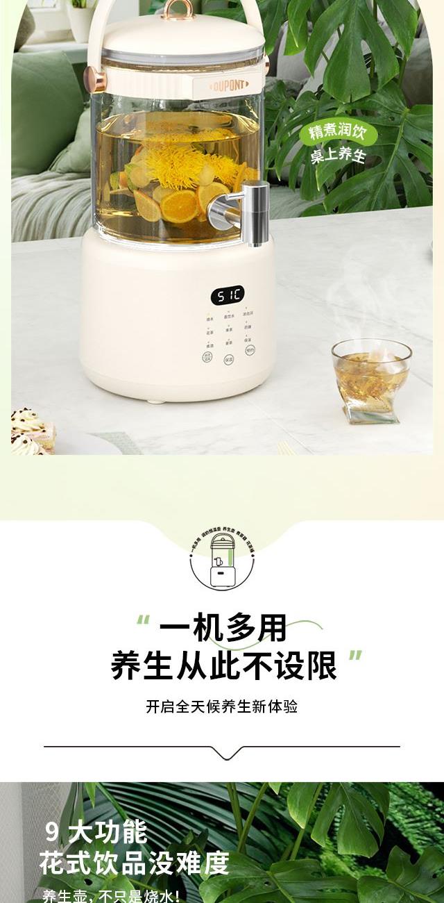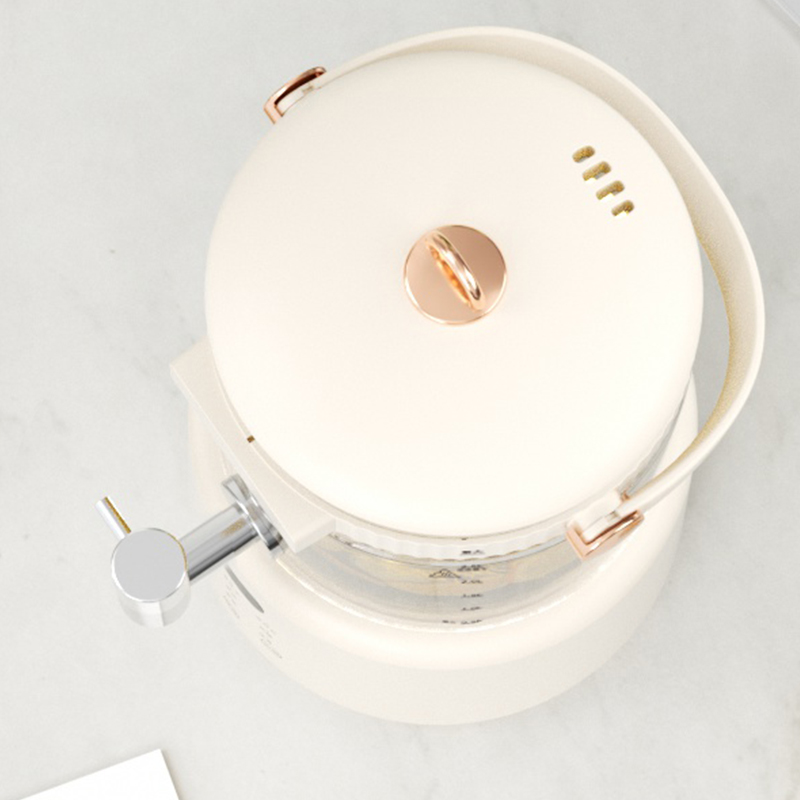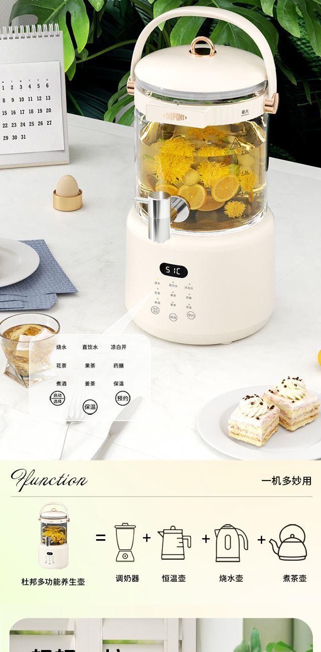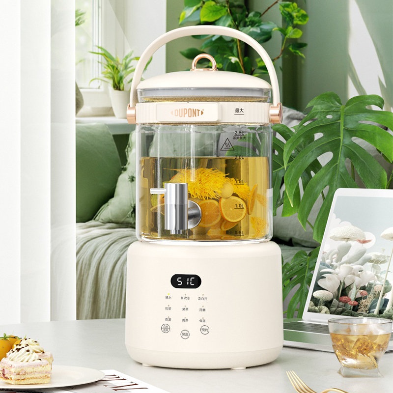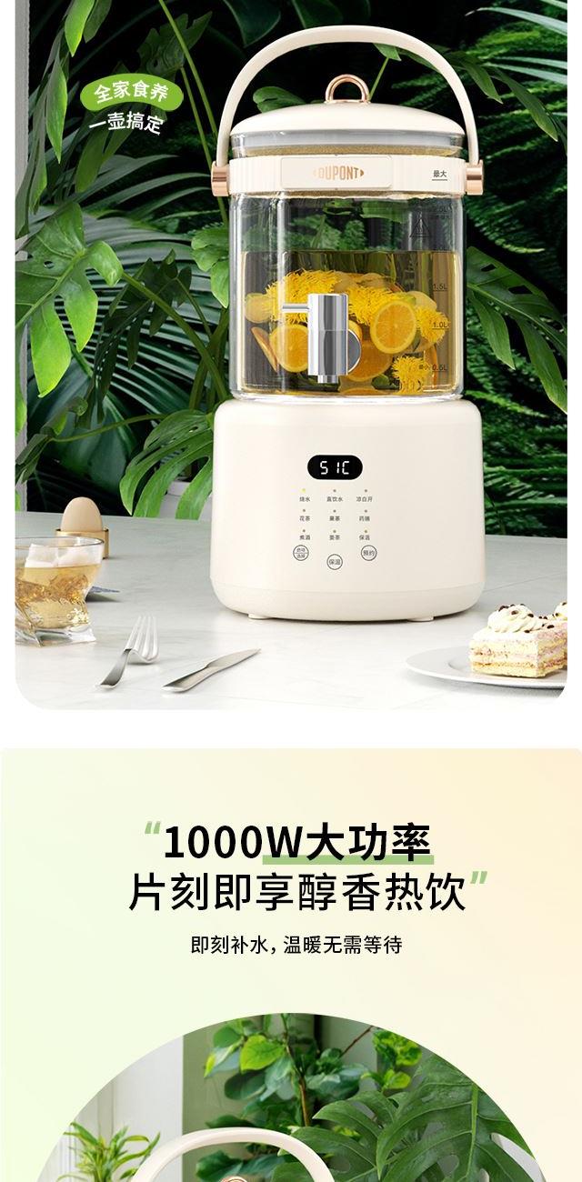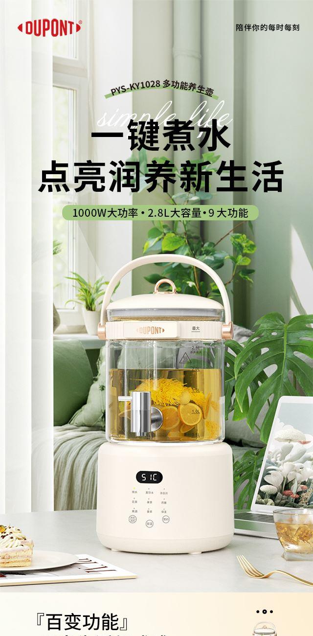 产 品 材 质:高硼硅玻璃+304不锈钢+ PP+硅橡胶 额 定 容 量:2.8L 额 定 电 压:220V~ 额 定 频 率:50Hz 额 定 功 率:1000W 产 品 净 重:1.62kg 产 品 毛 重:2.2kg 产 品 尺 寸:160*180*360mm 包 装 尺 寸:385*230*270mm 外 箱 尺 寸:480*400*560mm 装 箱 数:4台/箱 一机多用,调奶恒温壶\养生壶\煮茶器\花茶桶,2.8L大容量,1000W大功率,片刻即享醇香热饮。 · 防堵龙头,即拧即饮,无需提拿,省时省力,内置防堵塞滤网。 35度-90度,每5度可调节,加热至目标温度后,持续沸腾5分钟,按压保温键恒温24小时,每一口都安心。 9 大功能,花式饮品没难度,触摸操控,智能预约长达24小时,简单易操作。 304不锈钢茶漏,轻松滤渣,畅快吃喝。 加厚高硼硅玻璃,耐冷热骤变,花果茶直接加冰过一个清爽盛夏。 分体设计,提放清洗无限制,底座分离设计,方便移动和使用。 240S提壶记忆,自动记忆提壶前水温,放回后无需重设。