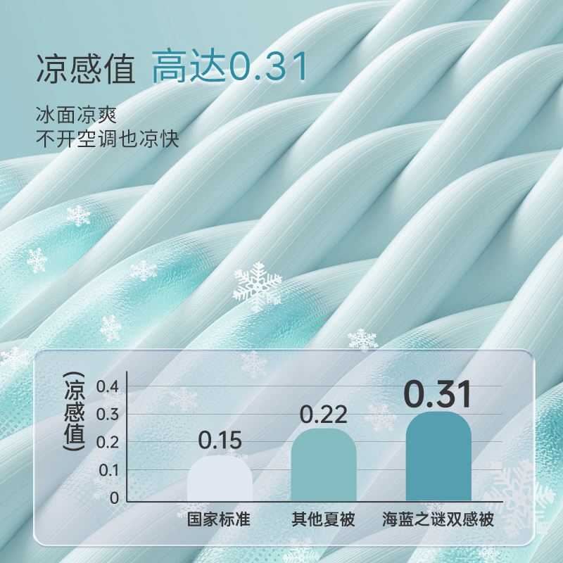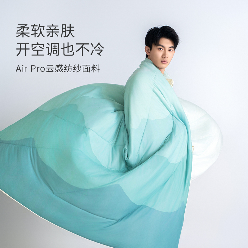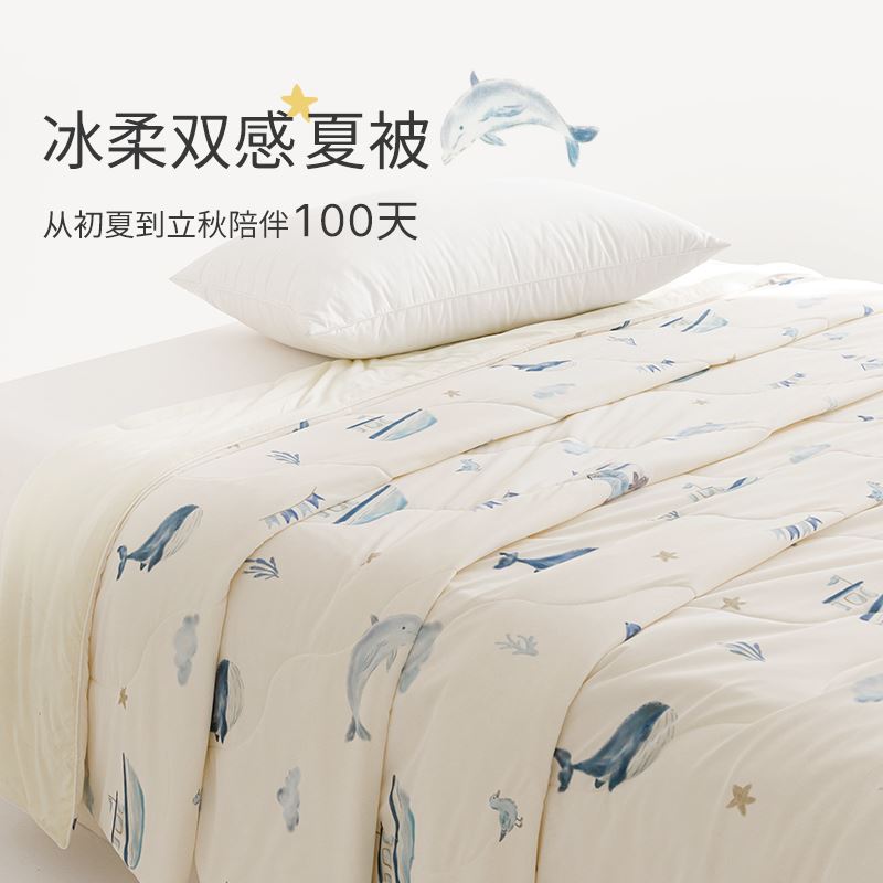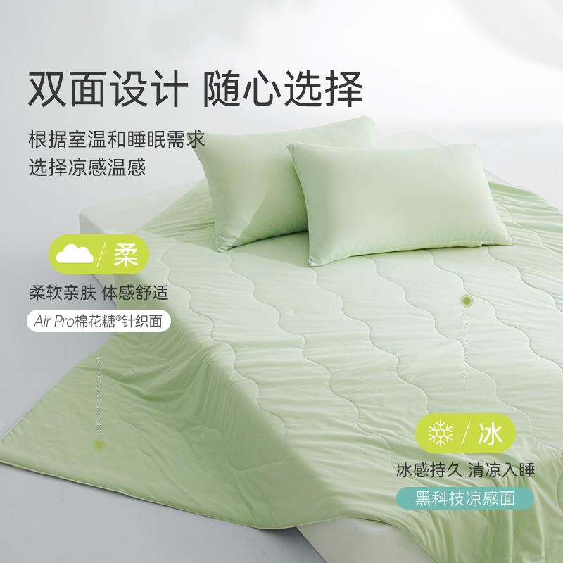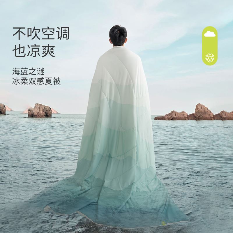 面料A: 95%聚酯纤维(云倍尔科技纤维)+5%氨纶 面料B:95%锦纶+5%氨纶 规格:200*230cm 填充:聚酯纤维 填充重量:600g 花色:海蓝之谜、薄荷慢波、小海豚 双重体感 冰&柔随心 AB双面双材质设计 A面云感面 采用“云感纺纱技术”棉的3倍柔软。 B面是采用cool霜感纤维高冰面,其中含有高比例的凉感纤维,这些纤维均匀分布在面料之中,构建起独特的散热结构。 接触瞬间,能快速带走体表热量更亲肤 更贴合 更好眠 更柔软 更清凉