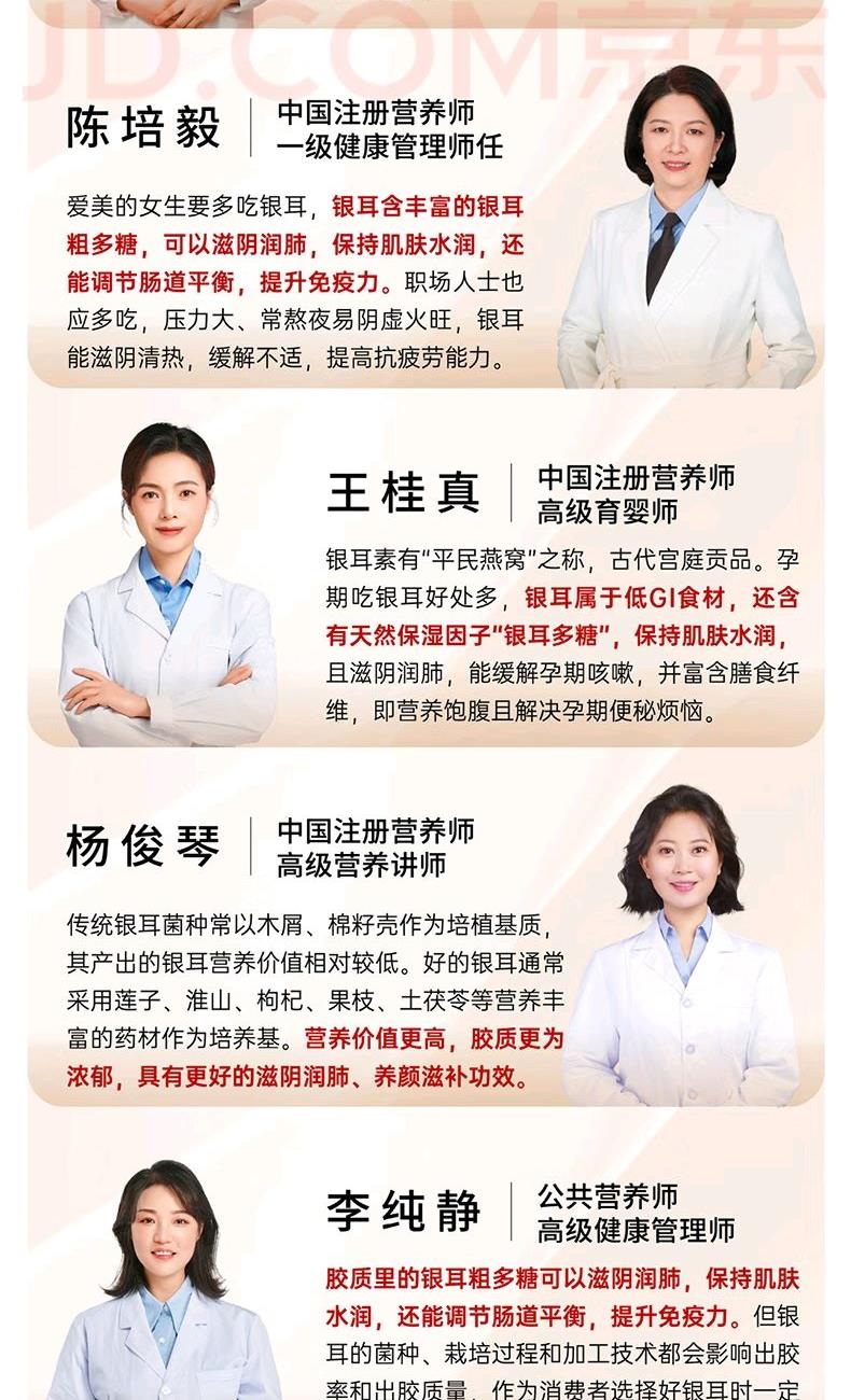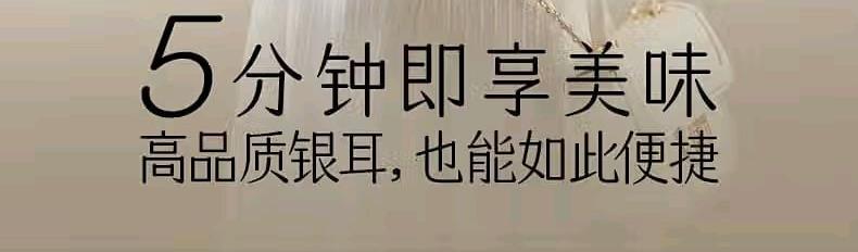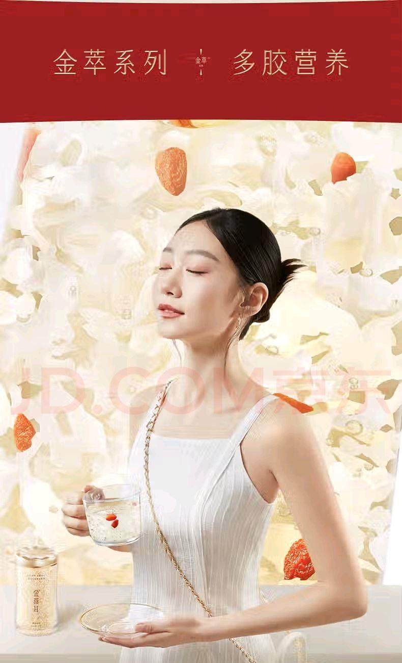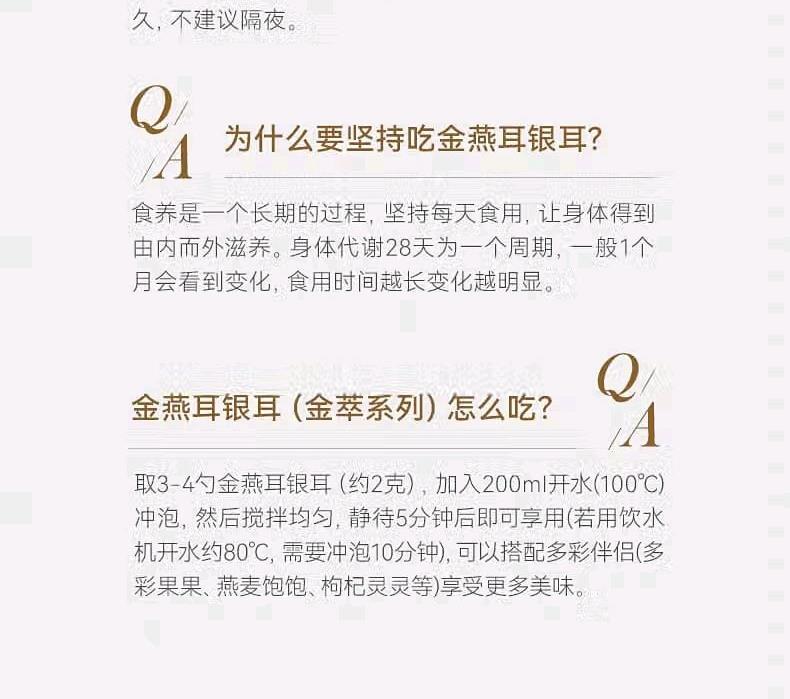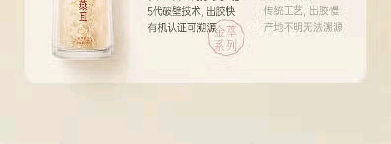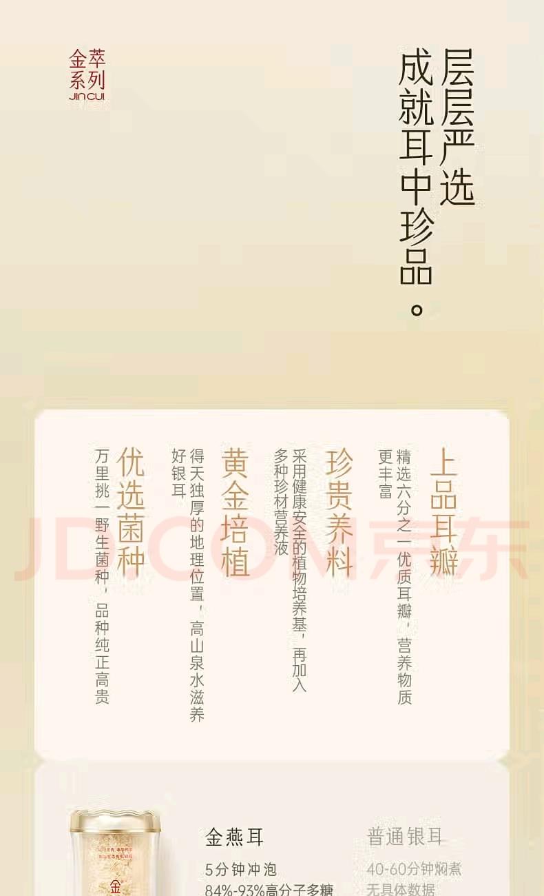 配置: 有机金萃银耳 30g*4瓶、红色礼袋*1个 净含量:120g 推荐理由: 5分钟冲泡, 84%-93%高分子多糖5代破壁技术,出胶快有机认证可溯源