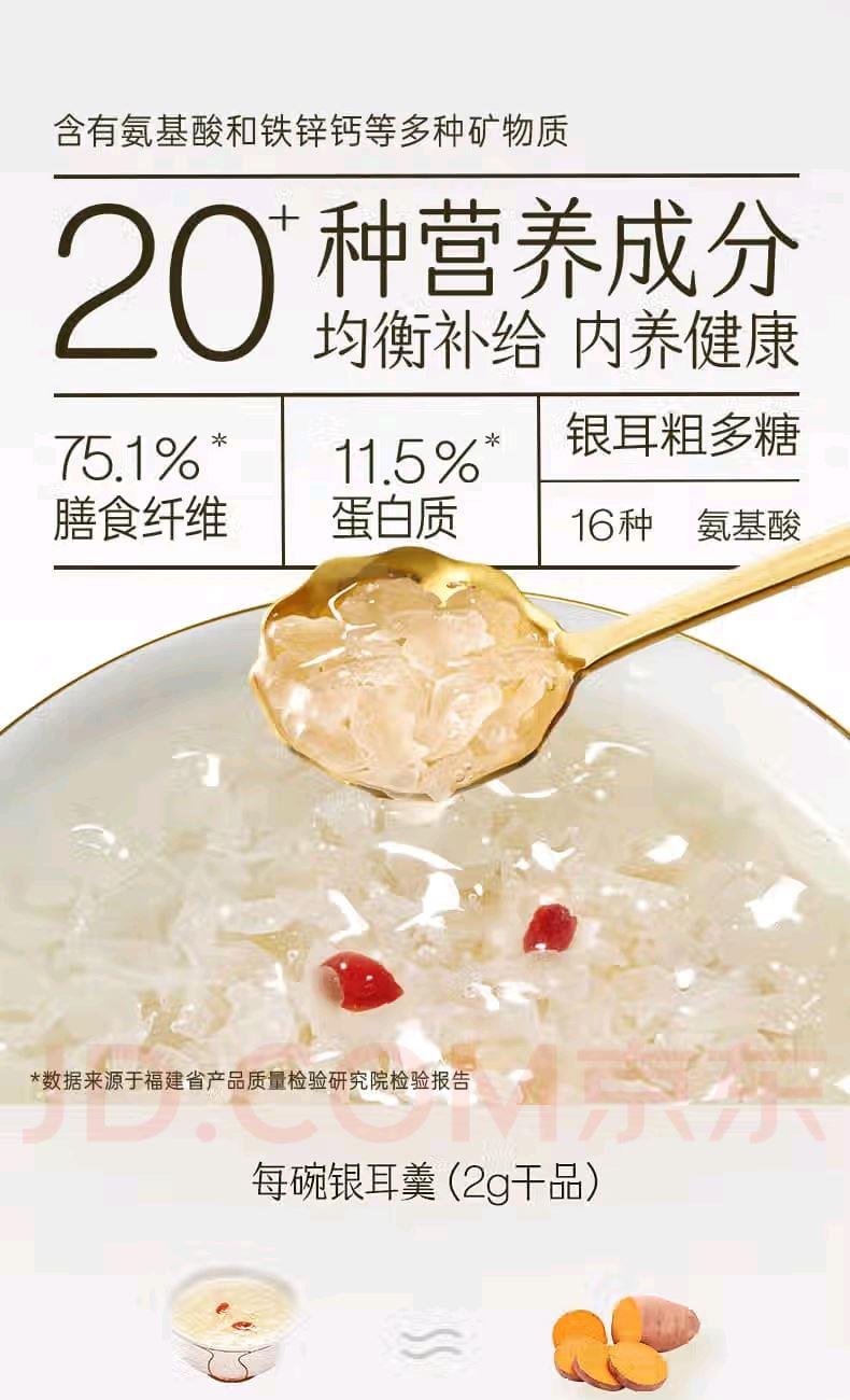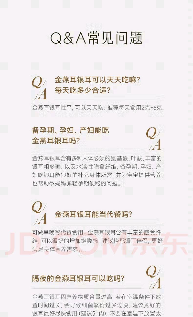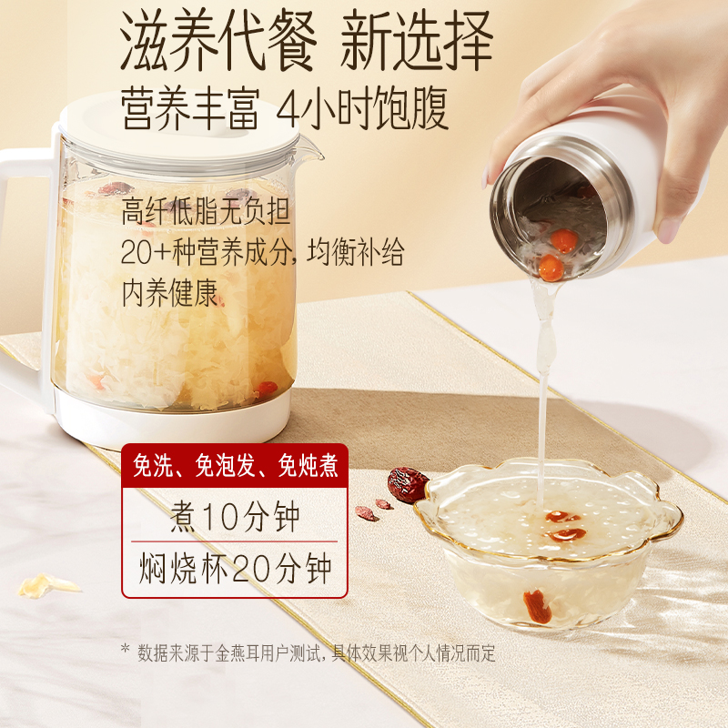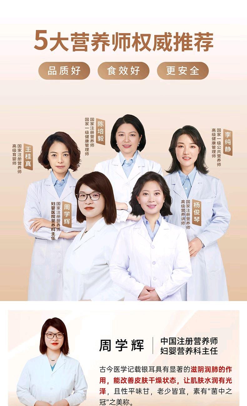 配置: 有机金萃银耳 30g*4瓶、红色礼袋*1个 净含量:120g 推荐理由: 5分钟冲泡, 84%-93%高分子多糖5代破壁技术,出胶快有机认证可溯源