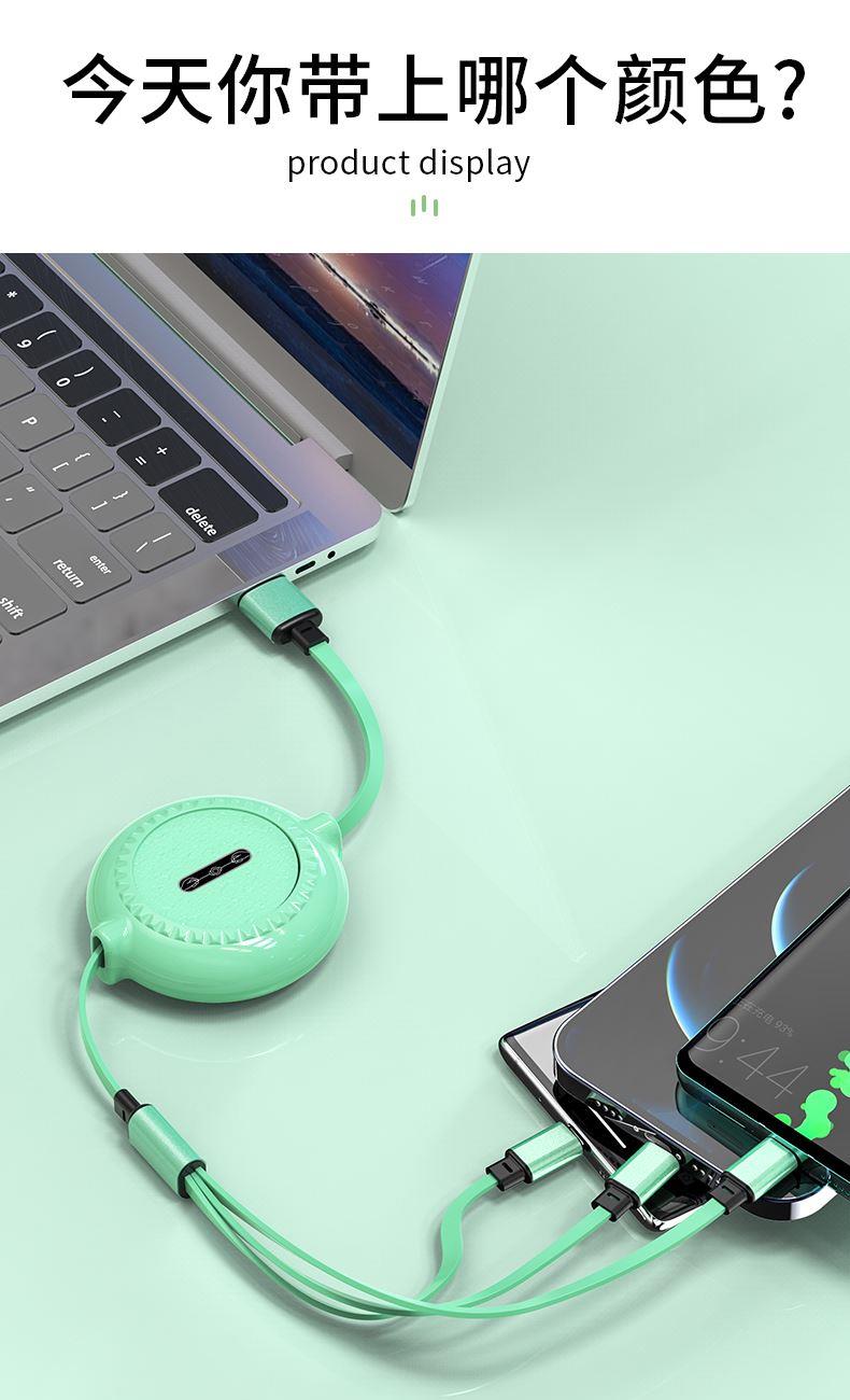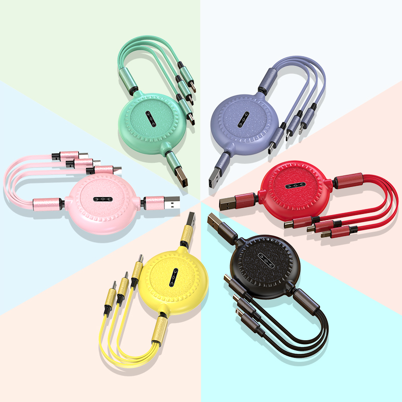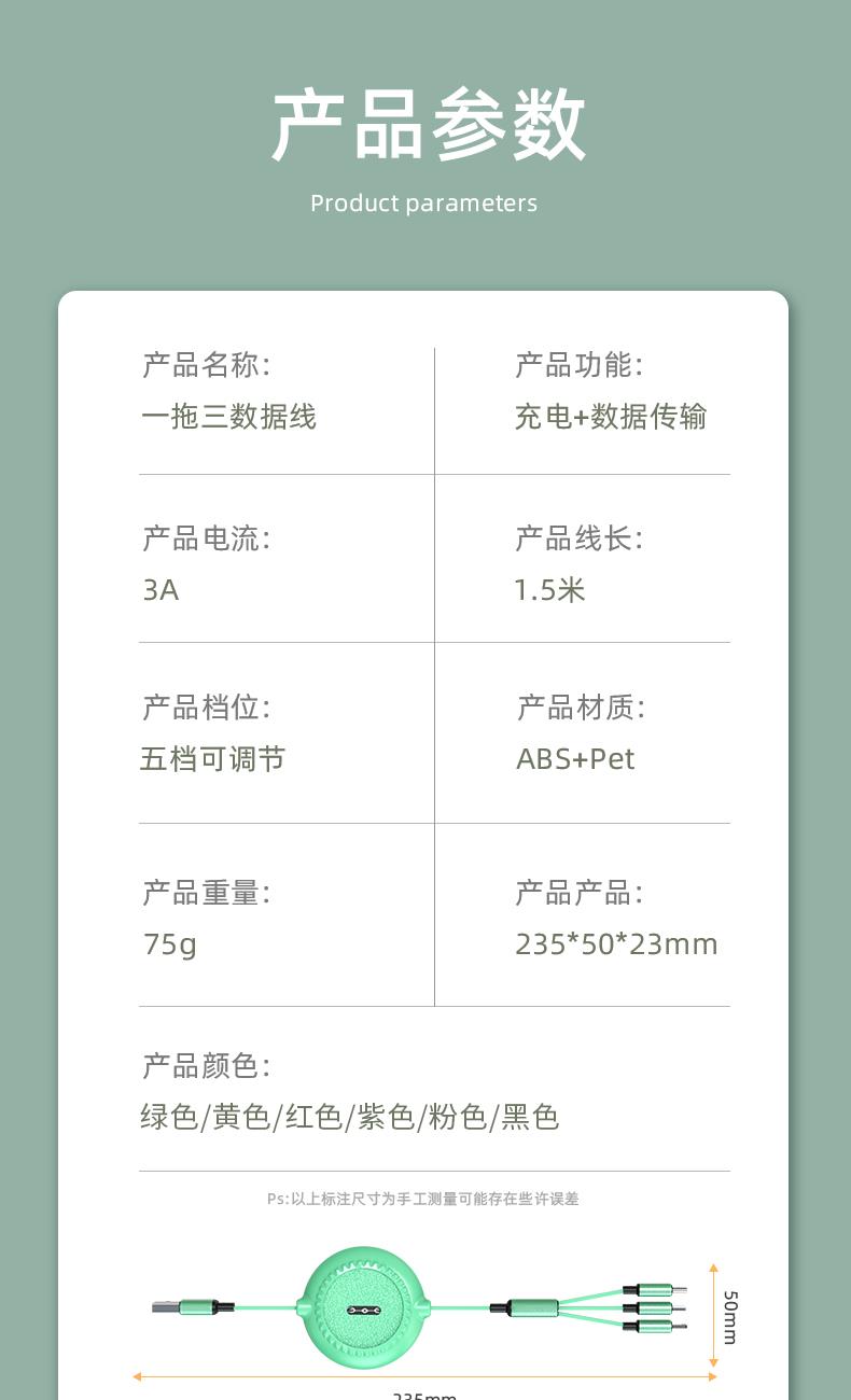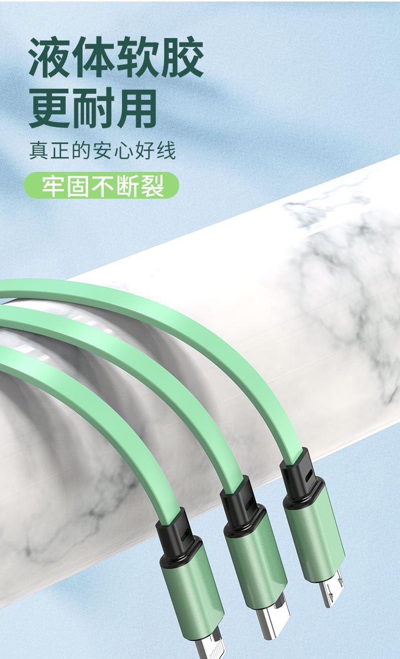 彩虹一拖三数据线 颜色:蓝 粉 绿 黑 红 黄 材质:TPE线 尺寸:1.1M 包装:彩盒包装 【功能特点】: 3A快充数据线,充电更快 三种接口满足各种手机 1.1米长度设计,使用方便 TPE材质耐用,不易折断 马卡龙配色多种选择 五档伸缩调节